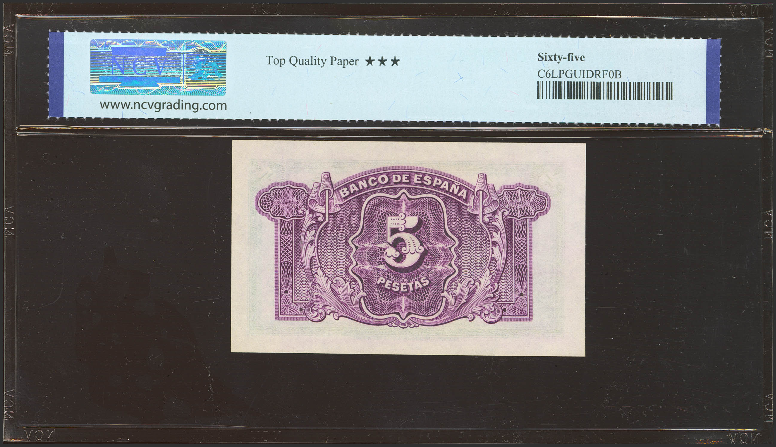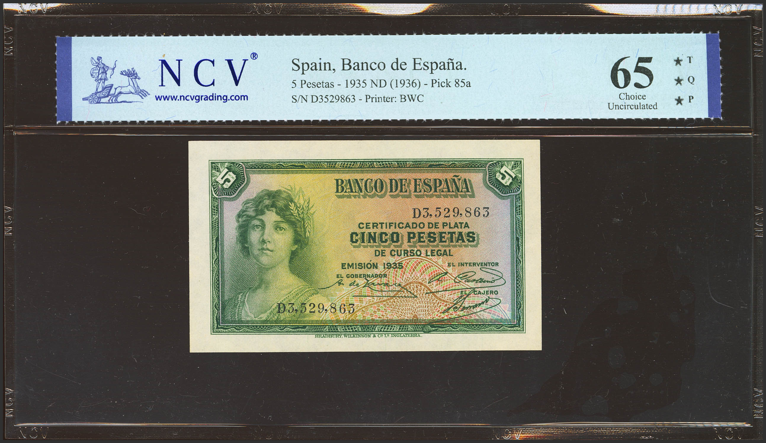 5 Pesetas. 1935. Silver Certificate. Series D. (Edifil 2023: 363a, Pick: 85a). Original marking. Uncirculated. Encapsulated NCV65TQP.