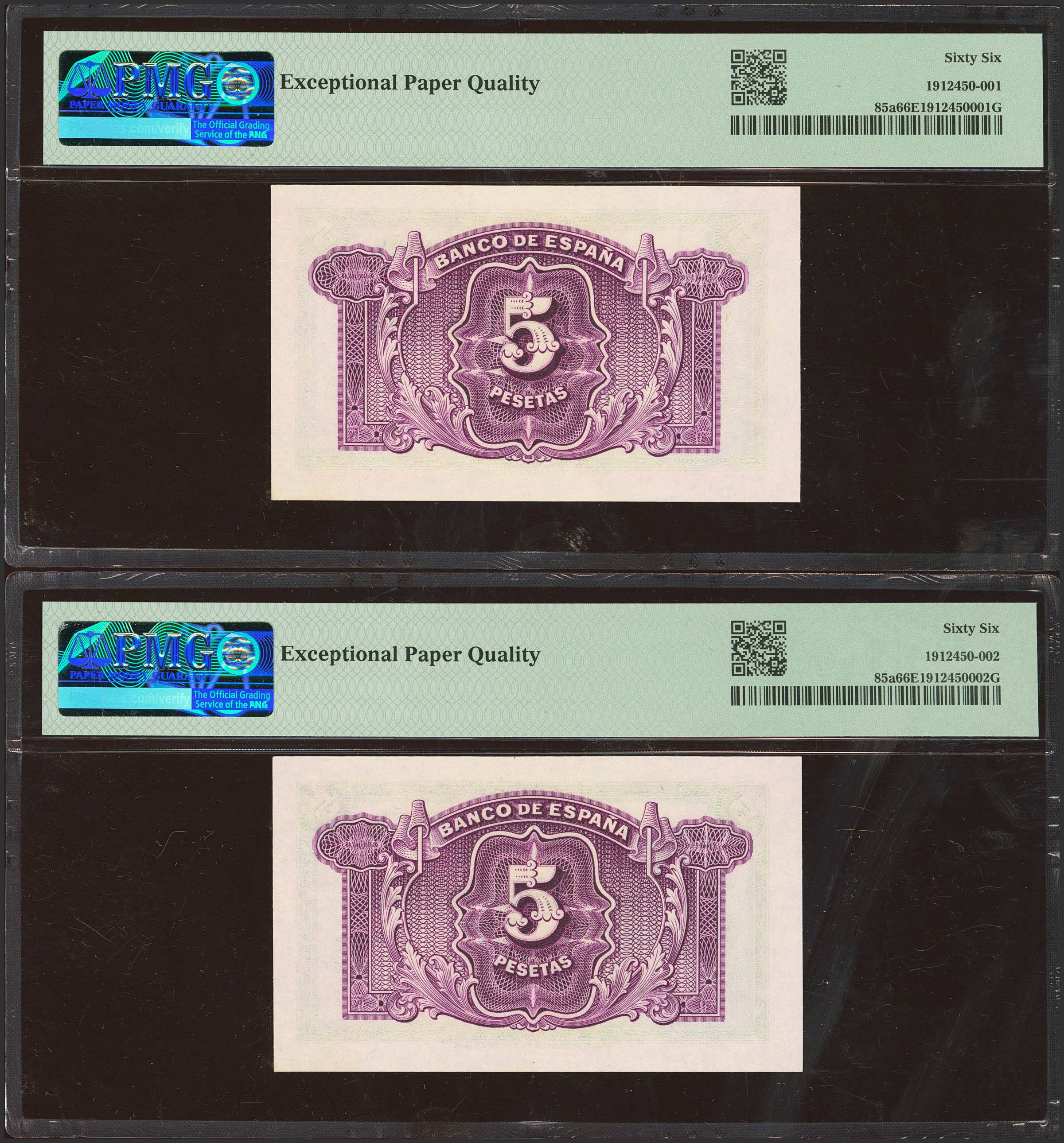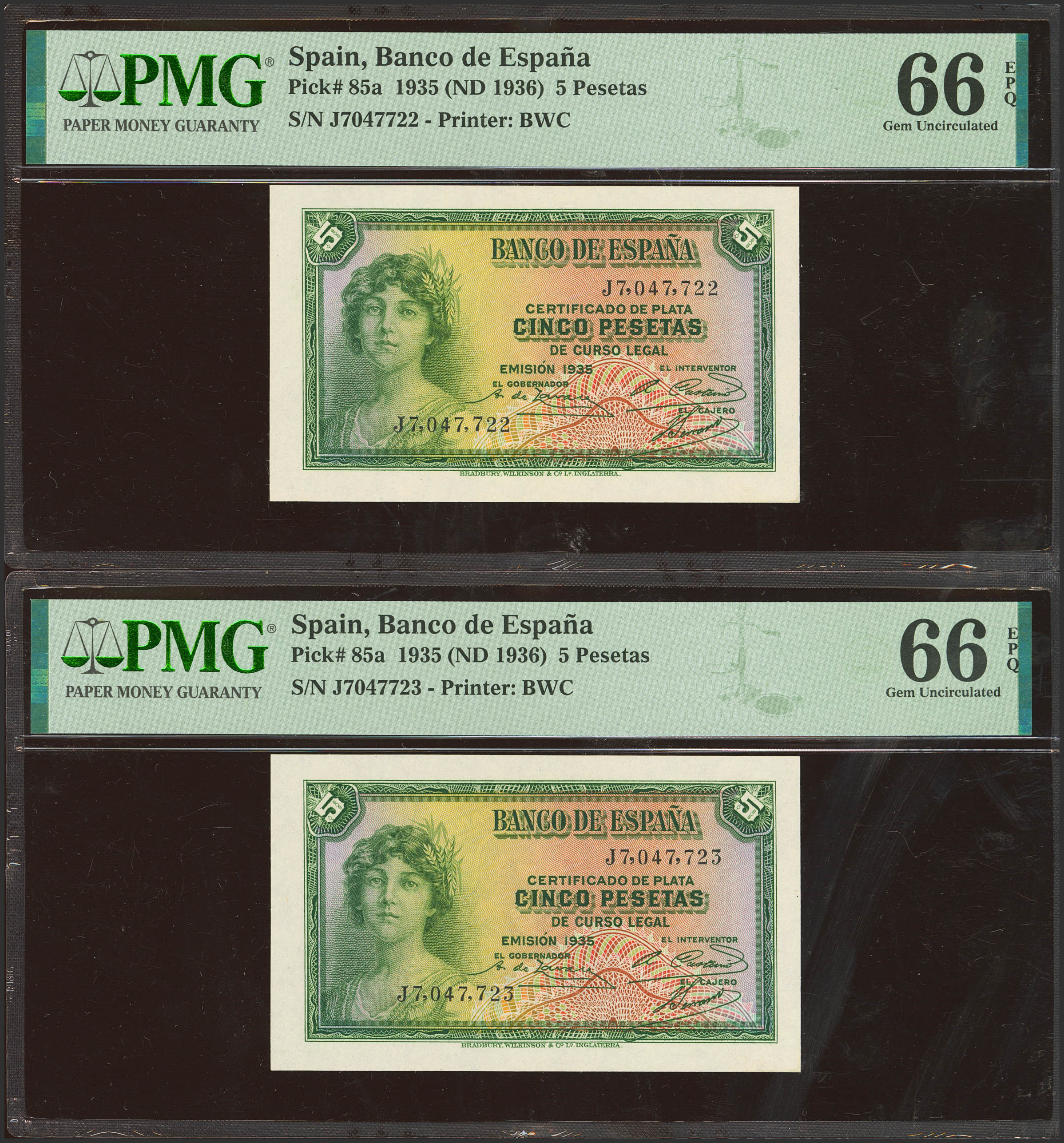 5 Pesetas. 1935. Silver Certificate. Correlative pair. Series J. (Edifil 2023: 363b, Pick: 85a). Unusual in this exceptional quality, original finish. Both encapsulated PMG66EPQ.