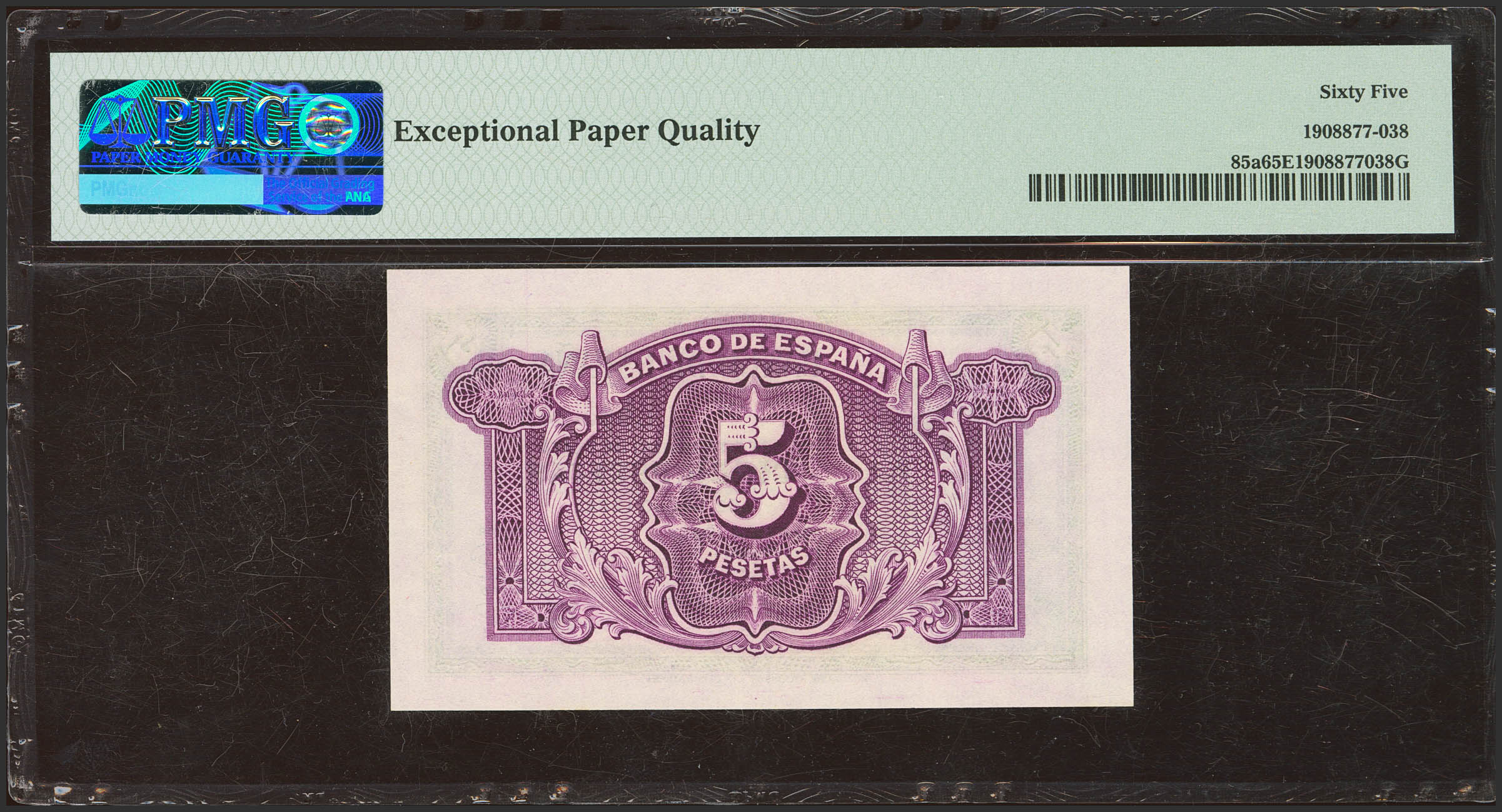 5 Pesetas. 1935. Silver Certificate. Series L, last series issued. (Edifil 2023: 363c, Pick: 85a). Original marking. Uncirculated. Encapsulated PMG65EPQ.