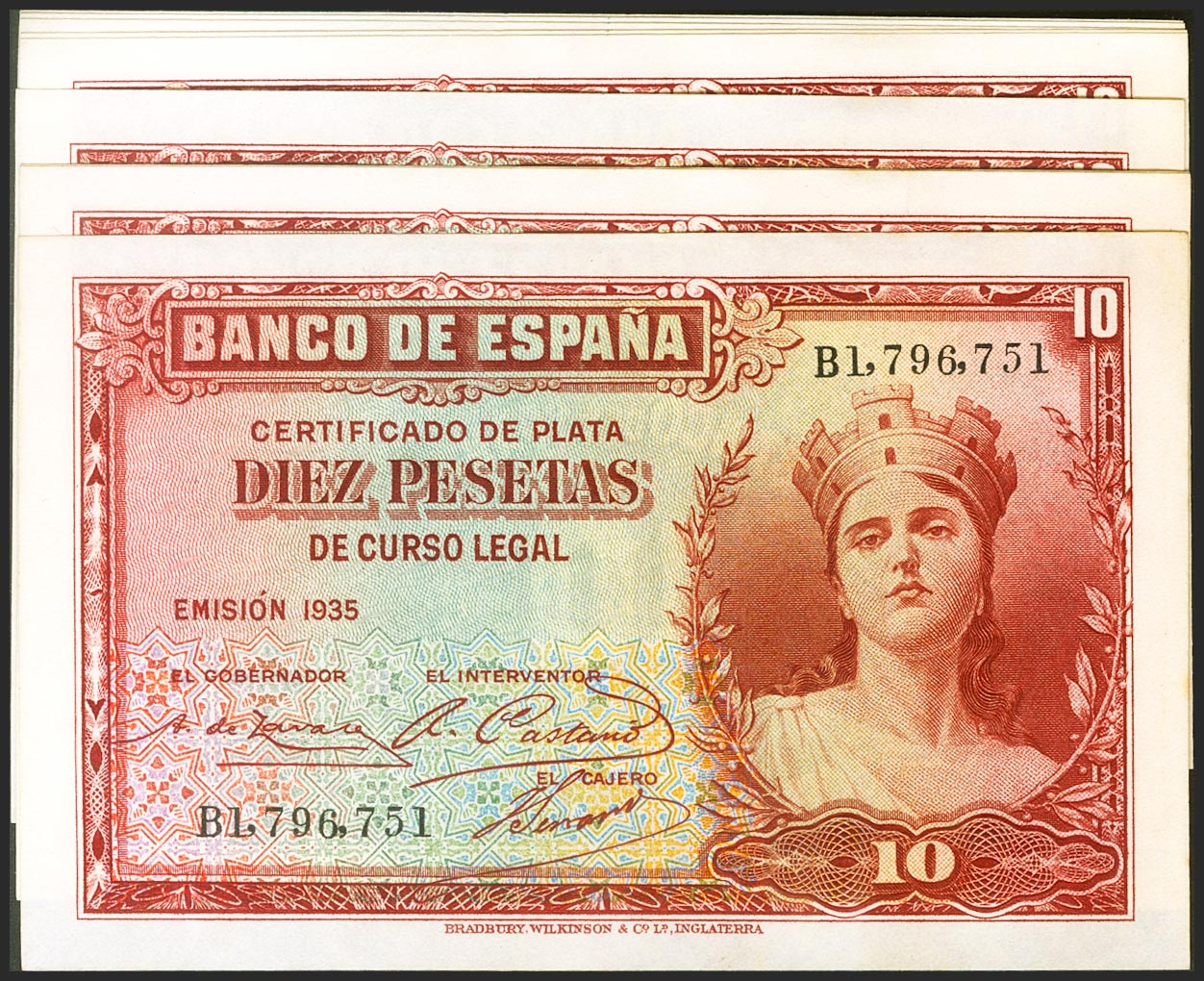 Set of 9 consecutive 10 Pesetas Silver Certificate banknotes issued in 1935 and with series B (Edifil 2021: 364a), preserving all its original finish. Uncirculated.