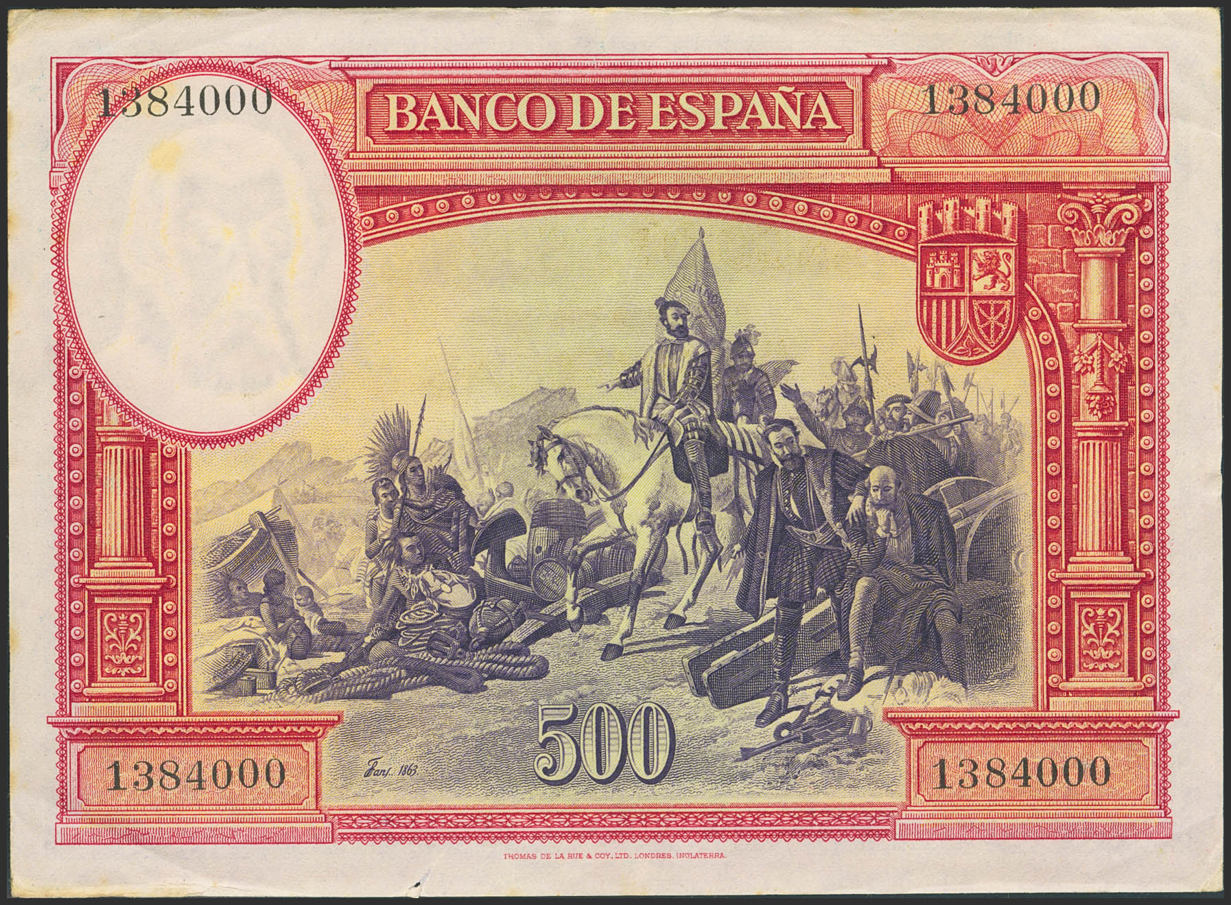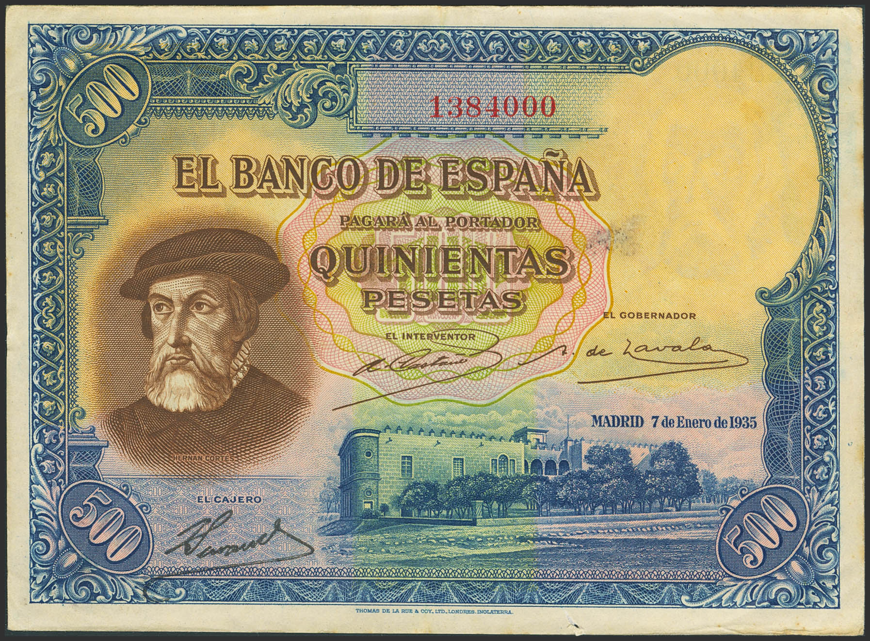 500 Pesetas. January 7, 1935. No series. (Edifil 2023: 365). Toned and needlepoint. Very Fine-.