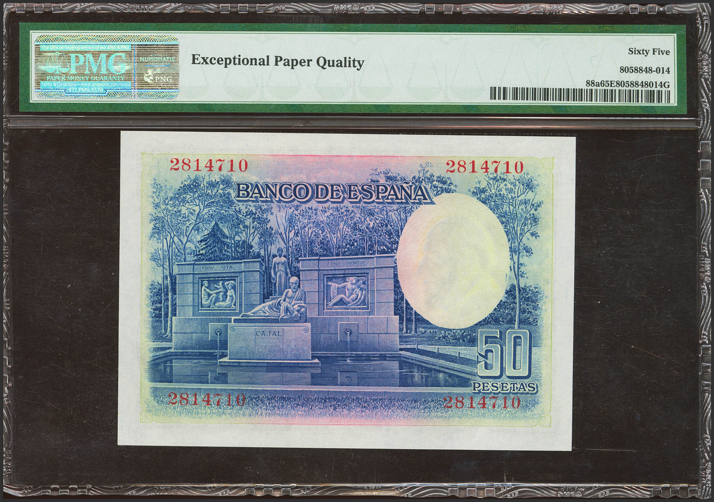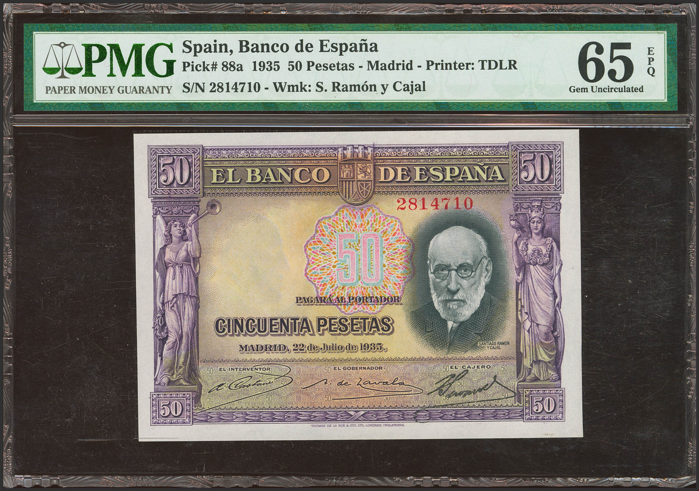 English 50 Pesetas. July 22, 1935. No series. (Edifil 2023: 366, Pick: 88a). Rare in this quality, original finish. Uncirculated. Encapsulated PMG65EPQ.