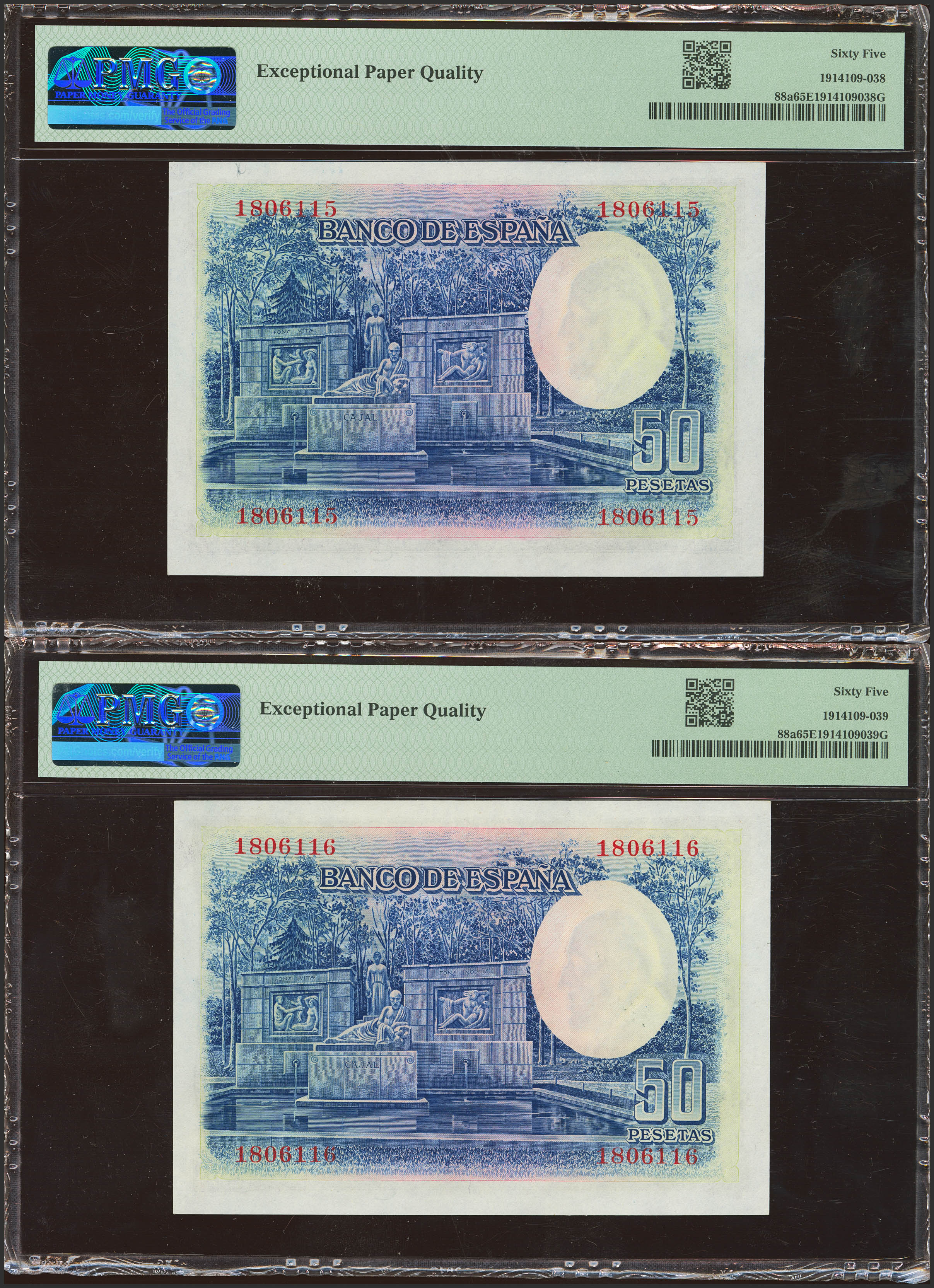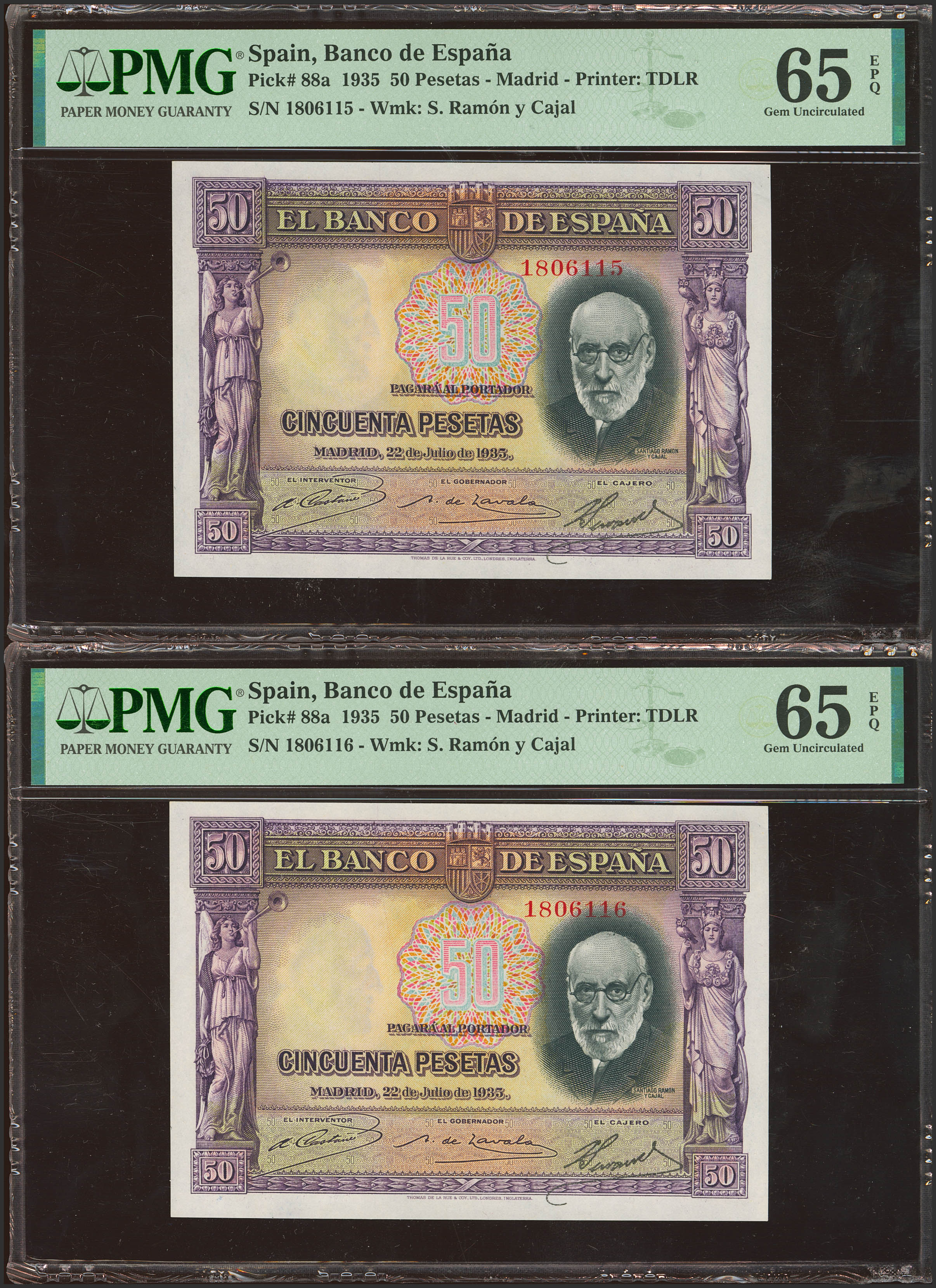 50 Pesetas. July 22, 1935. Correlative pair. No series. (Edifil 2023: 366, Pick: 88a). Uncirculated. Encapsulated PMG65EPQ, both.