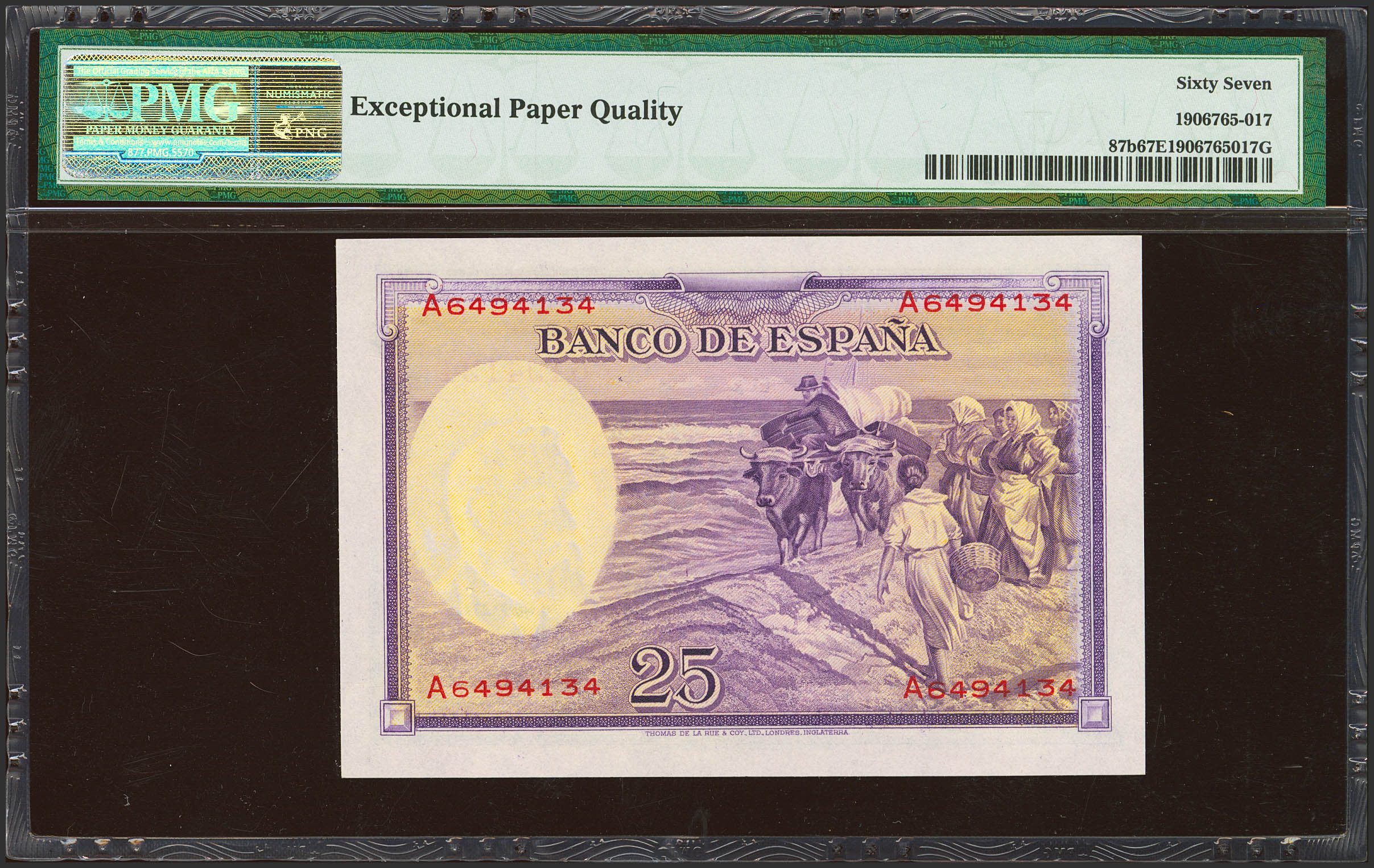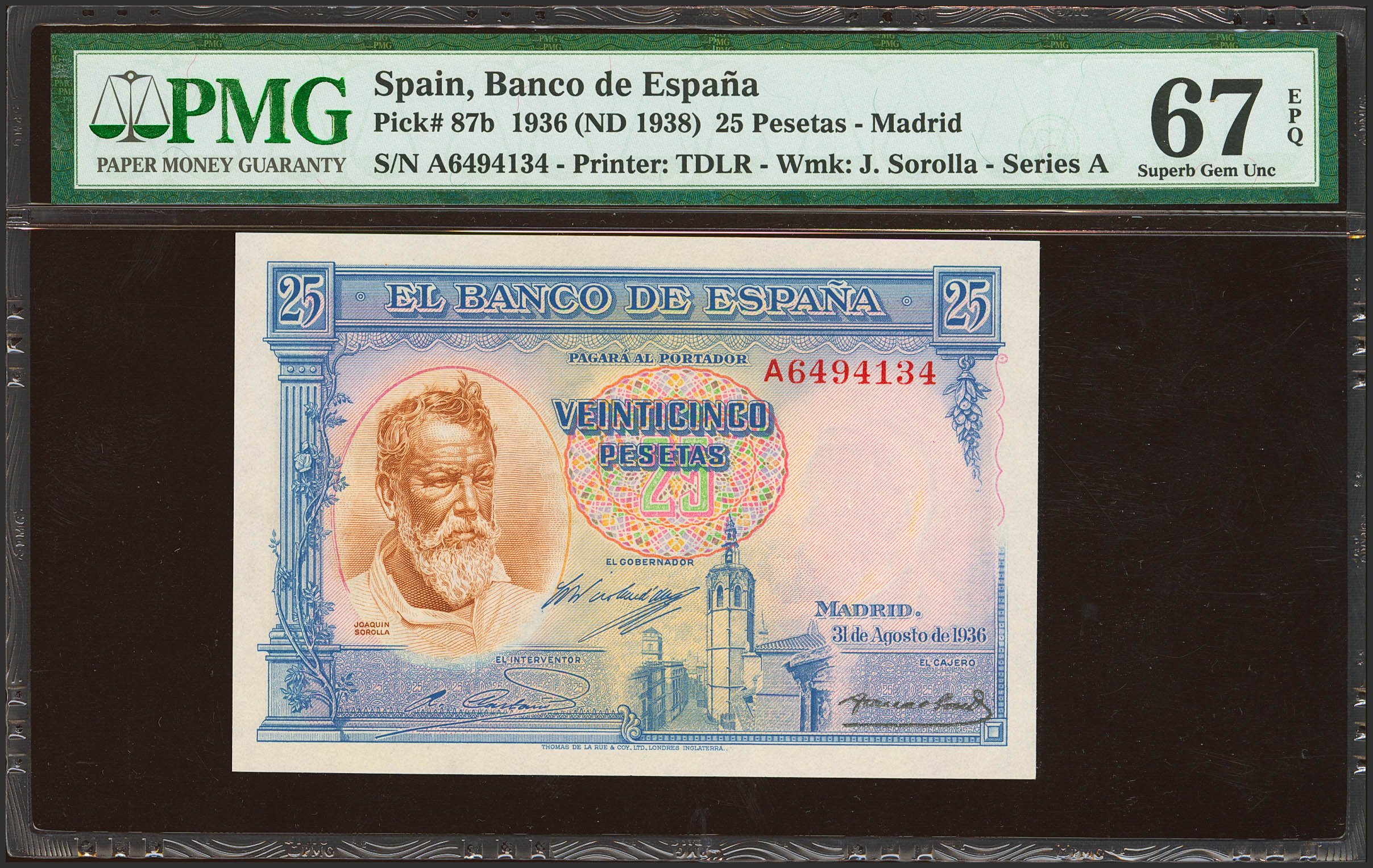 25 Pesetas. August 31, 1935. Series A. (Edifil 2017: 367a). Extraordinarily rare in this quality, original finish. Encapsulated PMG67EPQ. Uncirculated.