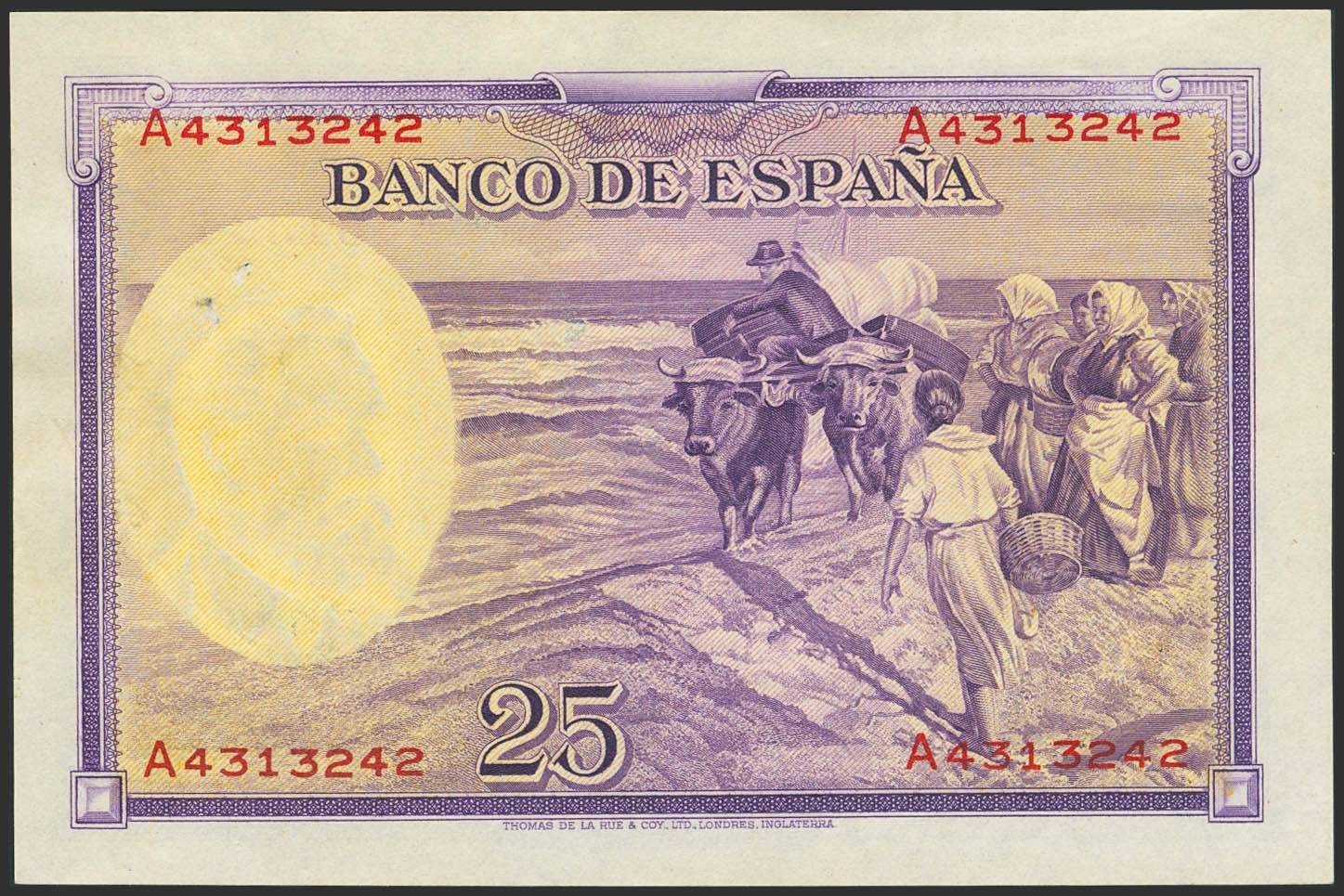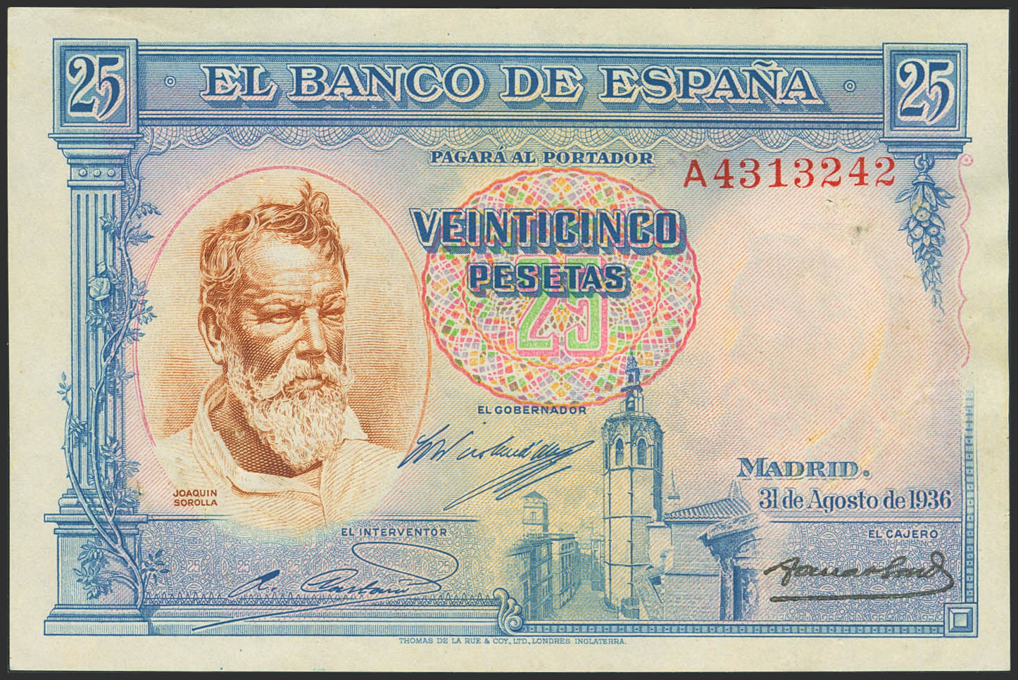 25 Pesetas. August 31, 1936. Series A. (Edifil 2021: 367a). Staple points. Extremely Fine.