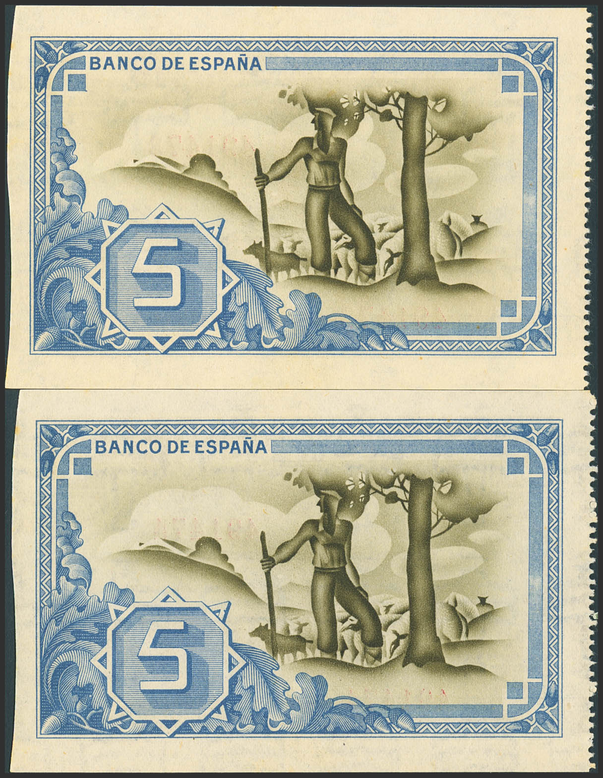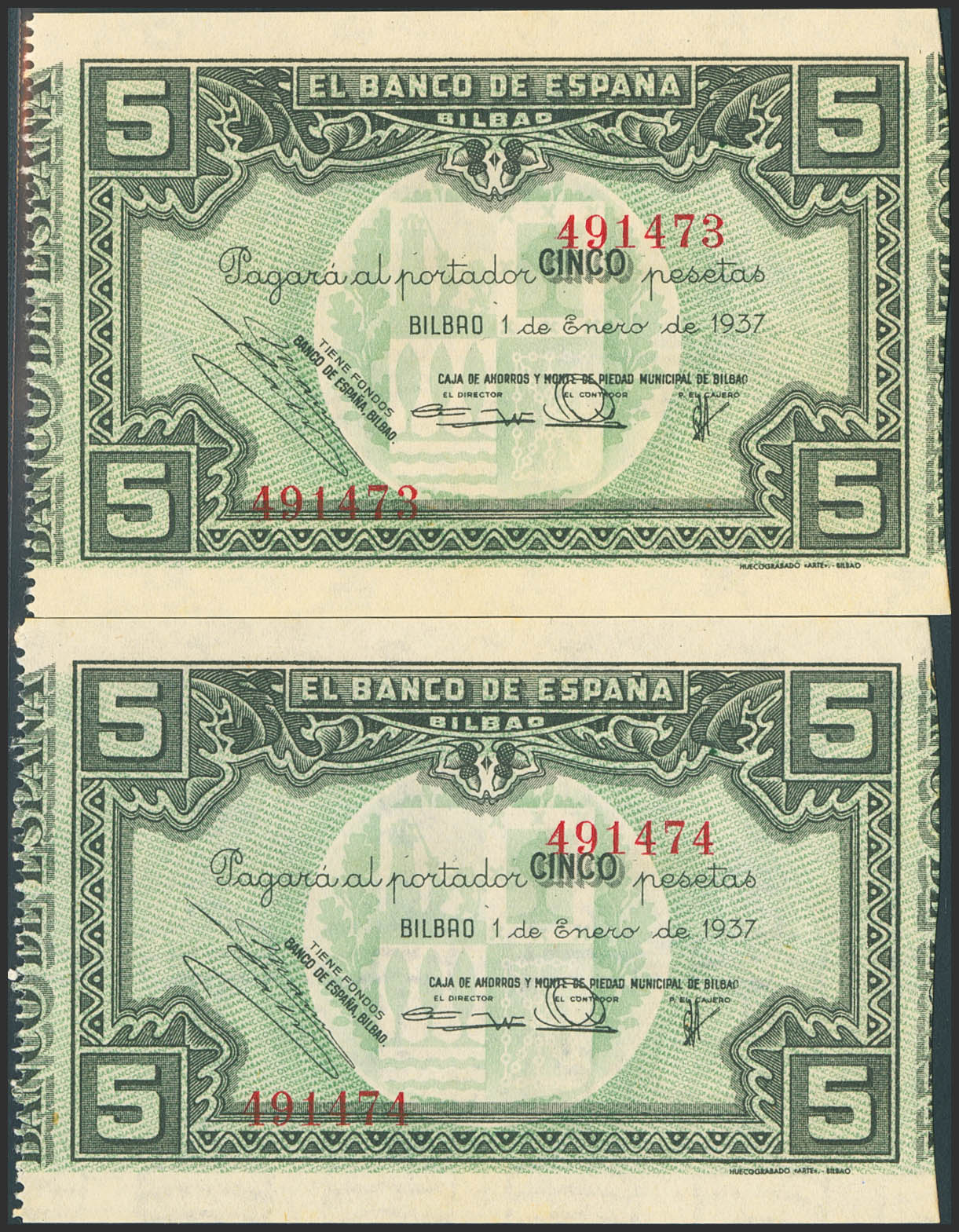 5 Pesetas. January 1, 1937. Correlative pair. Bilbao branch, signed Caja de Ahorros y Monte de Piedad Municipal de Bilbao. With numbering and without matrices. (Edifil 2023: 385a). Original marking. Uncirculated-.