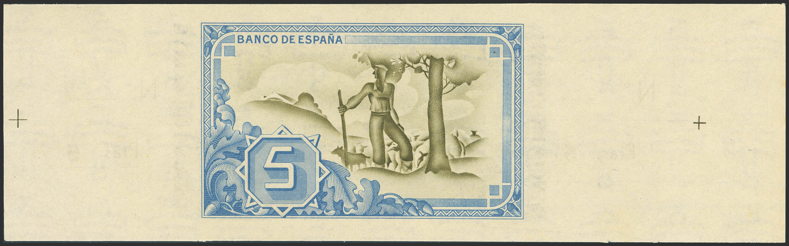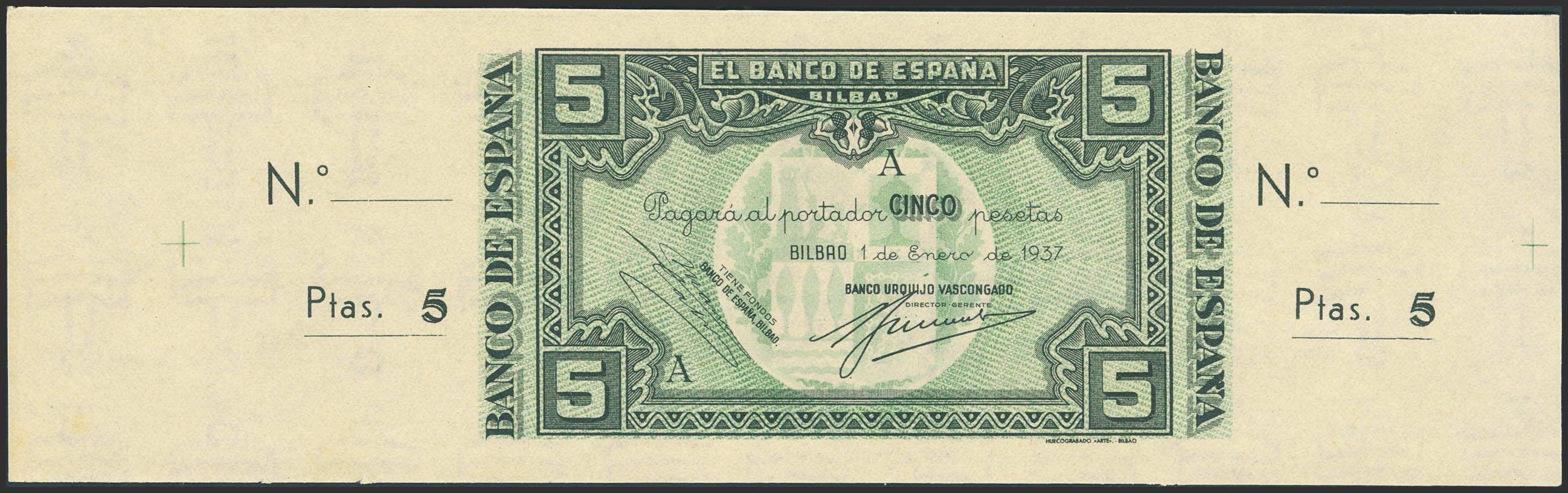 5 Pesetas. January 1, 1937. Bilbao branch, Banco Urquijo Vascongado signature. Series A and unnumbered, with both matrices. (Edifil 2023: 386f). Typical spots. Uncirculated-.