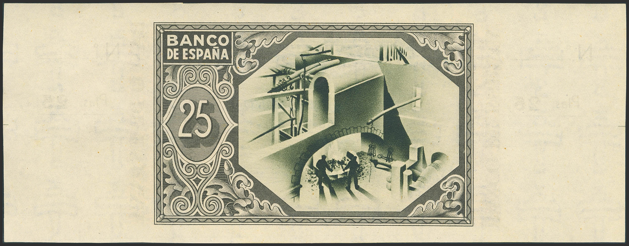 25 Pesetas. January 1, 1937. Bilbao branch, Caja de Ahorros Vizcaína signature. Without series and without numbering, with both matrices. (Edifil 2023: 388a). Original marking. Uncirculated.