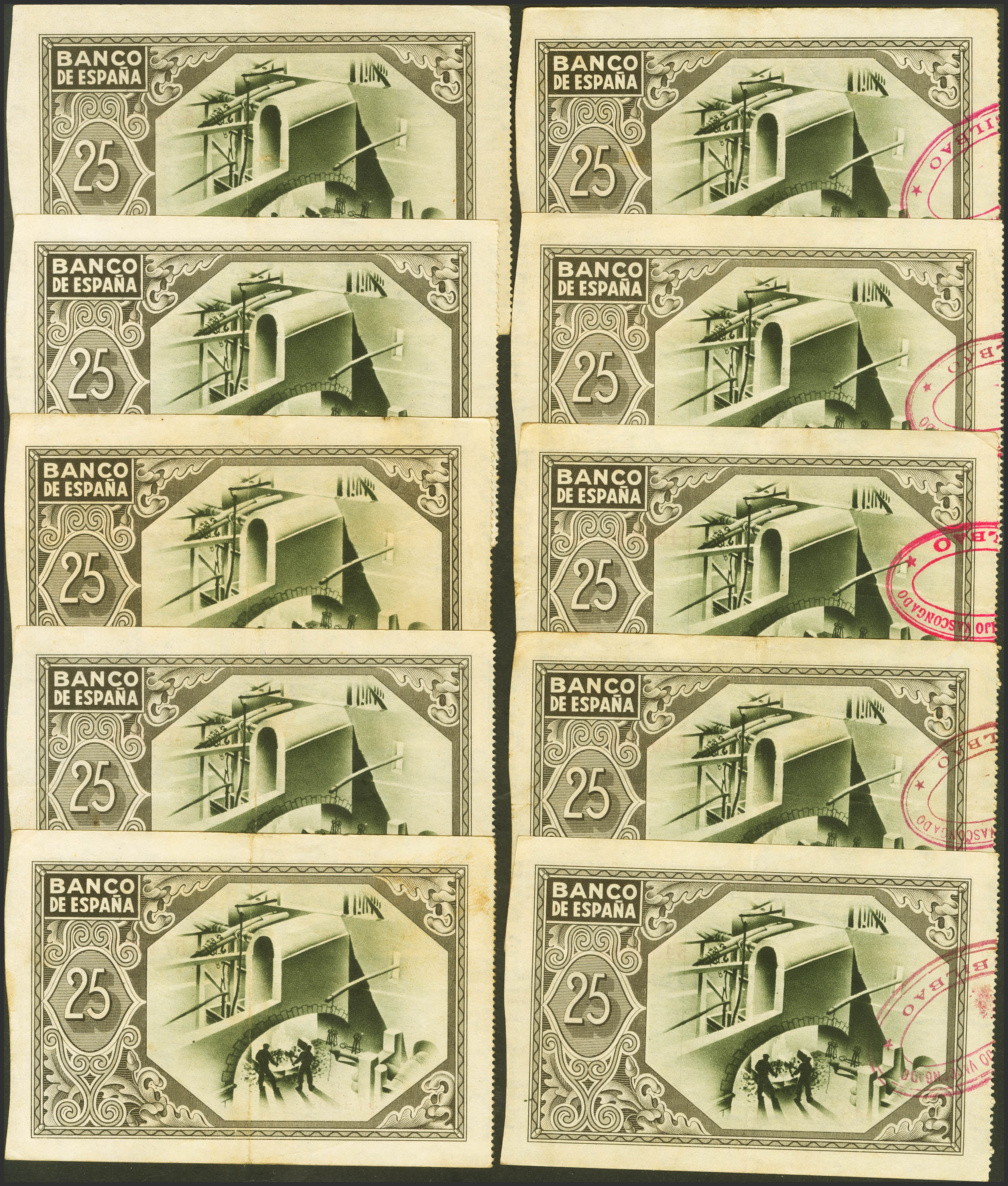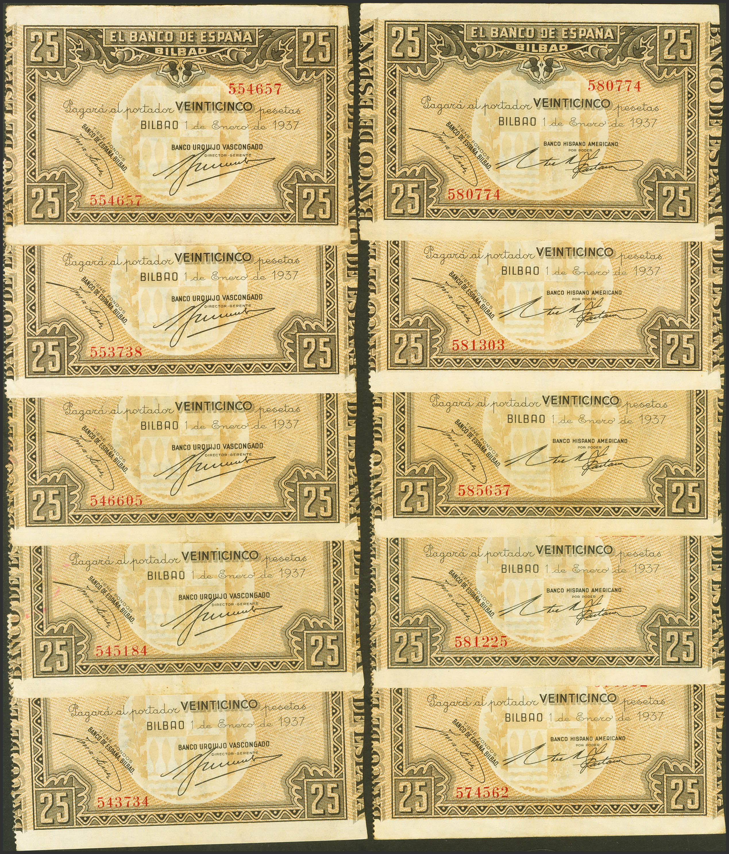 Set of 10 25 Pesetas banknotes from Banco de Bilbao, issued on January 1, 1937, all of them without series and with various signatures. (Edifil 2023: 388). Extremely Fine/Extremely Fine-.
