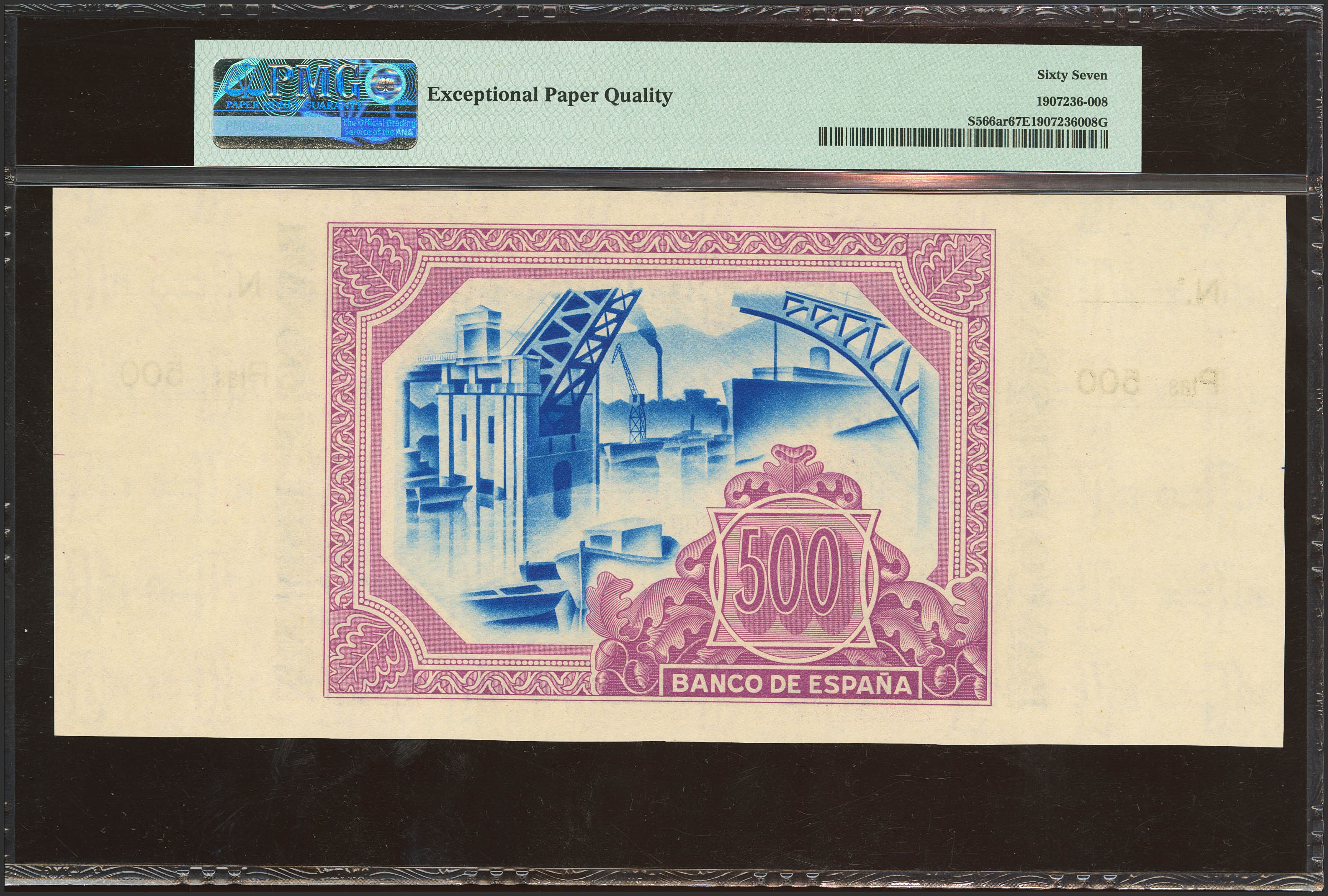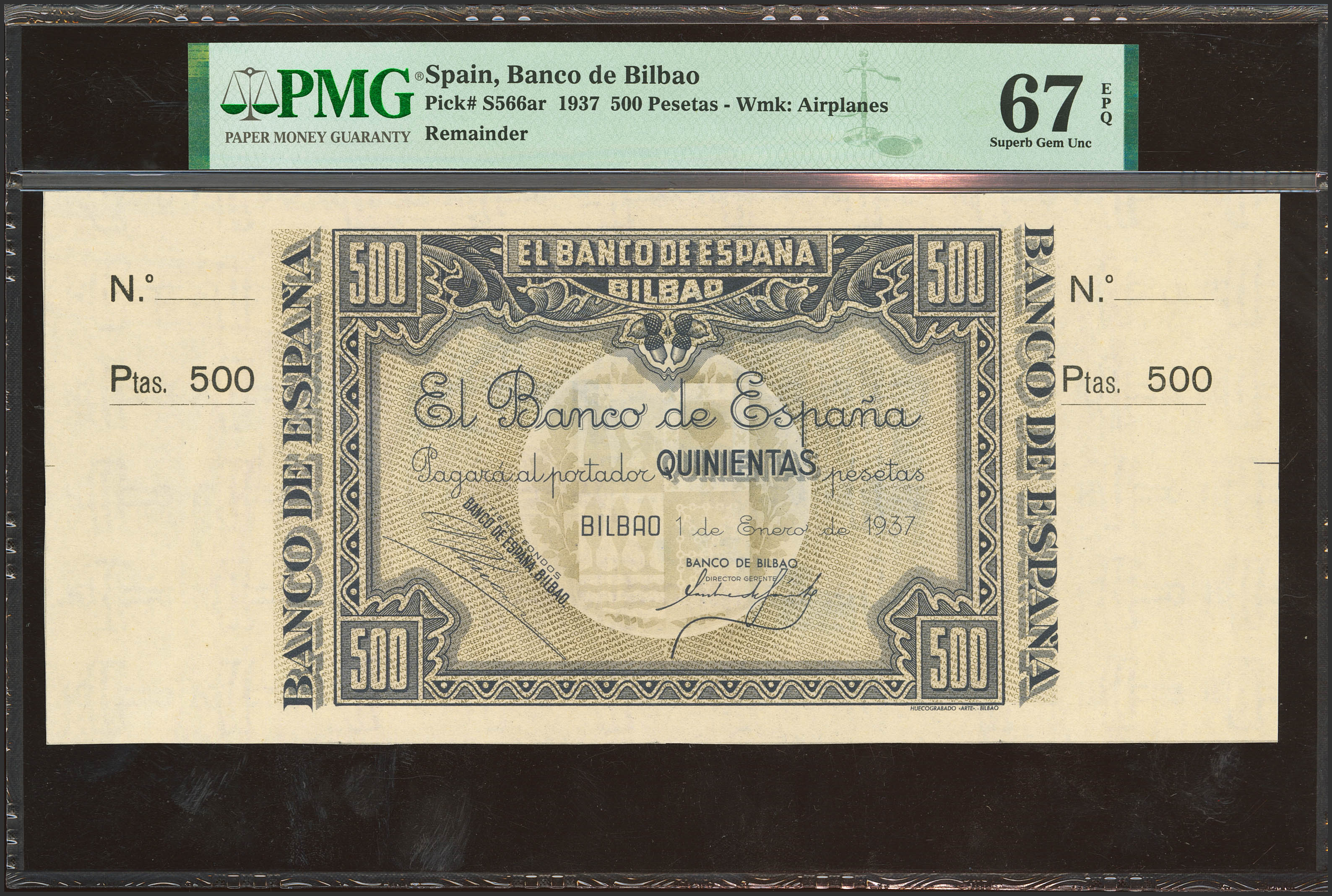 500 Pesetas. January 1, 1937. Bilbao branch, Banco de Bilbao signature. Without series and without numbering, with both matrices. (Edifil 2023: NE26a). Very rare in this exceptional conservation since most of these banknotes have some points of time and usual wrinkles and it is difficult to achieve super-high grades since PMG does not consider these subjectivities linked to the issue. Uncirculated. Encapsulated PMG67EPQ. (To get an idea of the rarity of this banknote in this quality, PMG grants, as of October 1, 2024, the best grade including all the signatures).