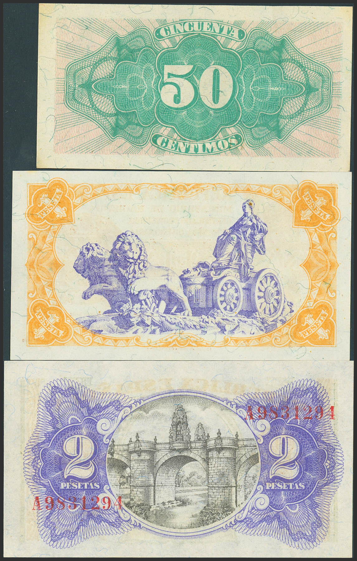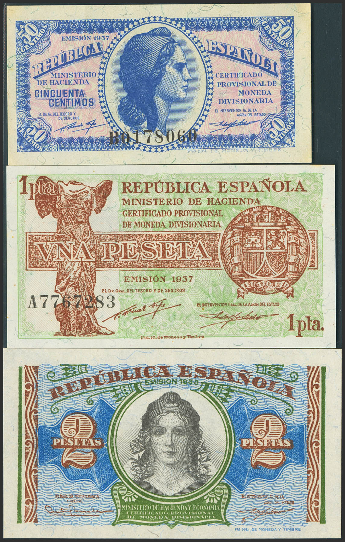 Set of 3 banknotes of 50 Cents, 1 Peseta and 2 Pesetas. 1937. Series B, A and A, respectively. (Edifil 2023: 391, 392, 393). Uncirculated-/Uncirculated.