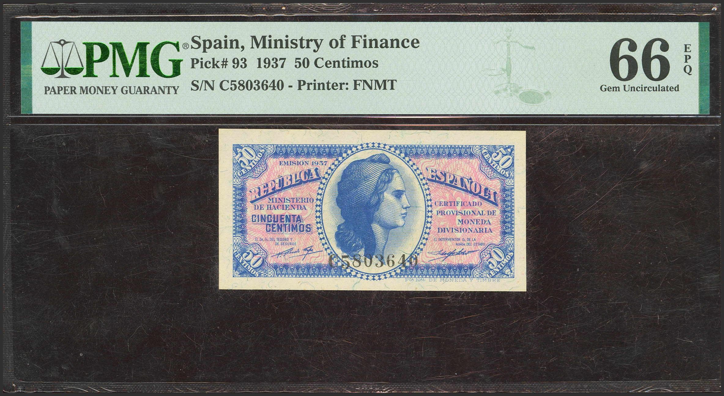 English 50 Cents. 1937. Ministry of Finance. Series C, last series issued. (Edifil 2023: 391a, Pick: 93). Original size. Uncirculated. Encapsulated PMG66EPQ.