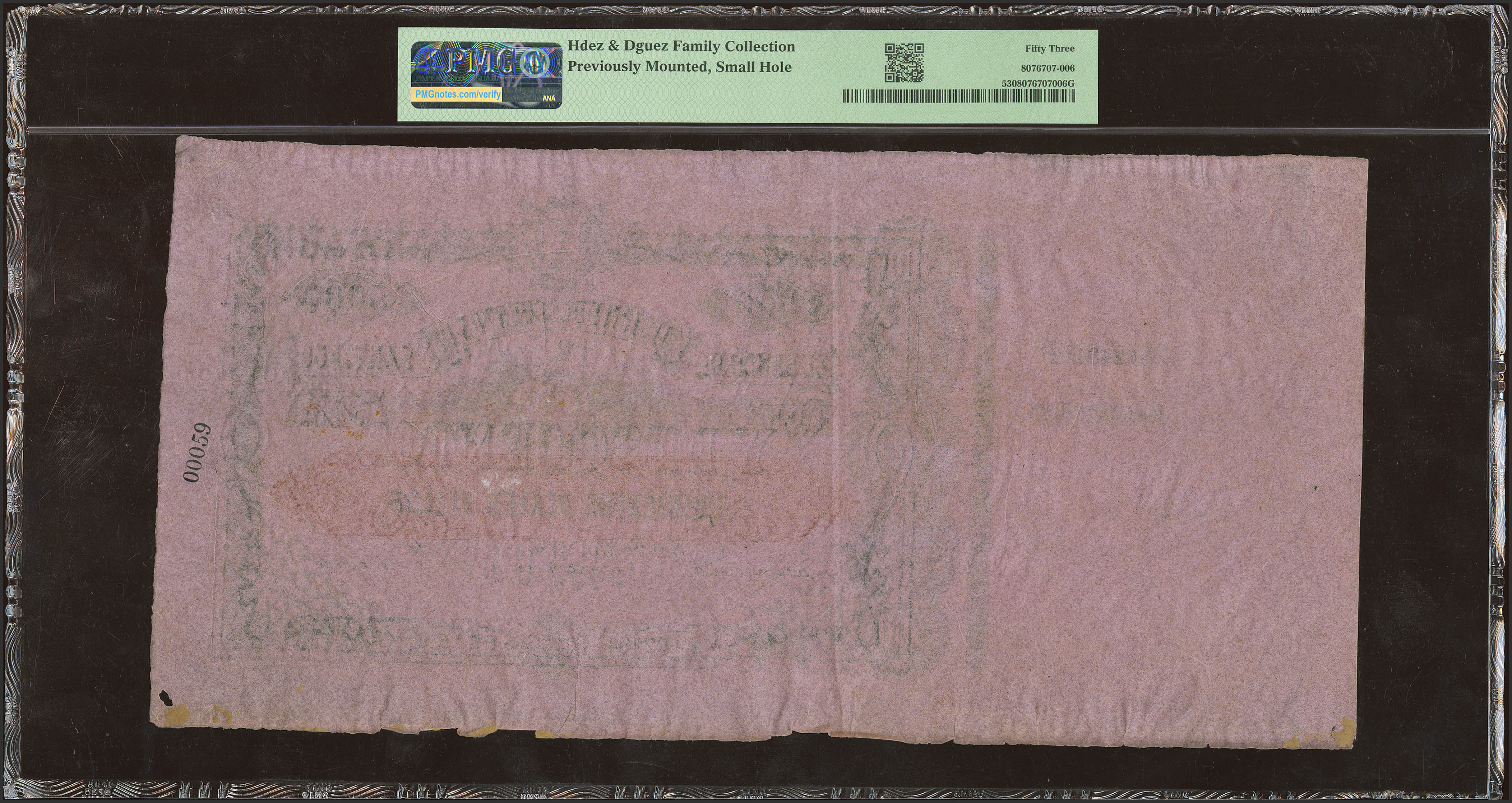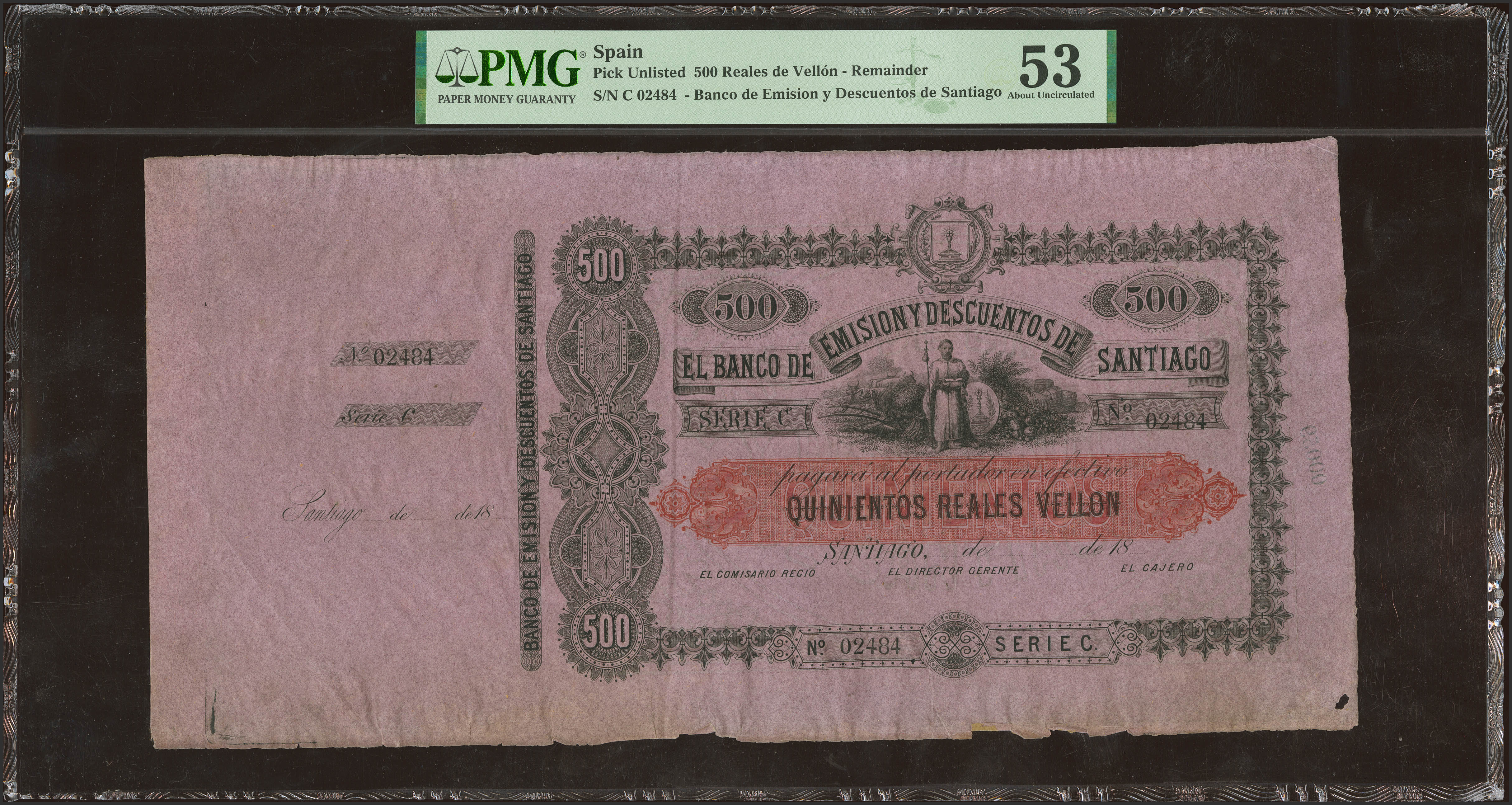 500 Reales de Vellón. 1863. Banco de Santiago. Series C and with matrix on the left. (Edifil 2023: 164). Extremely rare, previously mounted and moth spot in the lower right corner, of no importance. Extremely Fine. Encapsulated PMG53 (previously mounted, small hole). 500 REALES 1865 BANK OF SANTIAGO During the first half of the 19th century, the Galician tanneries suffered a major recession due to the independence of the Spanish-American territories and particularly Argentina, on whose market the raw materials of this industry depended. From 1860, with the improvement of roads, the construction of railways and the specialisation of this industry in the production of leather soles, the economy of Santiago de Compostela experienced a notable recovery. In the midst of this optimistic environment, the Banco de Emisión y Descuentos de Santiago was founded with the acquiescence of the Bank of Spain, which had no interest in Galicia, and in a fairly short period of time; its creation was authorised in May 1864, and it began to operate on 20 September of that same year with a share capital of 3 million reales. A large part of the shares were subscribed by Galician businessmen and merchants, related to the tanneries; there were also many Riojan industrialists. However, the main shareholder was the Sociedad de Crédito Vasco, which subscribed a third of the shares. The Board of Governors of the Bank immediately ordered the production of banknotes in England for a total of 5 million reales. These banknotes did not begin to circulate until March 1865 and in a quantity of barely 1 million reales. The Bank's low income from deposits and the crisis of 1866 put an end to the young institution's hopes of survival. Mutual requests for cash between the Banco de Santiago and the Banco de la Coruña caused the circulation of banknotes to fall. Despite an initial good acceptance that placed more than eight hundred thousand reales in circulation at the end of that year, the following year the paper money in the hands of the public plummeted to just over two hundred thousand reales in mid-1866 and to just over half that figure at the end of the summer. The banknotes of the Banco de Santiago did not have a real acceptance and therefore the Bank maintained very high metal reserves (close to 50%) to keep the local economy going. In 1867 the liquidation of the institution was already being considered, although it would not be authorized until 1870, when the Bank was liquidated in 1871. Given the very short life of the banknotes of the Banco de Santiago and taking into account that its main shareholder, the Sociedad de Crédito Vasco, was also the shareholder of the Banco de Oviedo, it is not surprising that there are hardly any copies of these institutions. There are no known copies of the Asturian bank and only a remainder of 200 reales of the Basque company is known. Most of the Banco de Santiago notes must have been destroyed as soon as the liquidation began, since there were very few in the hands of the public, so the survivors are anecdotal and all with matrix and without signatures, as far as we know: 100 reales (series A), 500 reales (series C), 1000 reales (series D), 2000 reales (series E) and 4000 reales (series F). Of these, the 1000 reales note has some notable paper faults on its right side, the 4000 reales note has minor faults on the bottom and the 100 reales note has one corner missing and another damaged. Only the 500 and 2000 reales notes are in good condition. We assume that there is a 200 reales note (series B), although we have never seen it. Of all these, the only one that has a number is the 500 real note, which makes it probably the rarest of the entire series, which is already unique in itself. From this numbering it does not seem too risky to deduce that the amounts assigned for each value would be the following to constitute five million reales: Value Amount Real 100 2,500 250,000 200 2,500 500,000 500 2,500 1,250,000 1,000 1,000 1,000,000 2,000 500 1,000,000 4,000 250 1,000,000 According to these figures, it is surprising that only 5 (perhaps 6) copies of 9,250 printed have survived. Such is the rarity of the banknote that Ibercoin offers. We would like to thank Jose Antonio Castellanos Vargas for his collaboration in the historical contextualization of this extraordinary and historic piece of Spanish notaphilia.