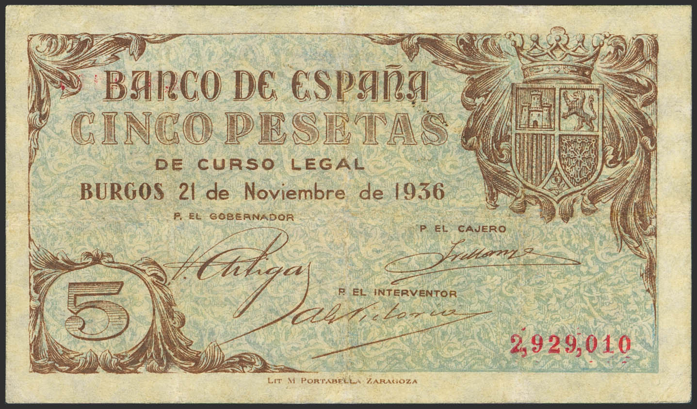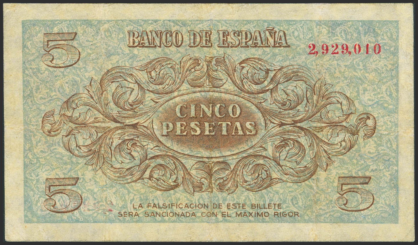 English 5 Pesetas. November 21, 1936. No series. (Edifil 2021: 417). Rare, slightly repaired. VF-.