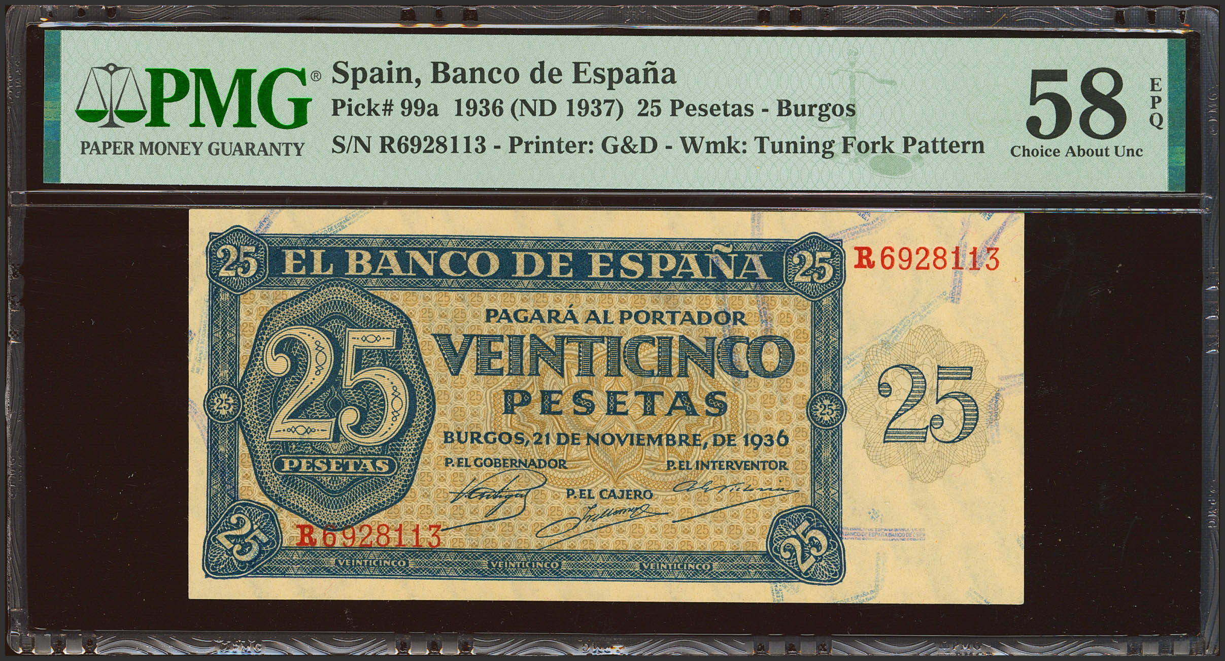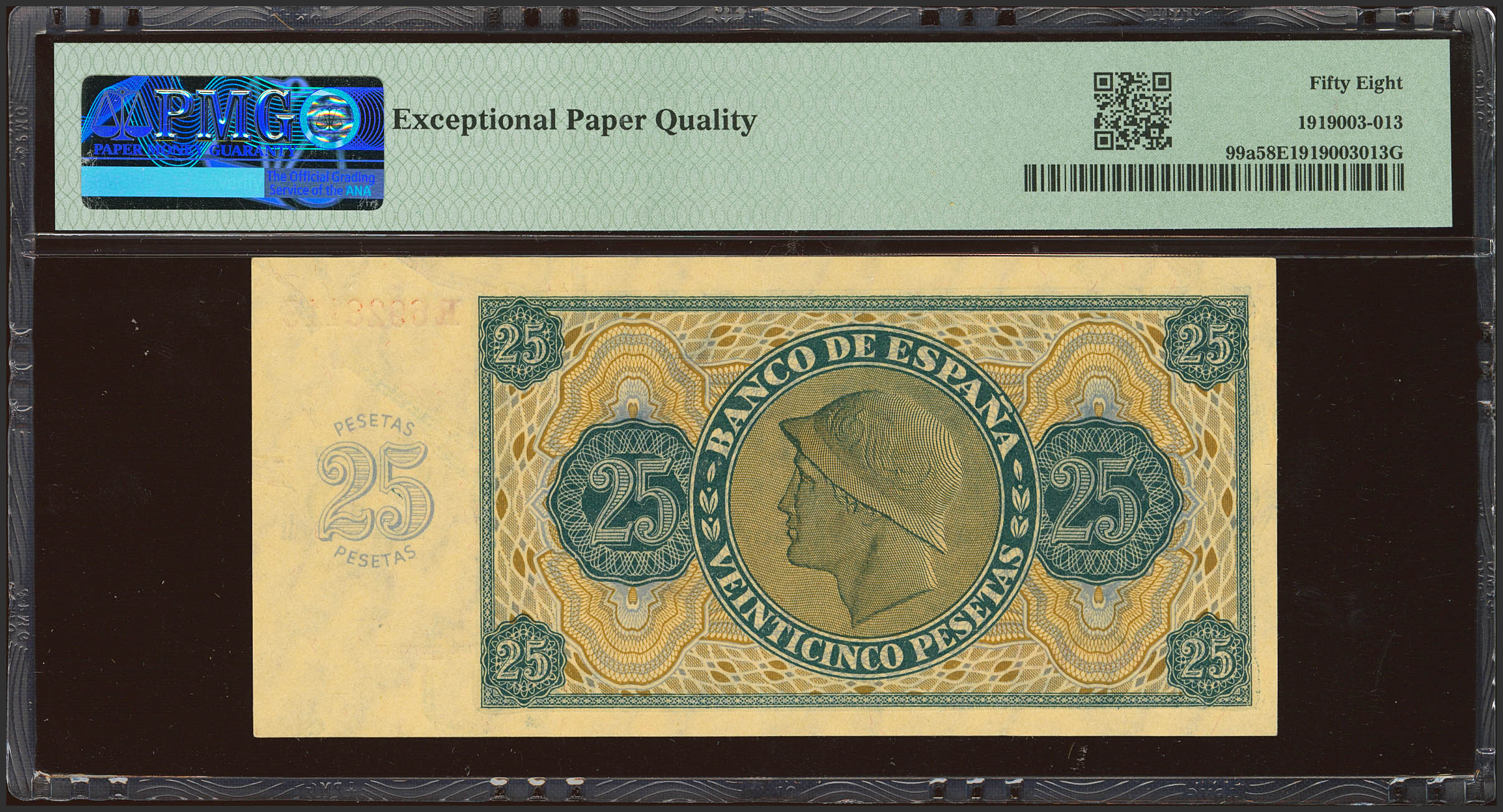 25 Pesetas. November 21, 1936. Series R. (Edifil 2023: 419a, Pick: 99a). Rare in this exceptional quality, original marking. Good Extremely Fine++. Encapsulated PMG58EPQ.
