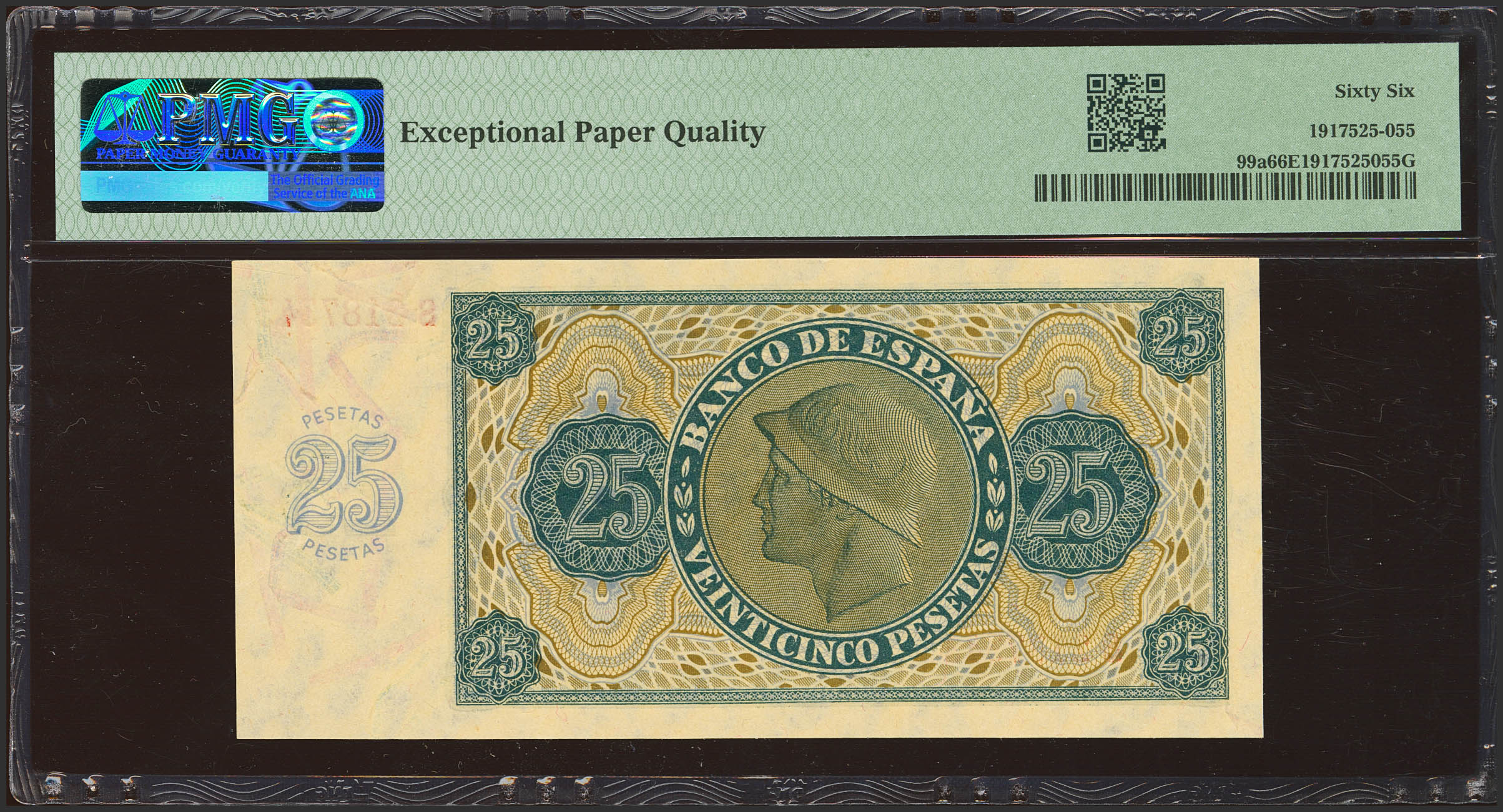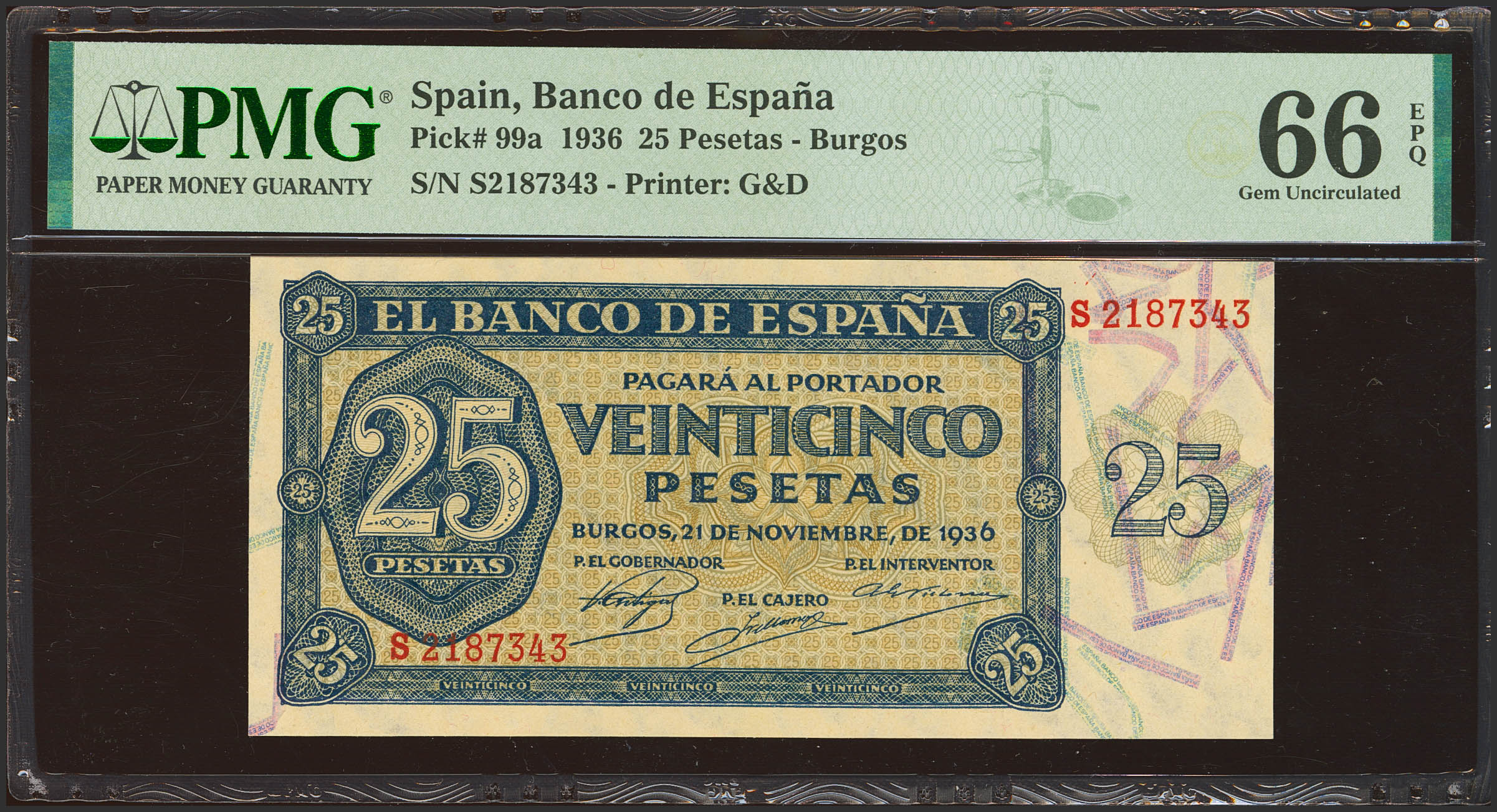 25 Pesetas. November 21, 1936. Series S, last series issued. (Edifil 2023: 419b, Pick: 99a). Unusual in this quality, original finish. Uncirculated. Encapsulated PMG66EPQ.
