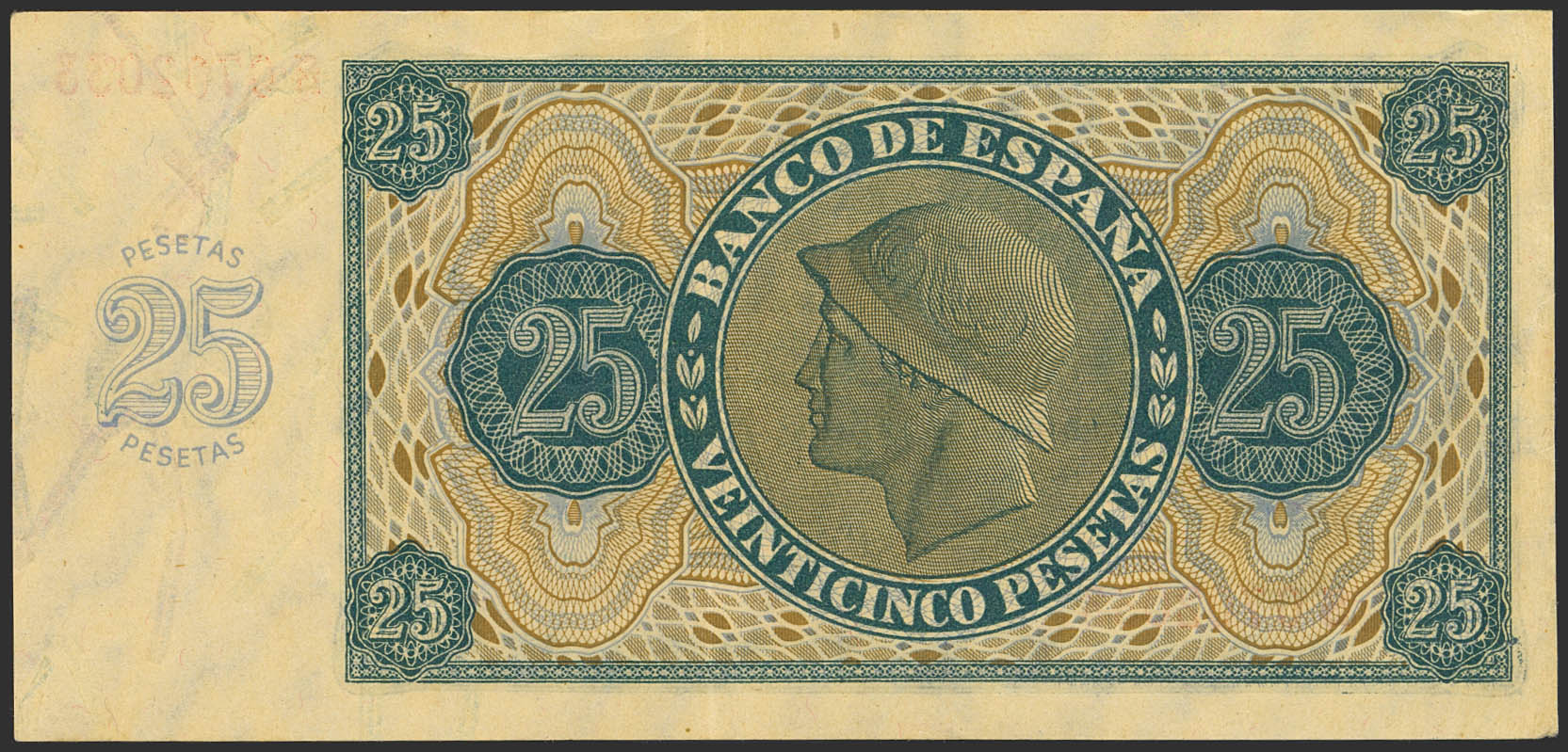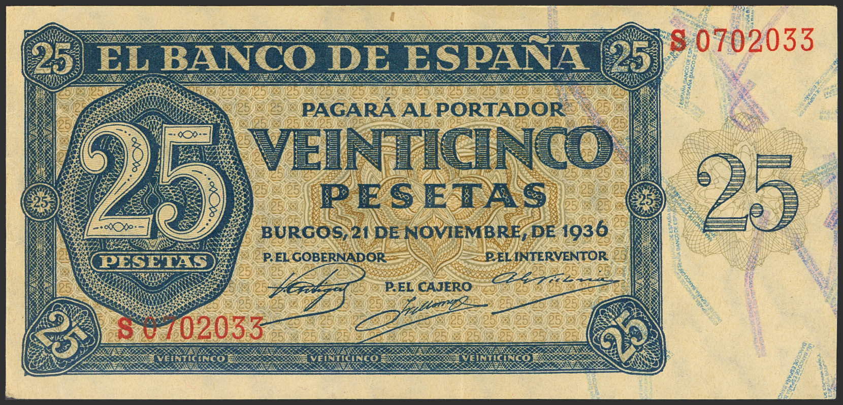 25 Pesetas. November 21, 1936. Series S, last series issued. (Edifil 2023: 419b). It retains much of its original appearance. Extremely Fine.