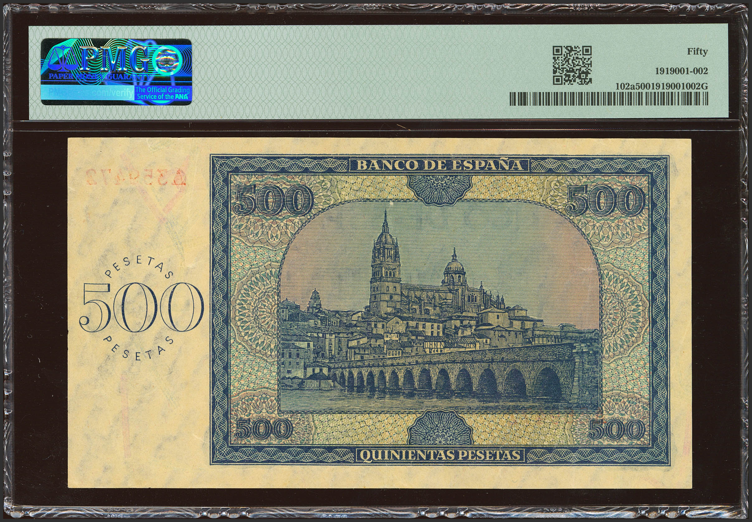 500 Pesetas. November 21, 1936. Series A. (Edifil 2023: 422, Pick: 102a). Extremely Fine. Encapsulated PMG50.