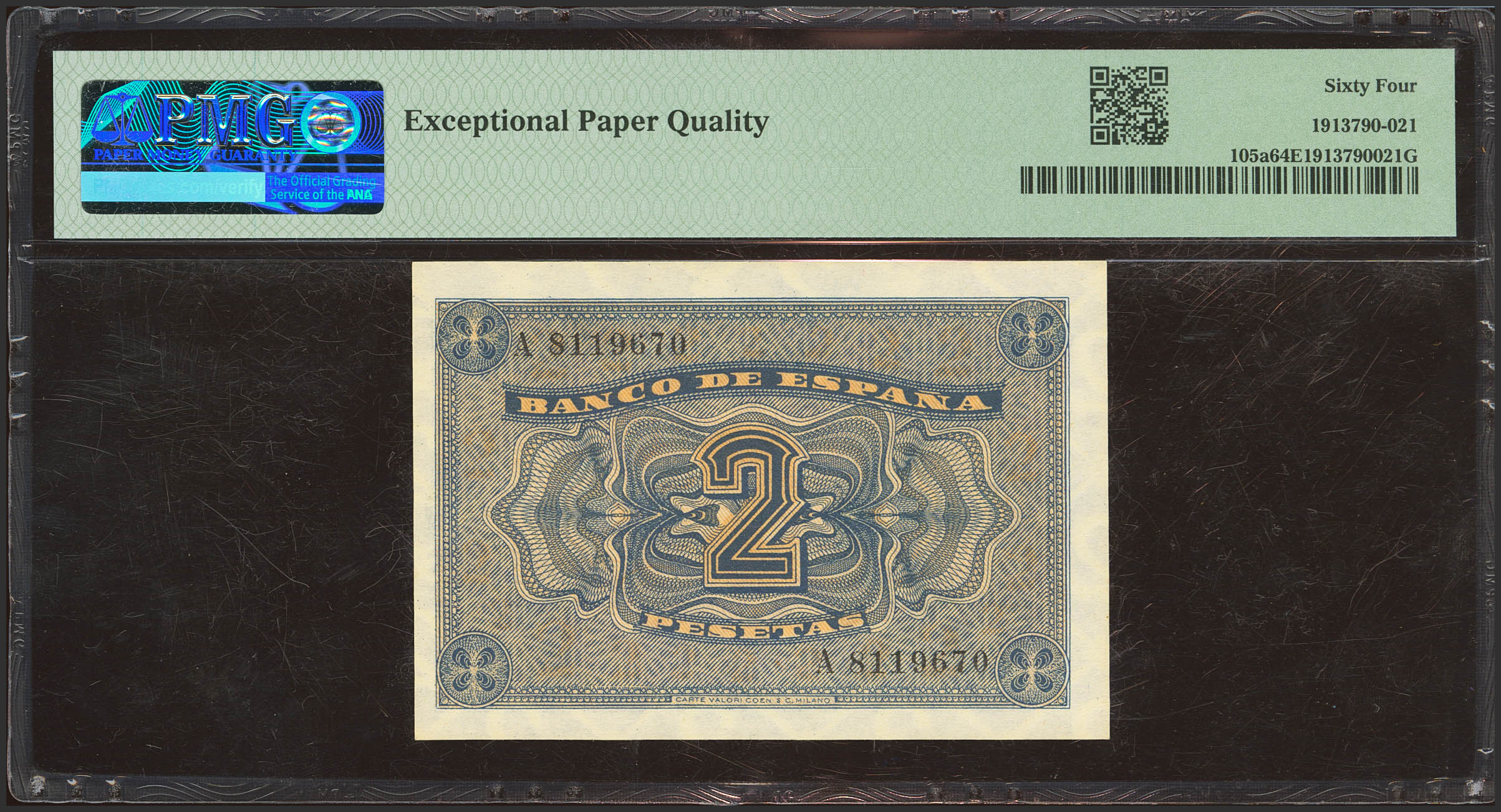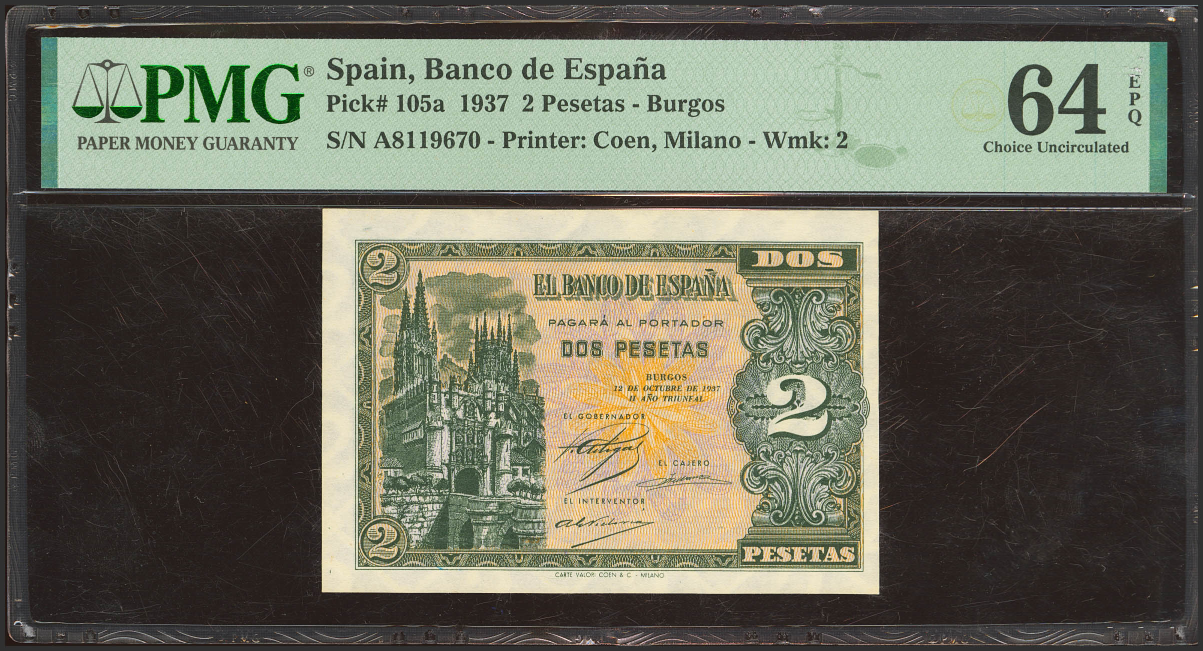 2 Pesetas. October 12, 1937. Series A. (Edifil 2023: 426, Pick: 105). Original marking. Uncirculated. Encapsulated PMG64EPQ.
