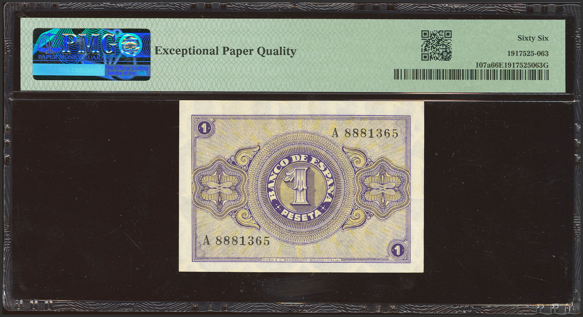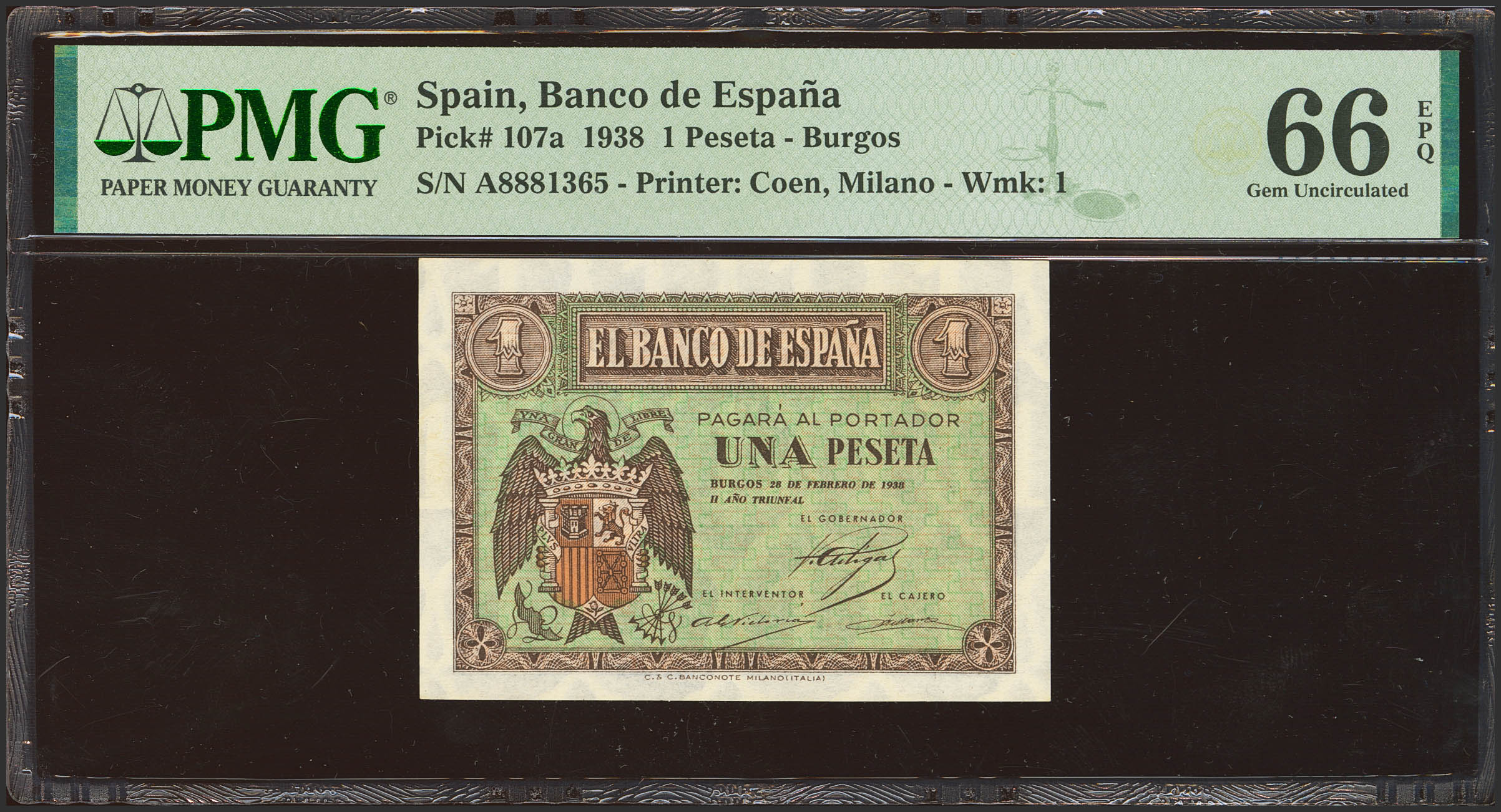 1 Pesetas. February 28, 1938. Series A. (Edifil 2023: 427, Pick: 107a). Original marking. Uncirculated. Encapsulated PMG66EPQ.