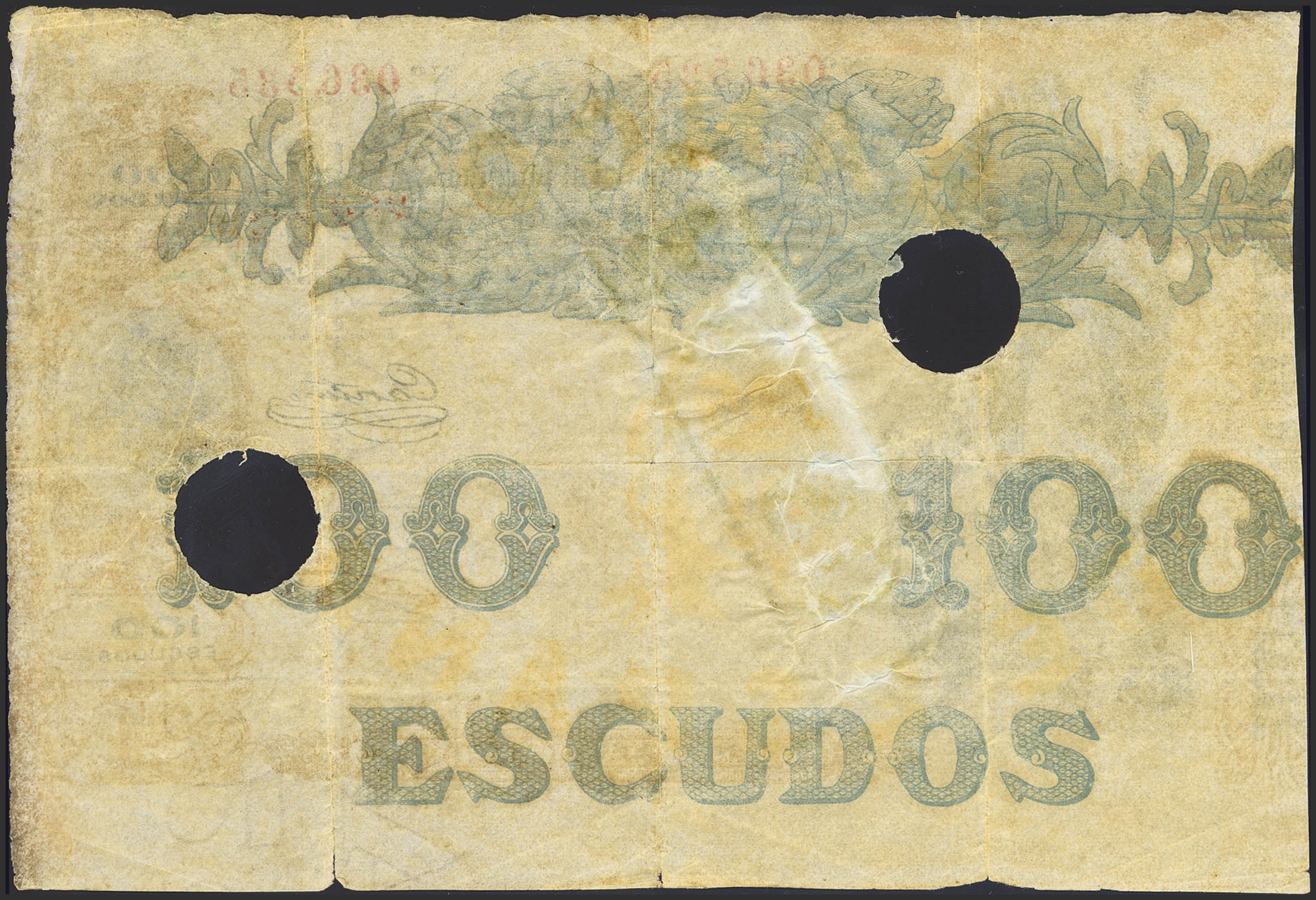 100 Escudos. January 2, 1871. Period counterfeit. Without serial number and perforated (like most of the known ones), with the FALSE mark (Edifil 2023: 244F). Very rare, repaired without any importance. VF.