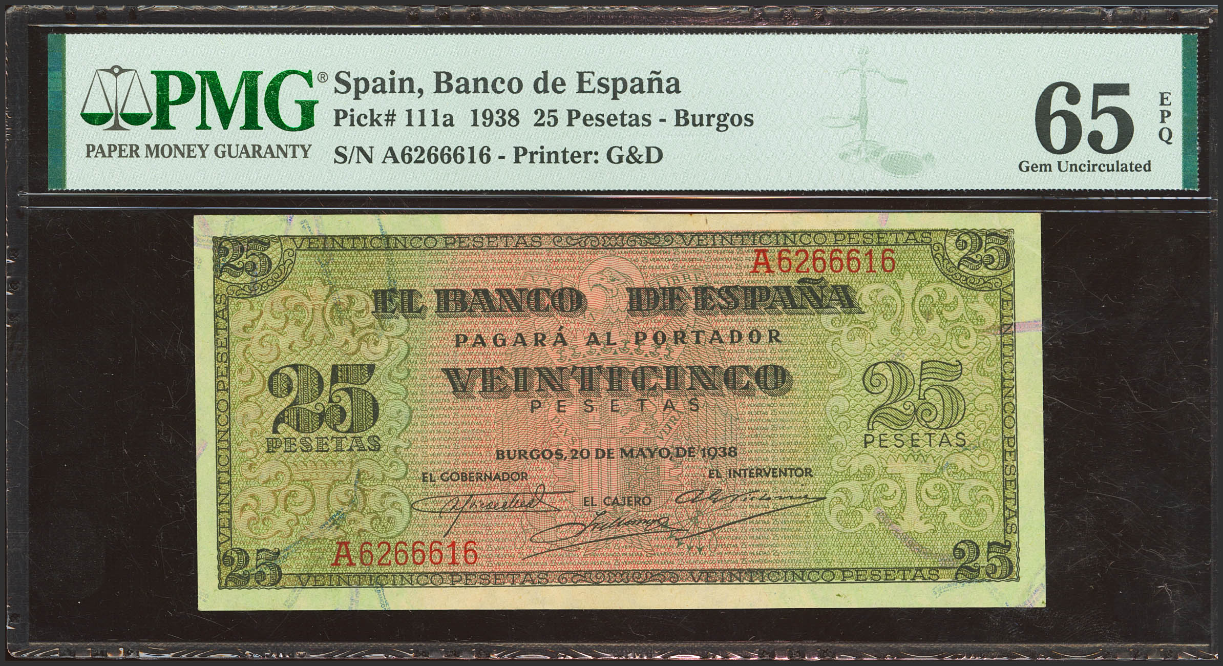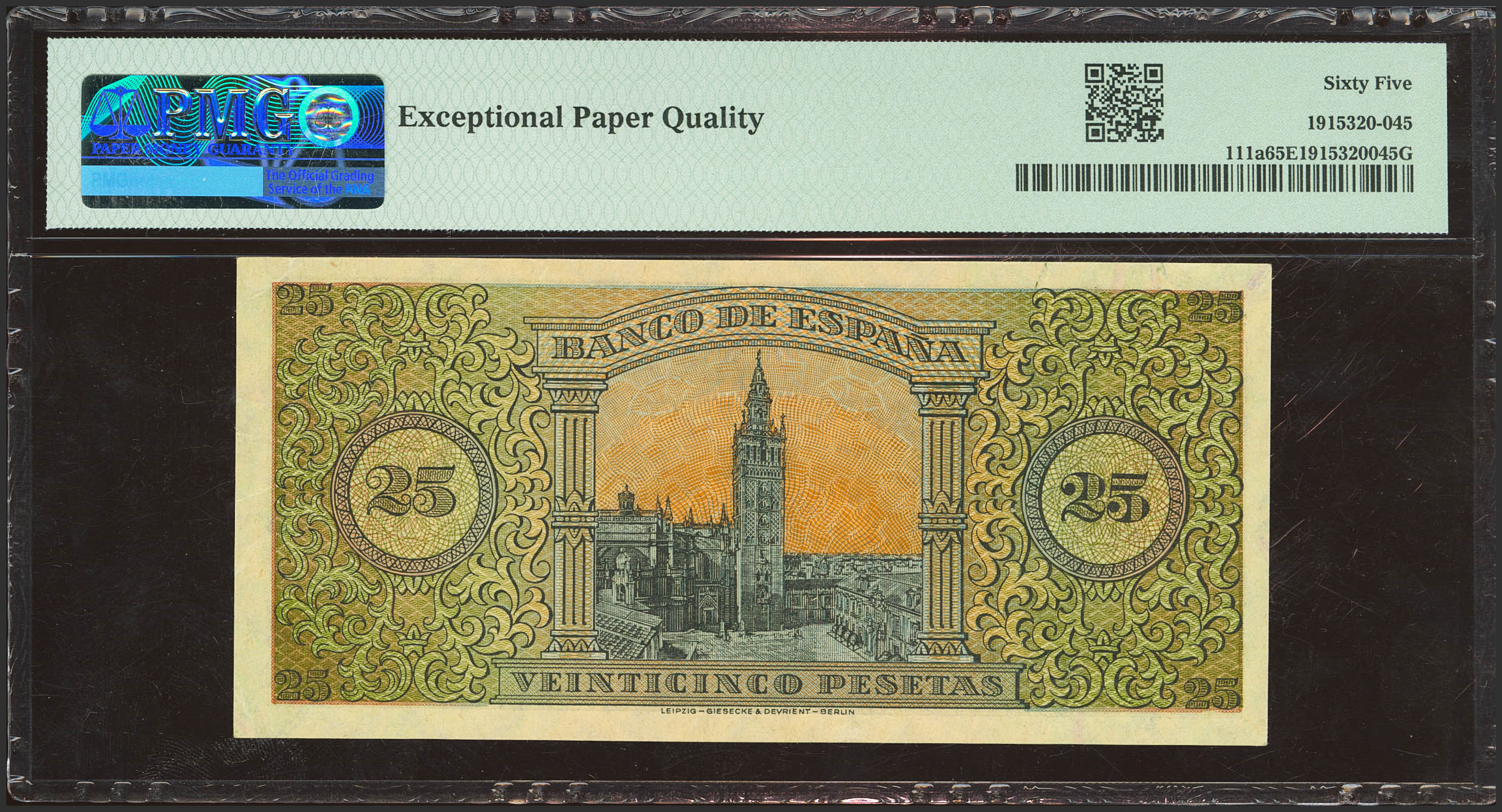 25 Pesetas. May 20, 1938. Series A. (Edifil 2023: 430a, Pick: 111a). Rare in this quality, original finish. Uncirculated. Encapsulated PMG65EPQ.