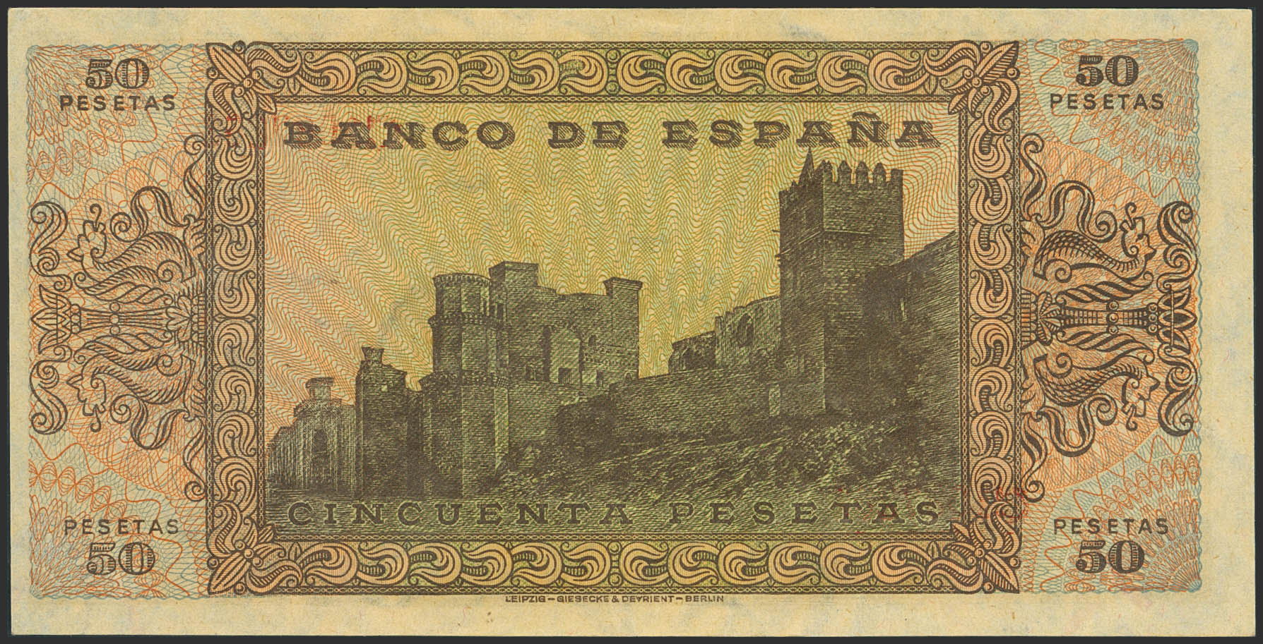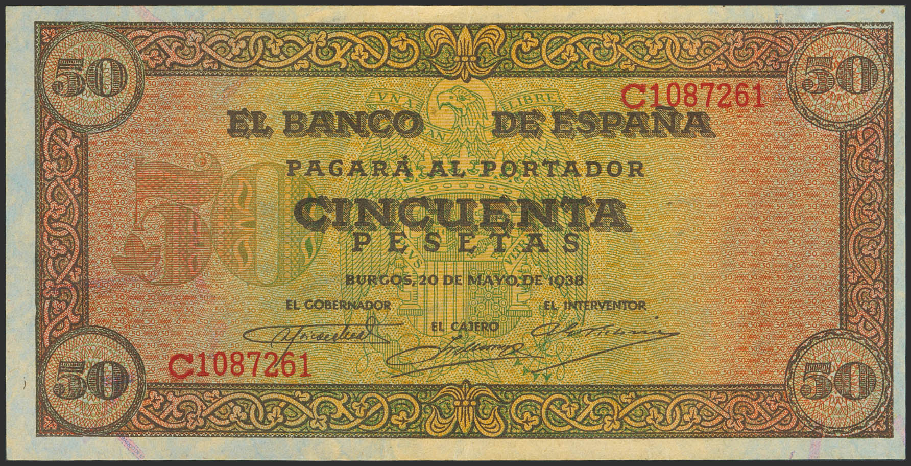 50 Pesetas. May 20, 1938. Series C. (Edifil 2023: 431a). Original size, natural wrinkles in the paper (this is the only reason for "removing" the Uncirculated). Good Extremely Fine++.