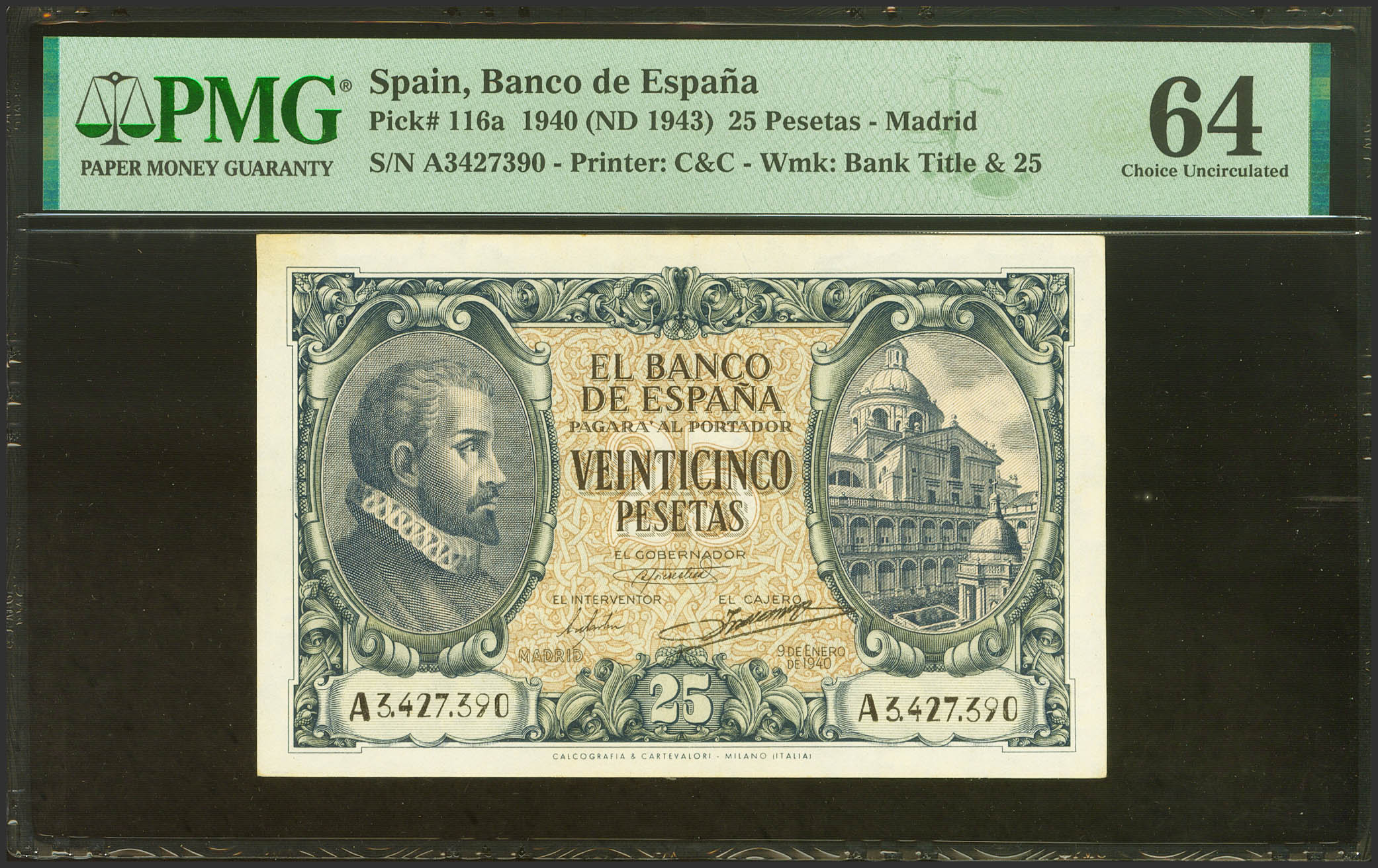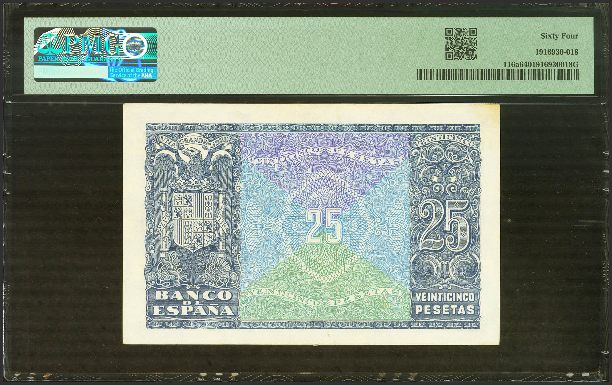 25 Pesetas. January 9, 1940. Series A. (Edifil 2023: 436, Pick: 116a). Unusual in this quality. Uncirculated. Encapsulated PMG64.