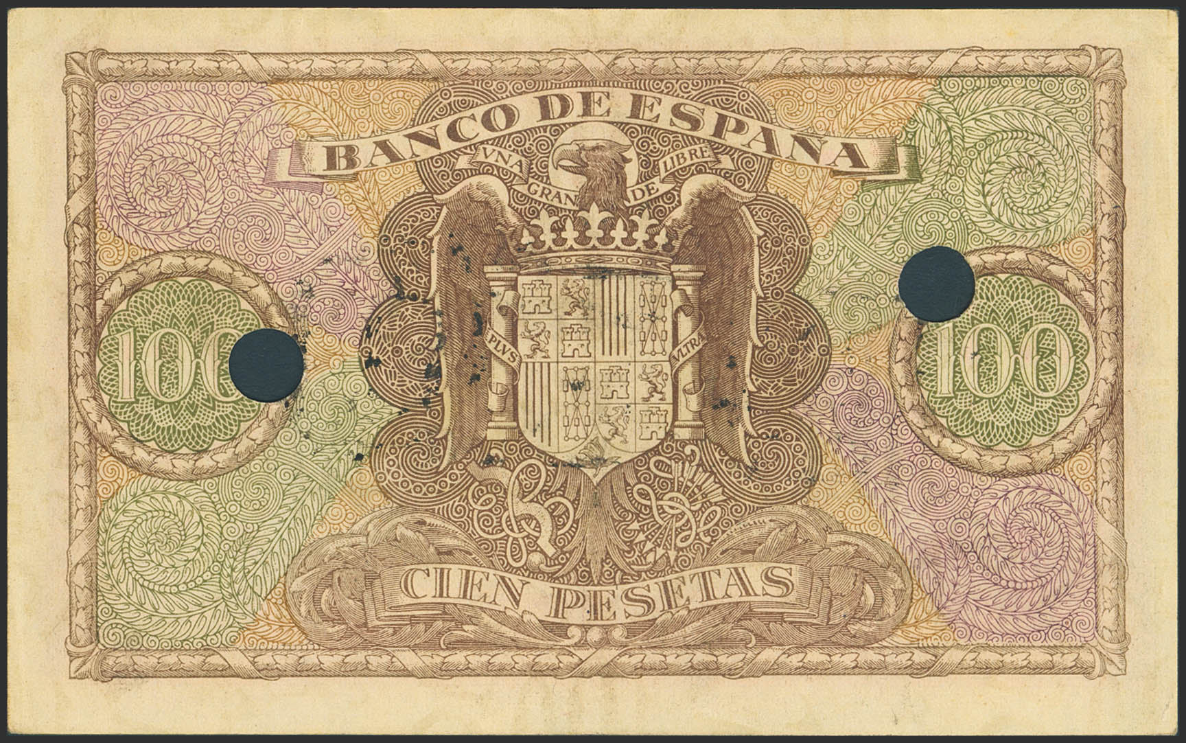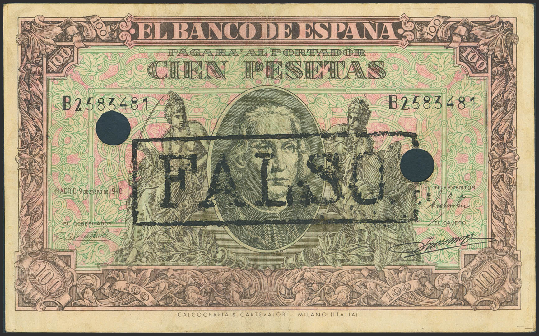 100 Pesetas. January 9, 1940. Period counterfeit. Series B, FALSE stamp and perforation. (Edifil 2023: 438f). Good Very Fine.
