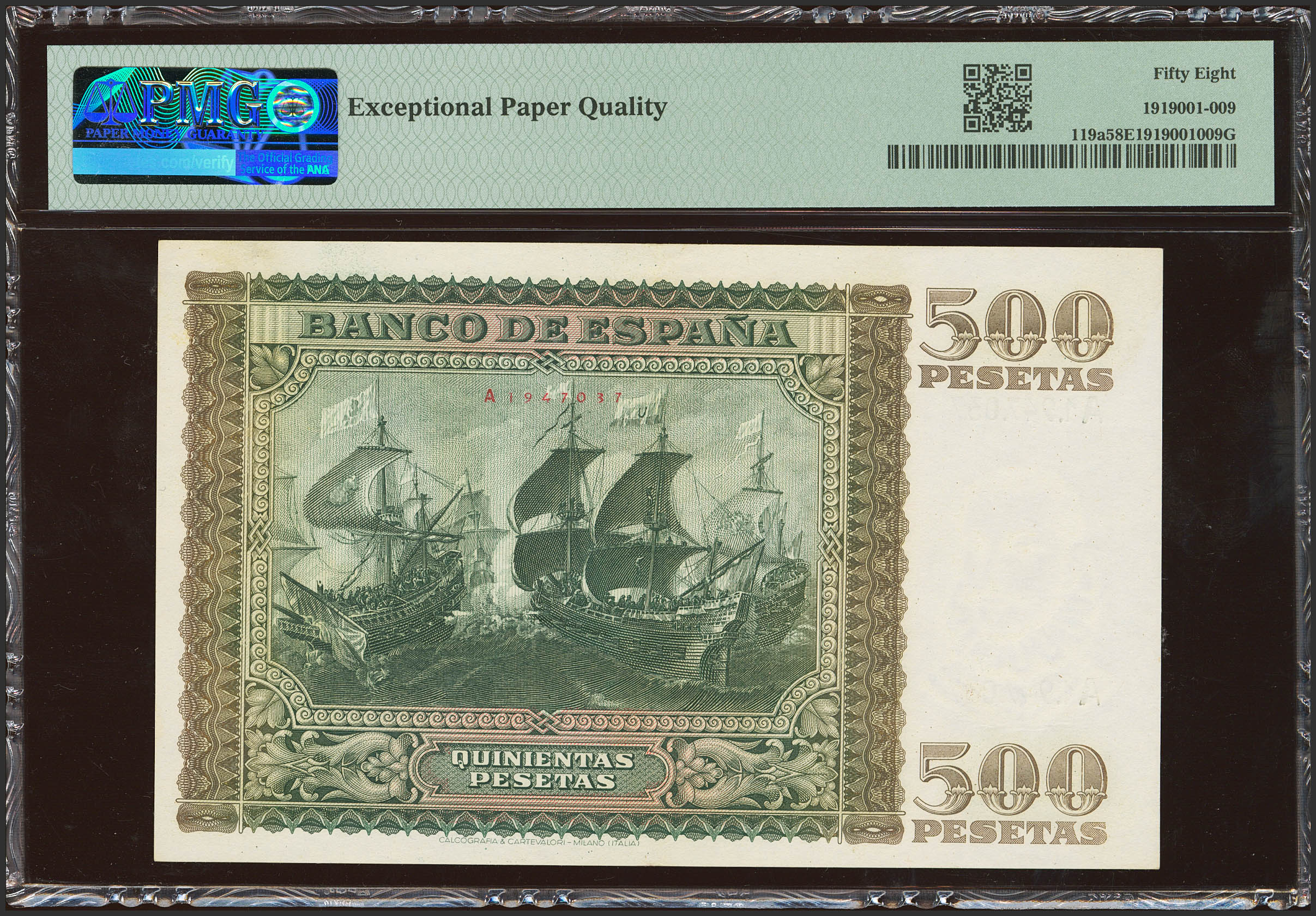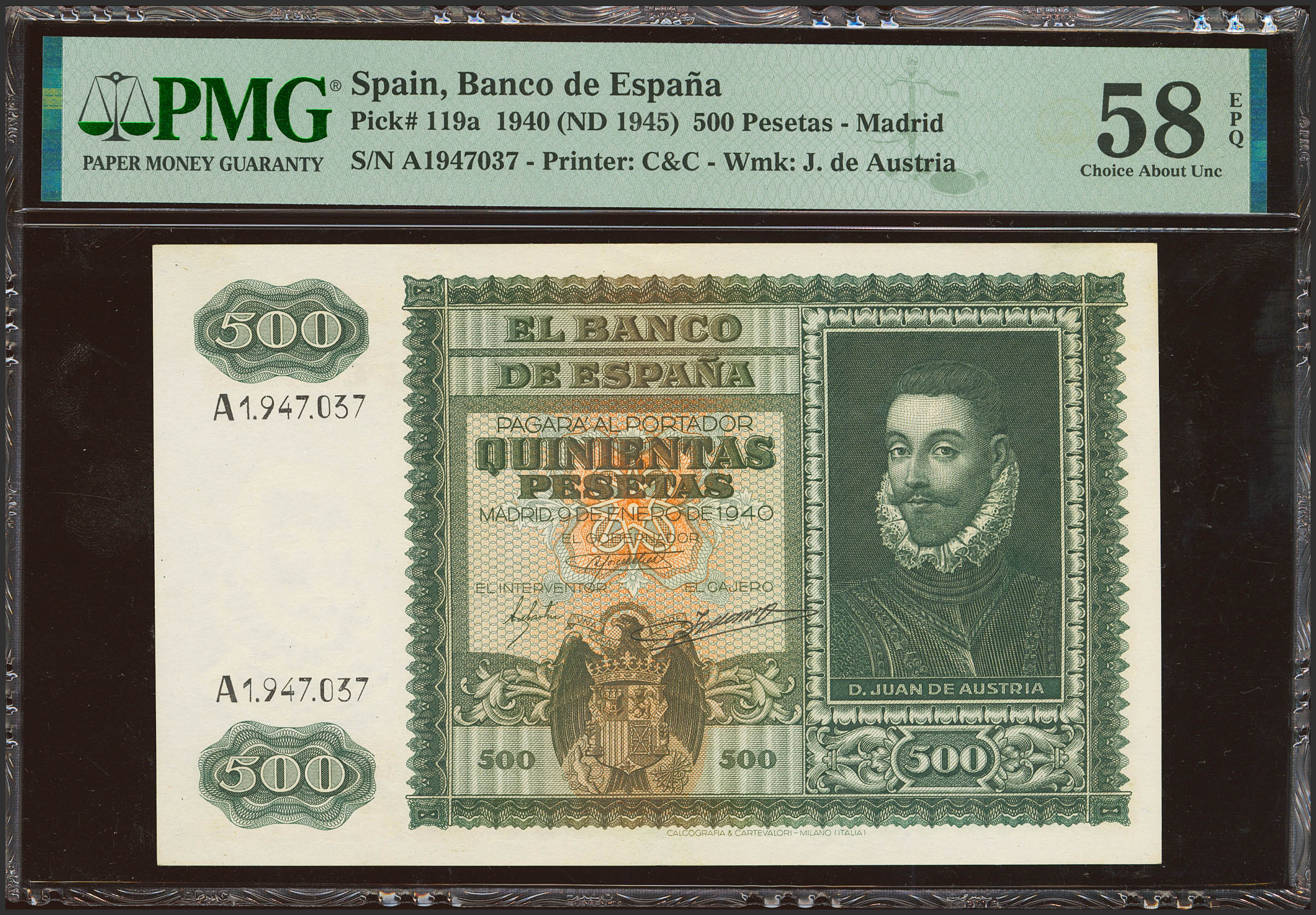 English 500 Pesetas. January 9, 1940. Series A. (Edifil 2021: 439, Pick: 119a). Rare in this quality, original marking. Good Extremely Fine++. Encapsulated PMG58EPQ.