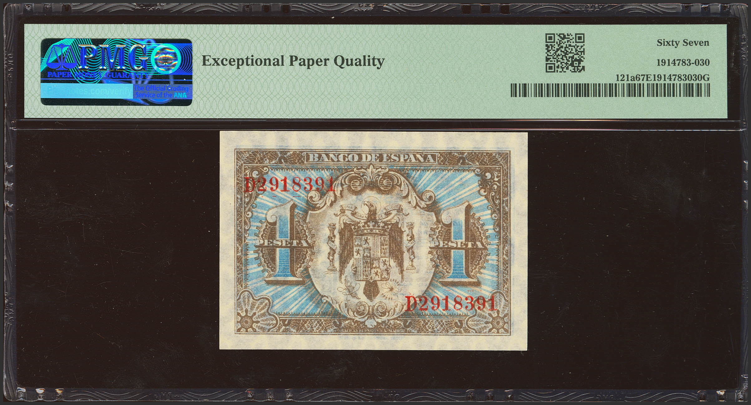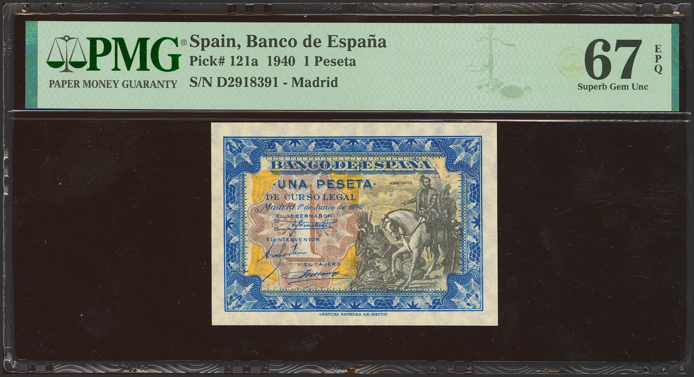 1 Peseta. June 1, 1940. Series D. (Edifil 2023: 441a, Pick: 121a). Rare in this exceptional quality, original marking. Uncirculated. Encapsulated PMG67EPQ.