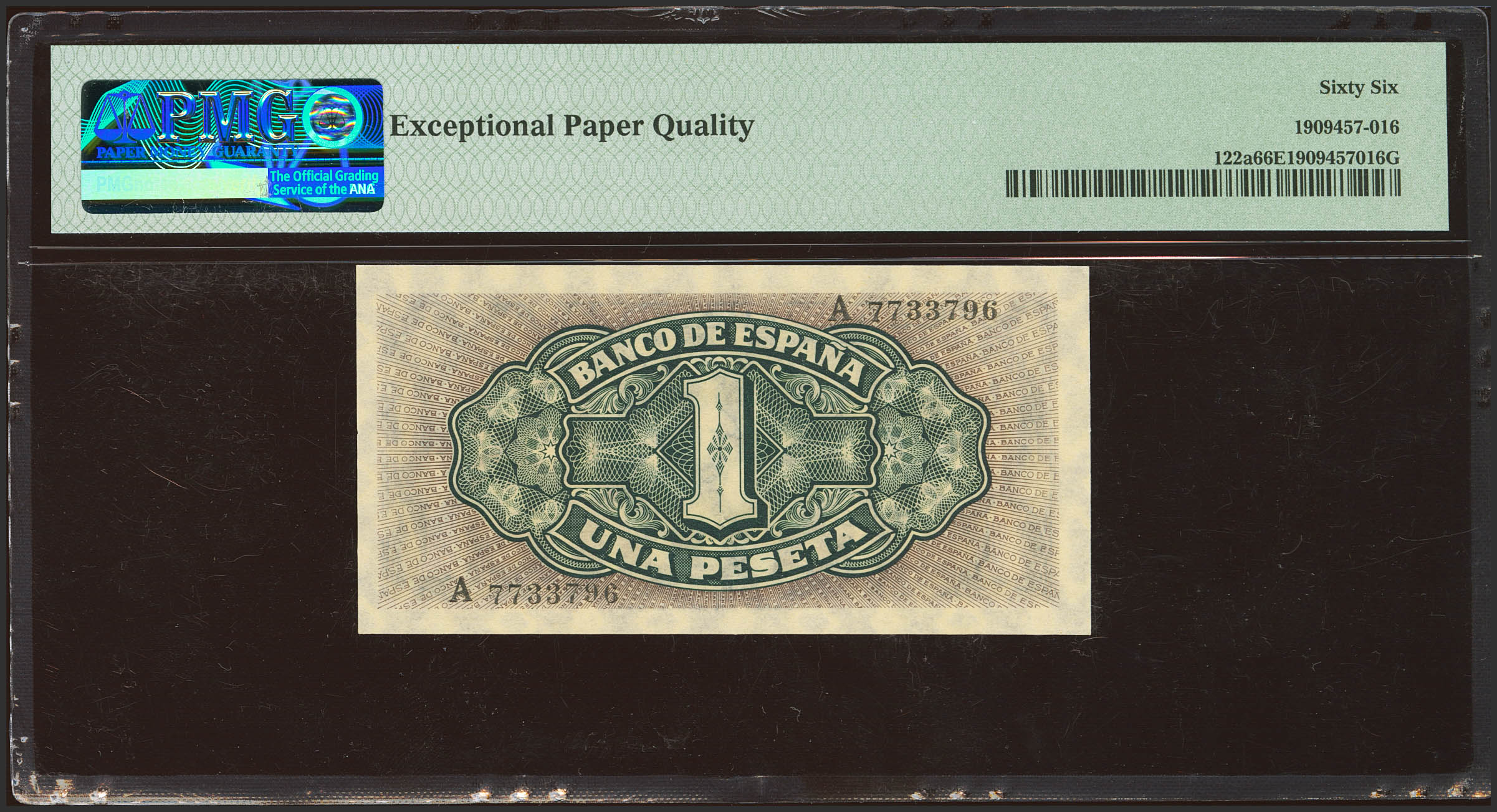 1 Peseta. September 4, 1940. Series A. (Edifil 2023: 442a, Pick: 122a). Rare in this quality, original finish. Uncirculated. Encapsulated PMG66EPQ.