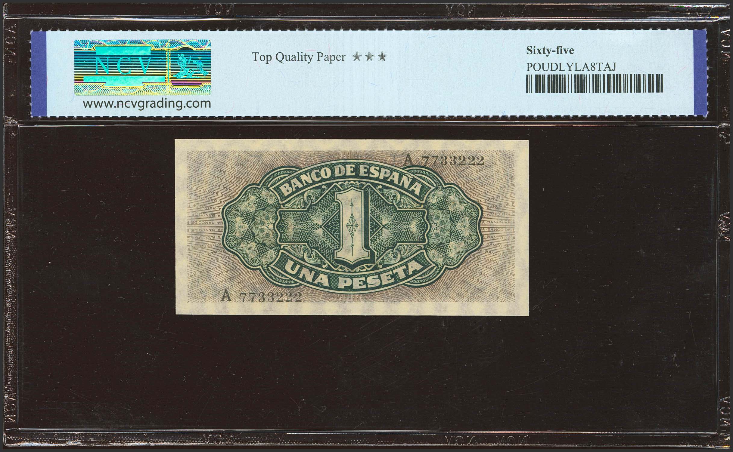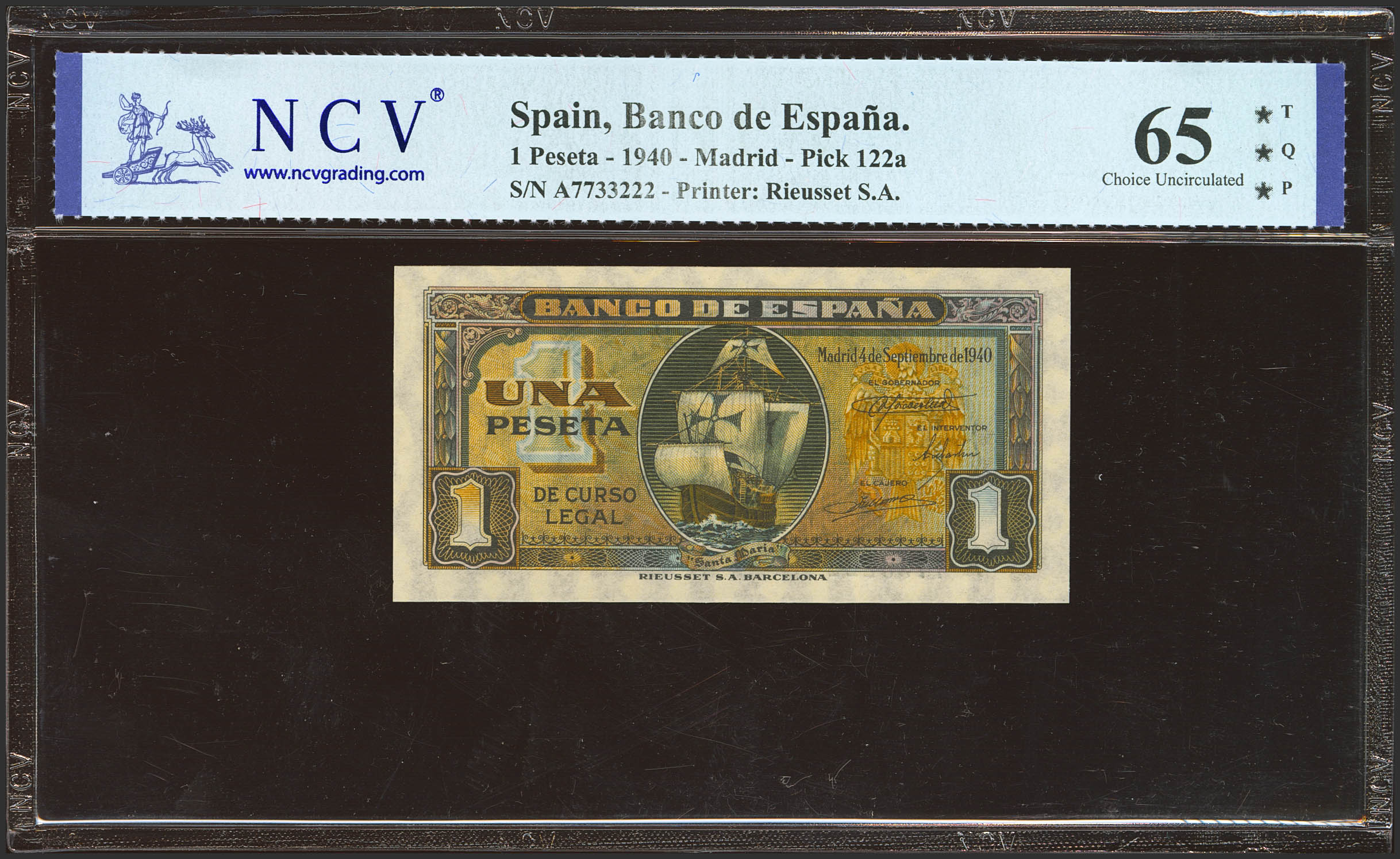 1 Peseta. September 4, 1940. Series A. (Edifil 2023: 442a, Pick: 122a). Rare in this quality, original finish. Uncirculated. Encapsulated PMG65EPQ.