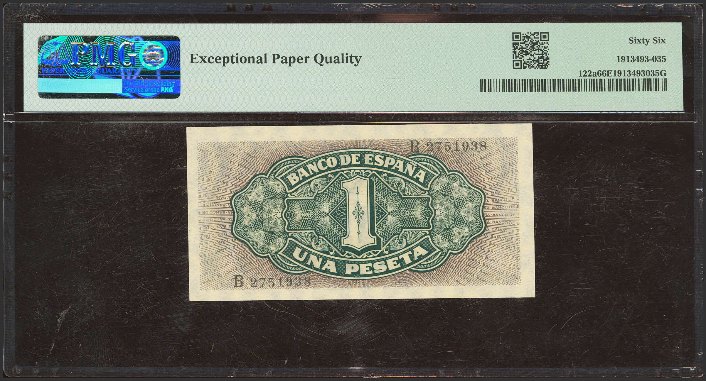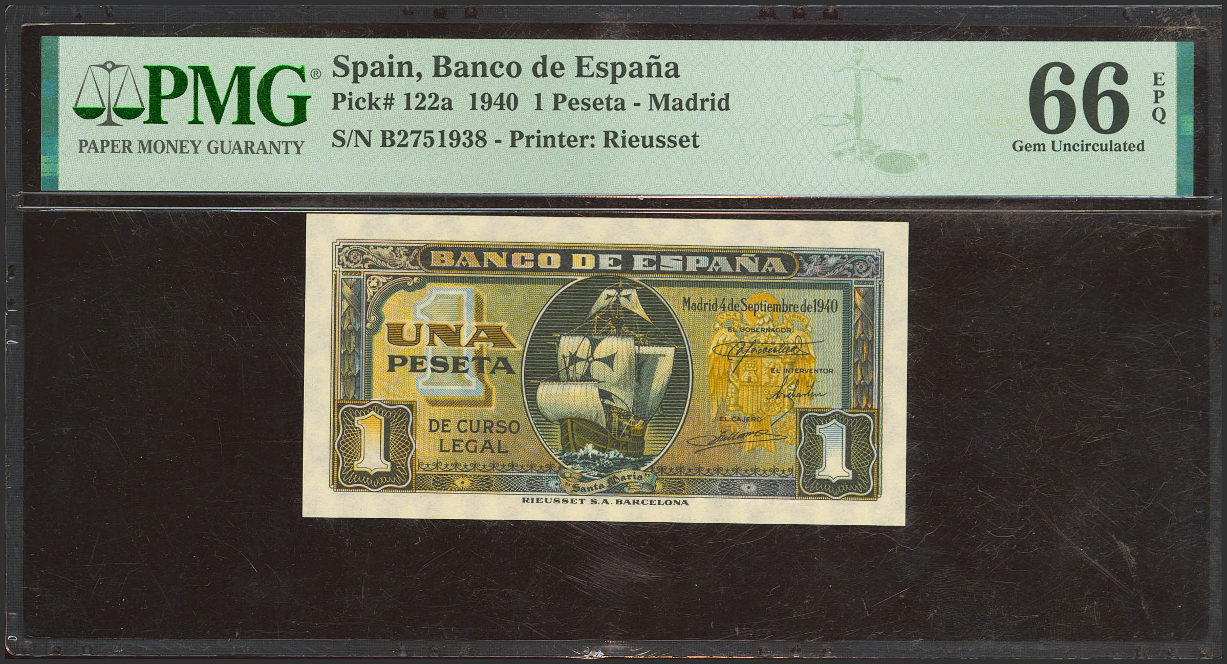 1 Peseta. September 4, 1940. Series B. (Edifil 2021: 442a, Pick: 122a). Rare in this quality, original finish. Uncirculated. Encapsulated PMG66EPQ.