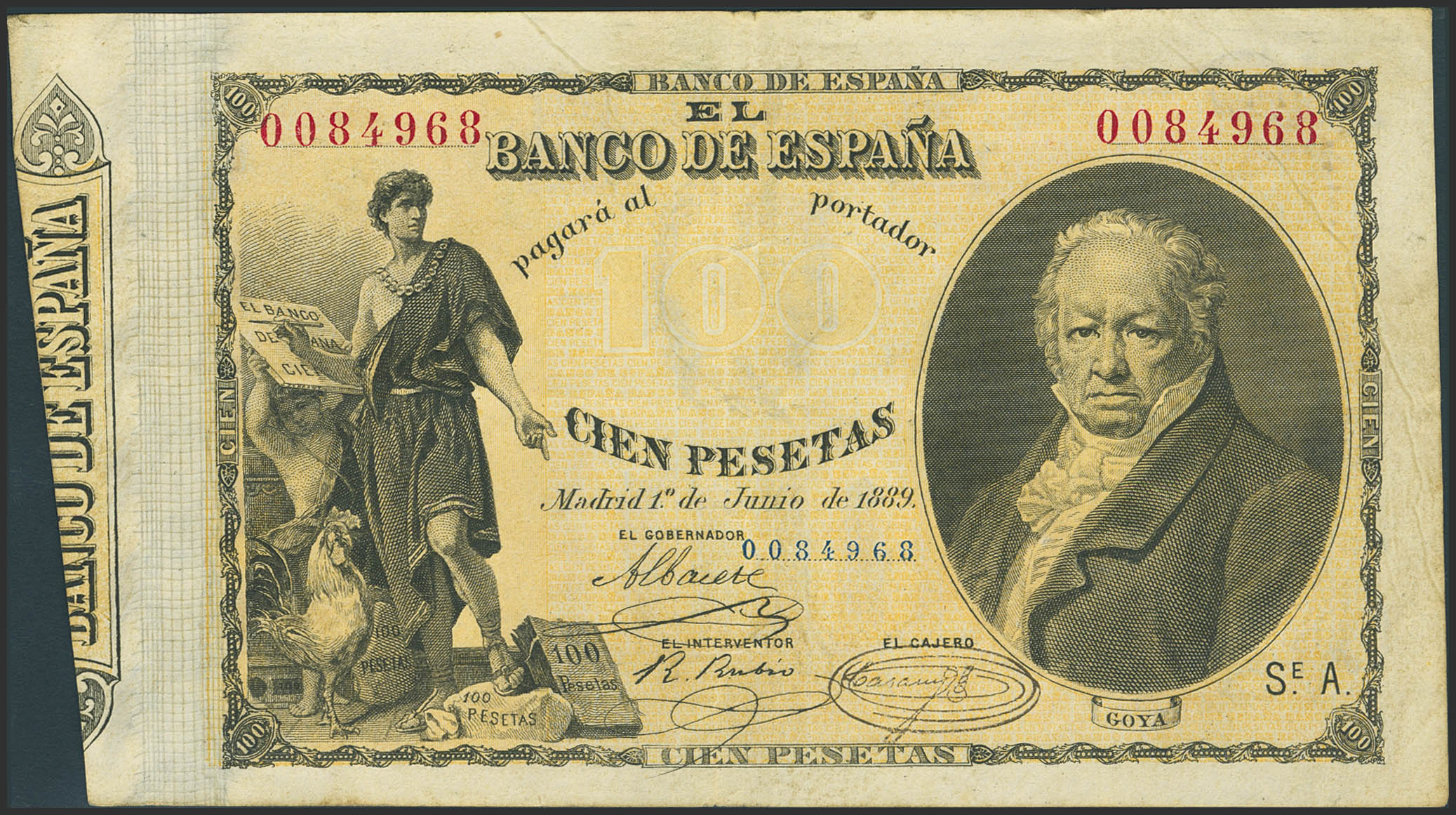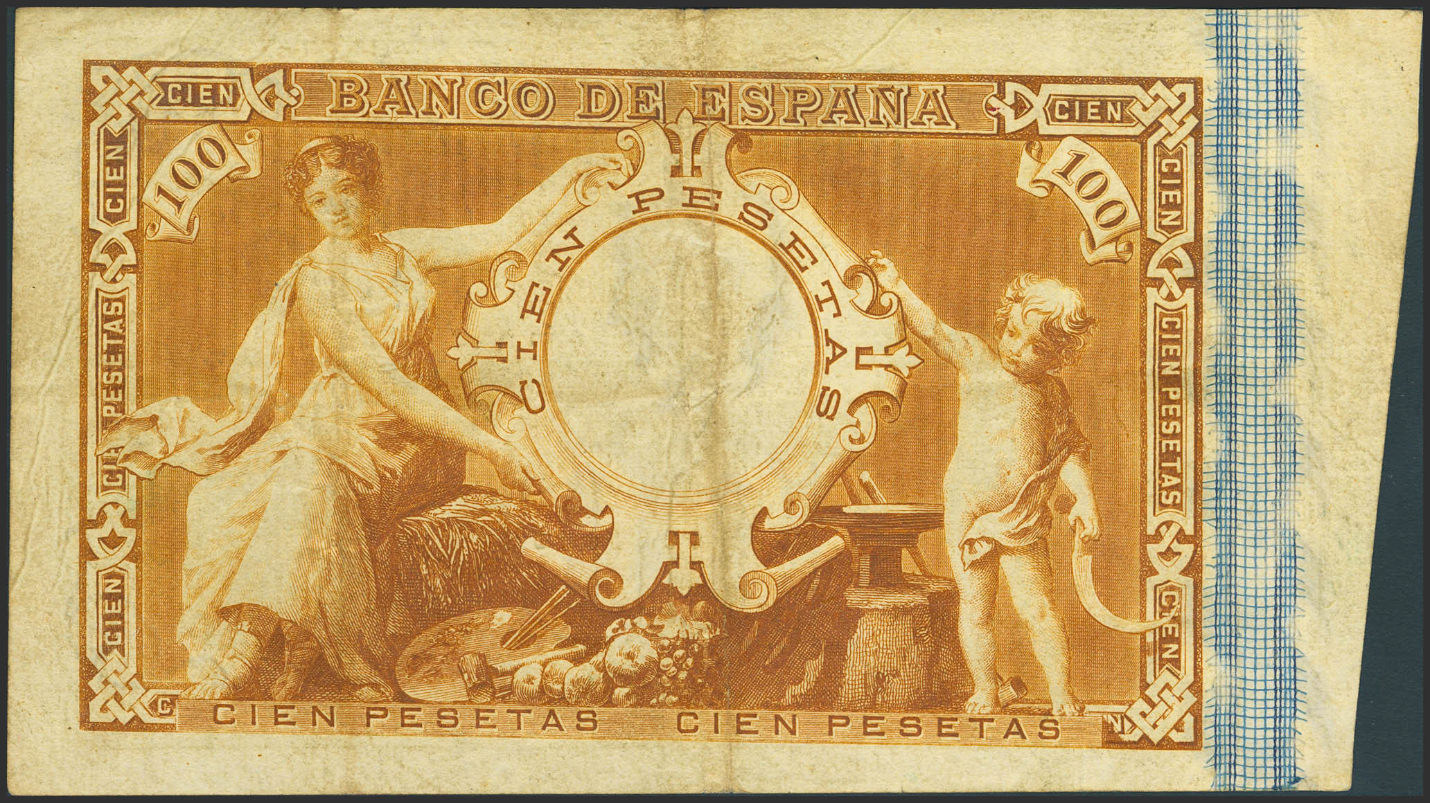 100 Pesetas. June 1, 1889. Series A. (Edifil 2023: 299). Very rare, especially without repairs. VF.