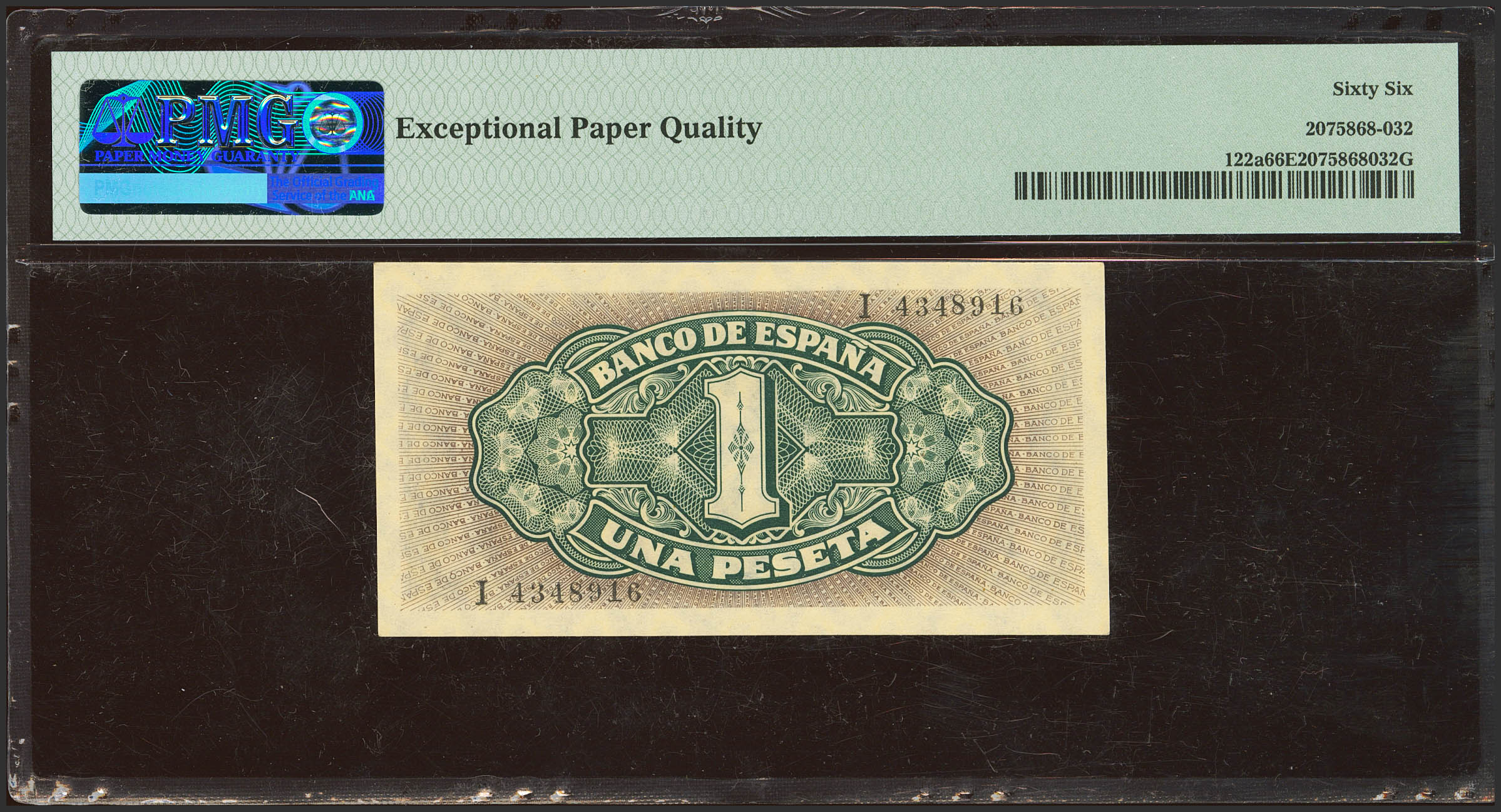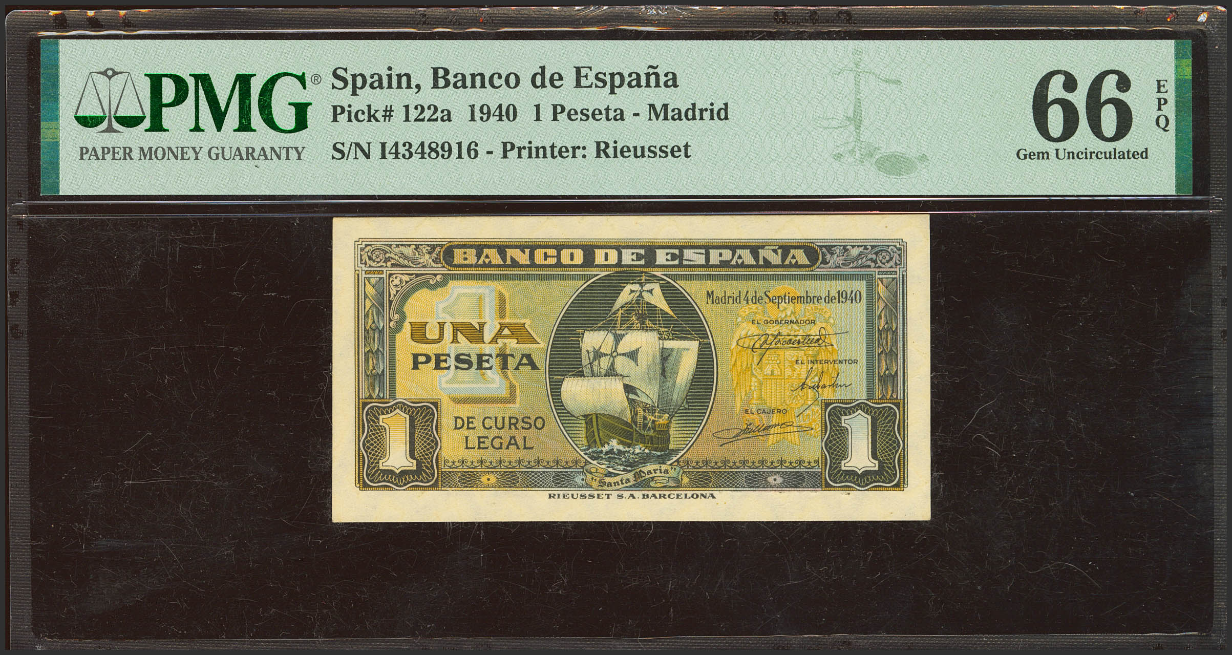1 Pesetas. September 4, 1940. Series I, last series issued. (Edifil 2023: 442b, Pick: 122a). Unusual in this quality, original finish. Uncirculated. Encapsulated PMG66EPQ.