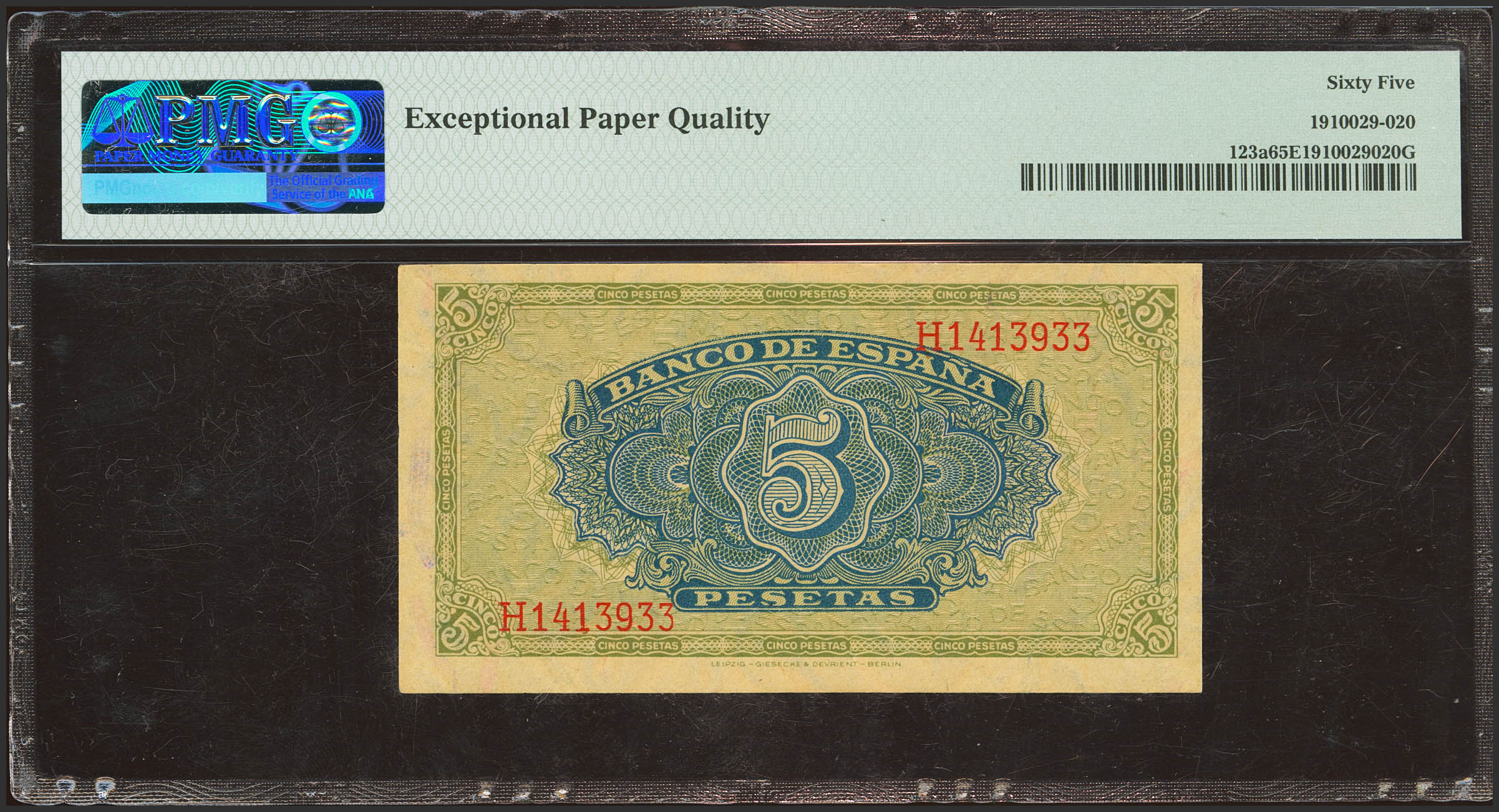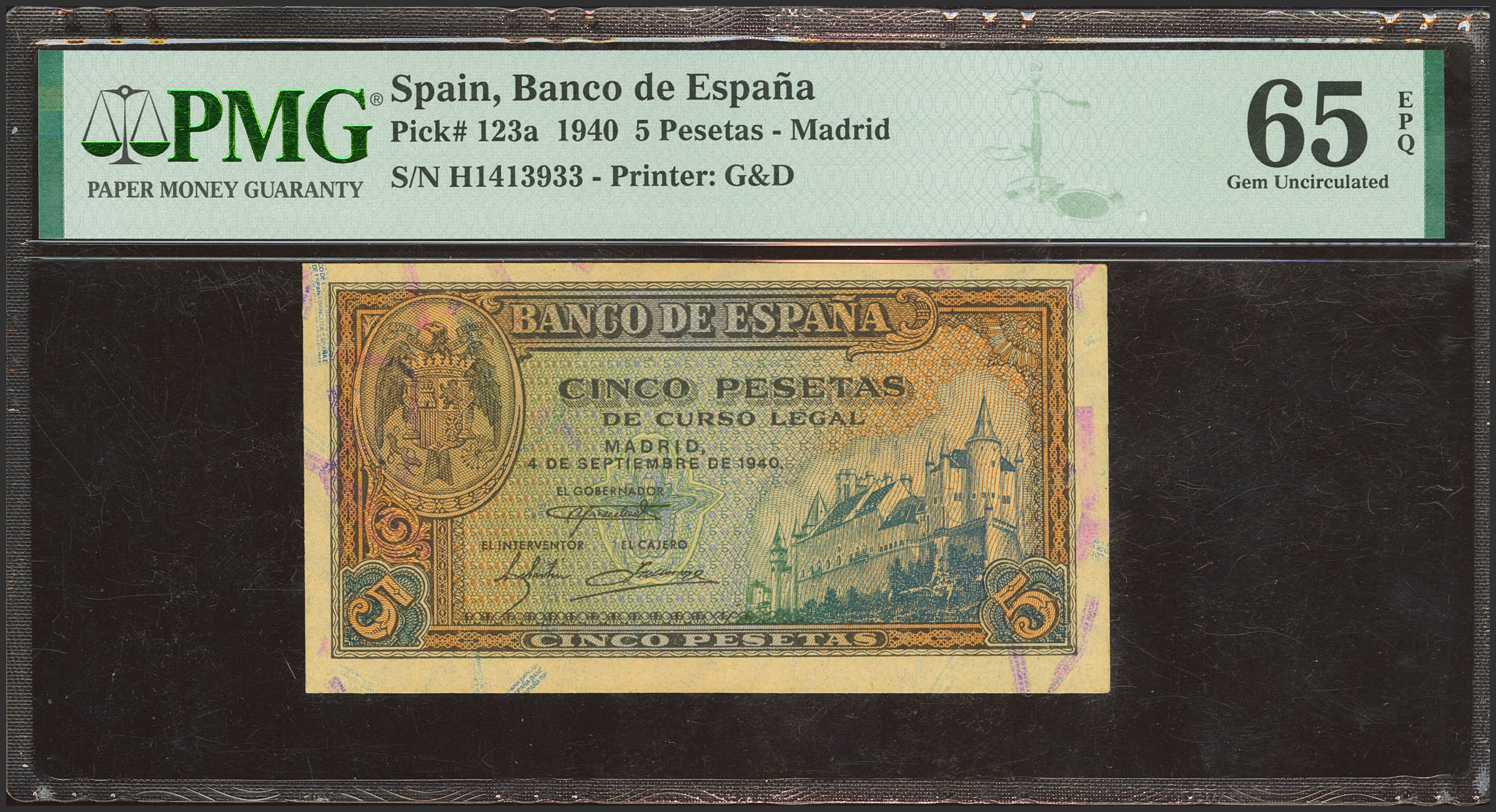 English 5 Pesetas. September 4, 1940. Series H. (Edifil 2021: 443a, Pick: 123a). Unusual in this quality, it retains all its original finish. Uncirculated. Encapsulated PMG65EPQ.