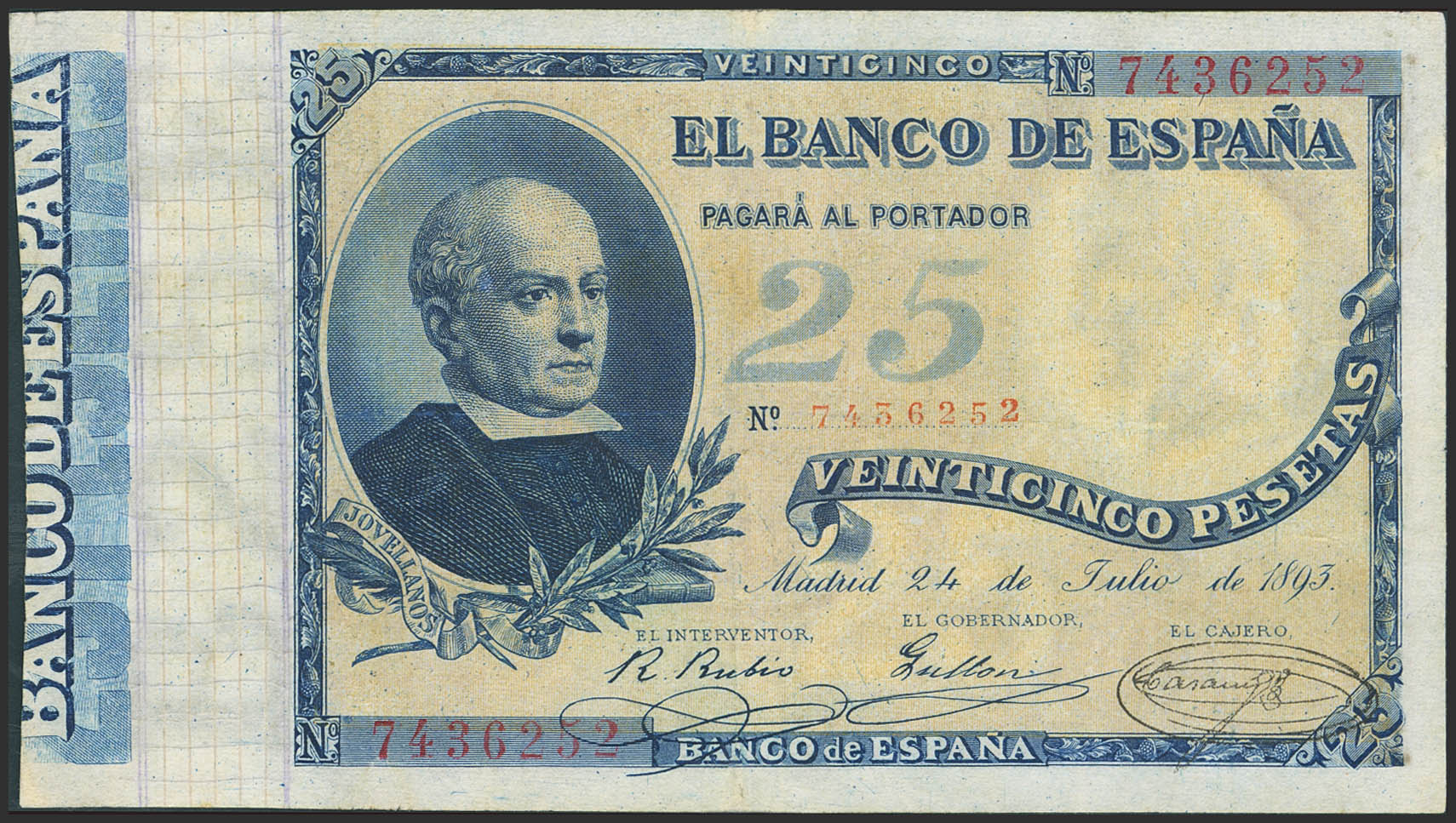 25 Pesetas. July 24, 1893. (Edifil 2023: 300). Rare, minimally repaired. VF+.