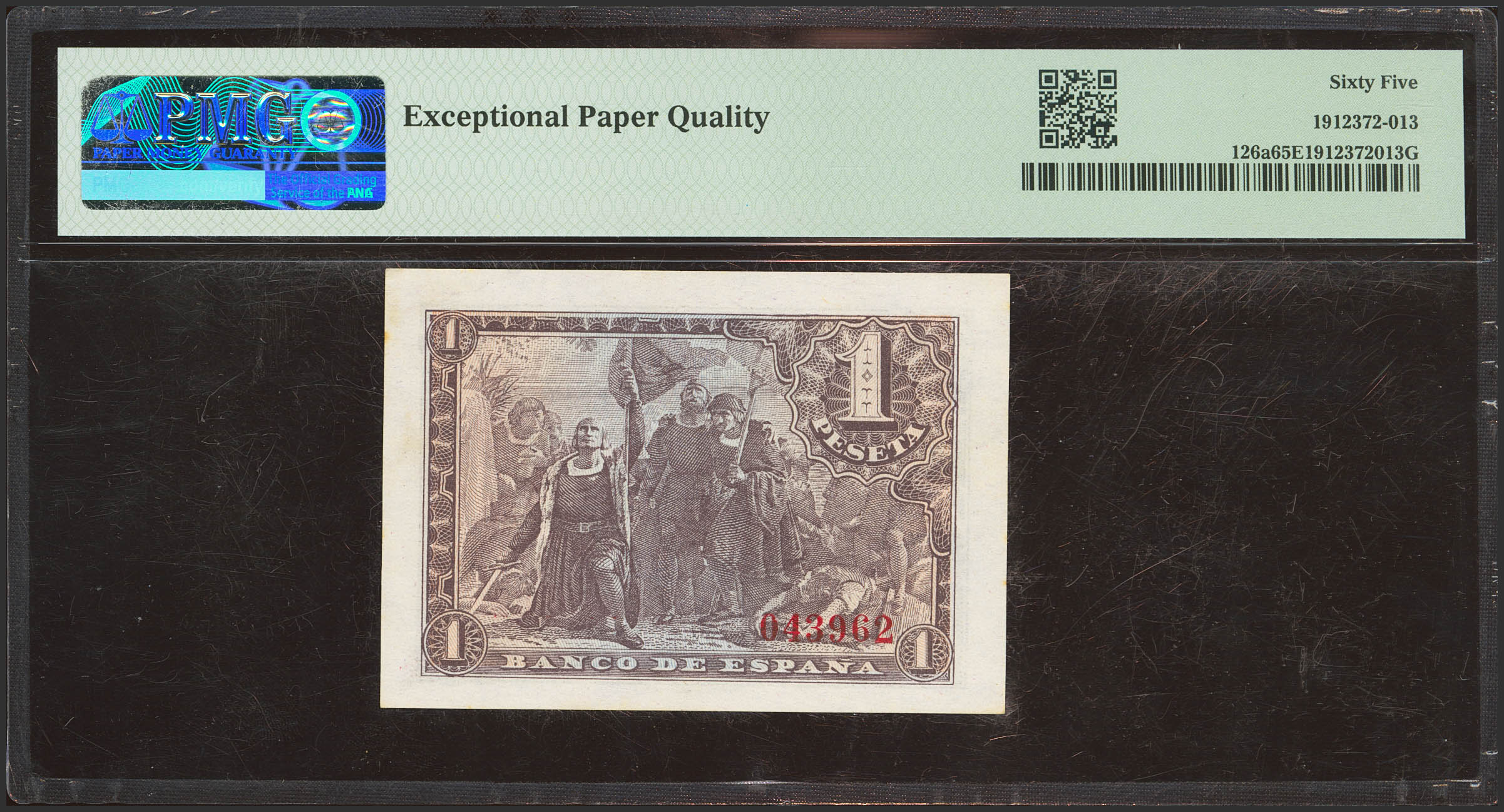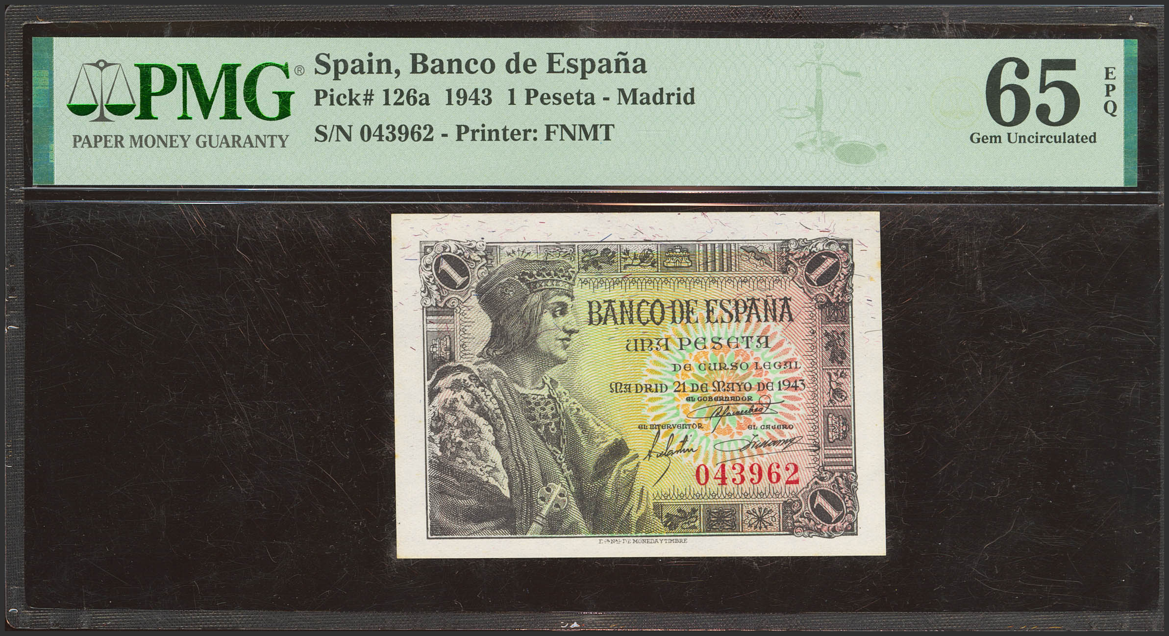 English 1 Peseta. May 21, 1943. No series. (Edifil 2023: 447, Pick: 126a). Rare in this quality, original finish. Uncirculated. Encapsulated PMG65EPQ