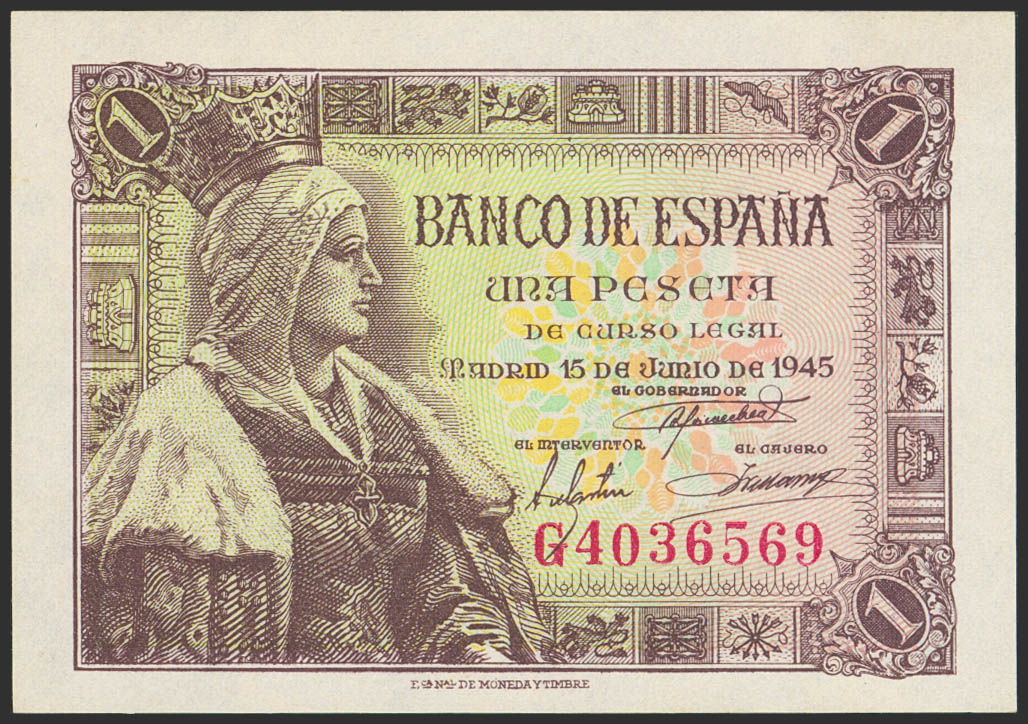 1 Peseta. June 15, 1945. Series G. (Edifil 2021: 448a). Original marking. Uncirculated.