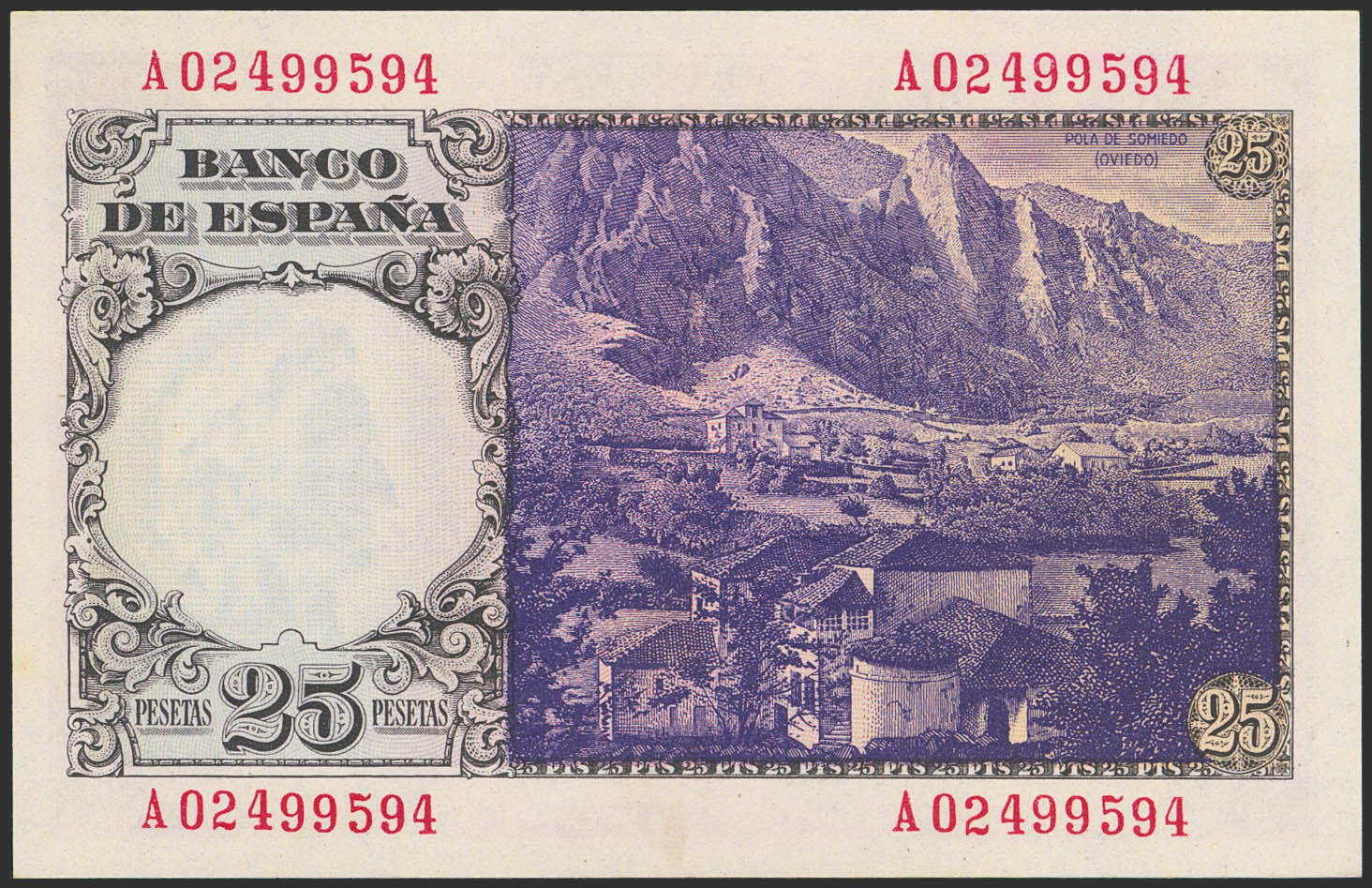 English 25 Pesetas. February 19, 1946. Series A. (Edifil 2023: 450a). Original marking. Good Extremely Fine++.