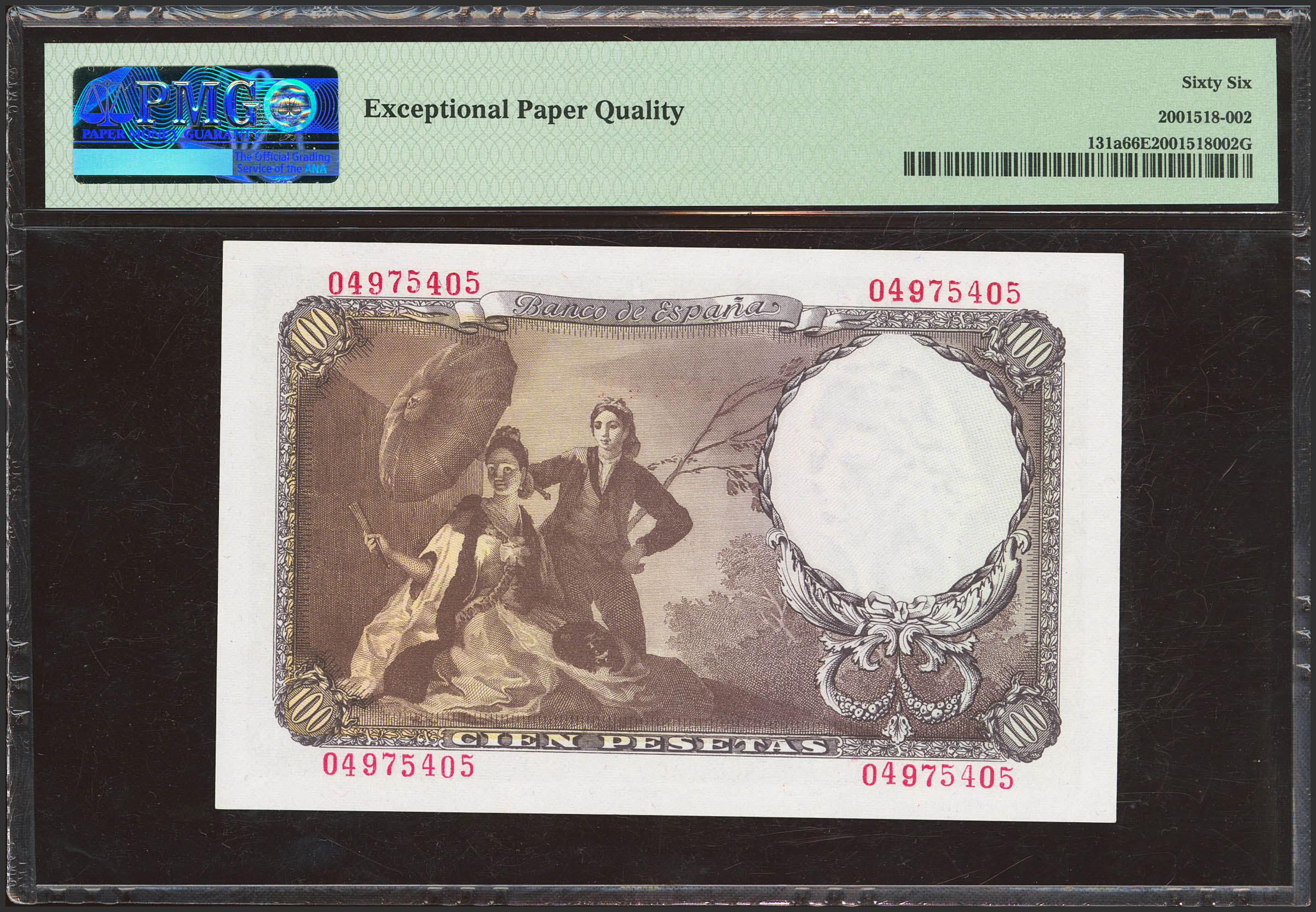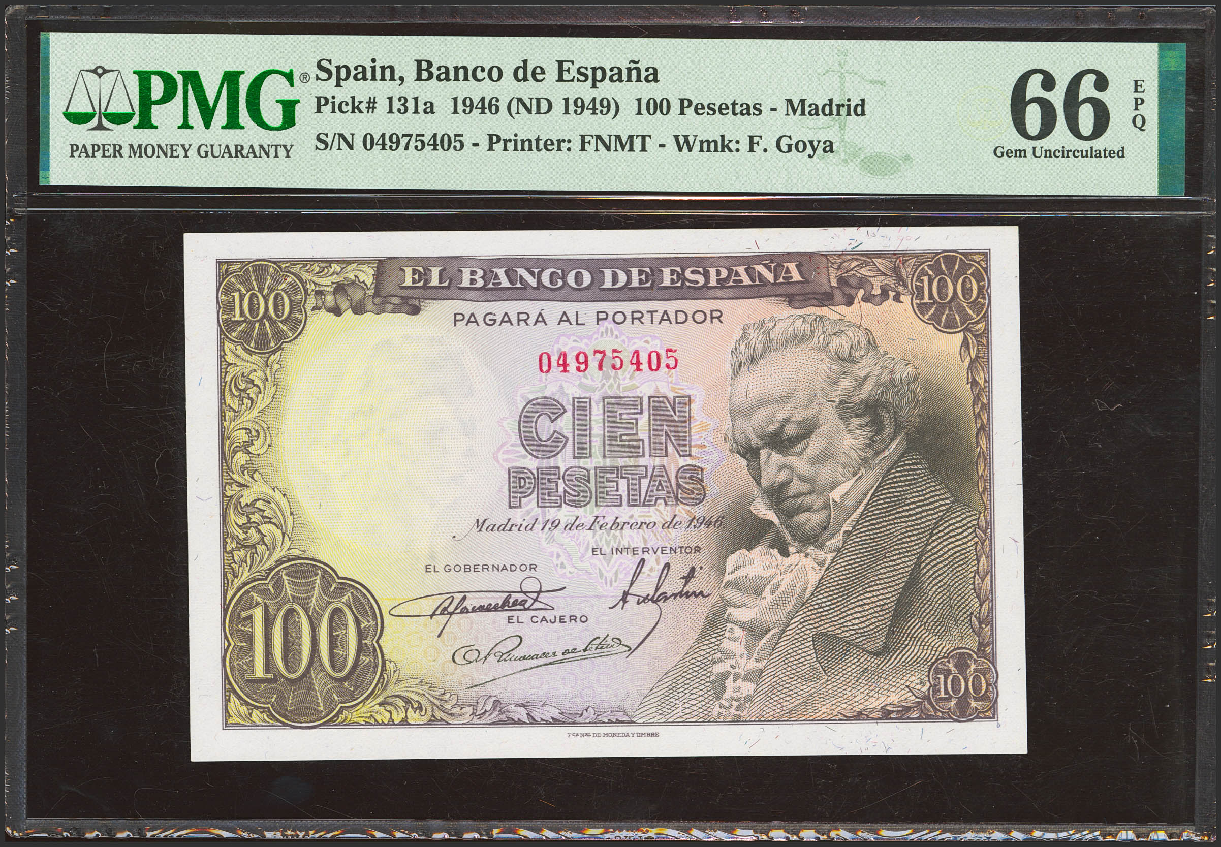 100 Pesetas. February 19, 1946. No series. (Edifil 2023: 451, Pick: 131a). Rare in this exceptional quality, original finish. Uncirculated. Encapsulated PMG66EPQ.