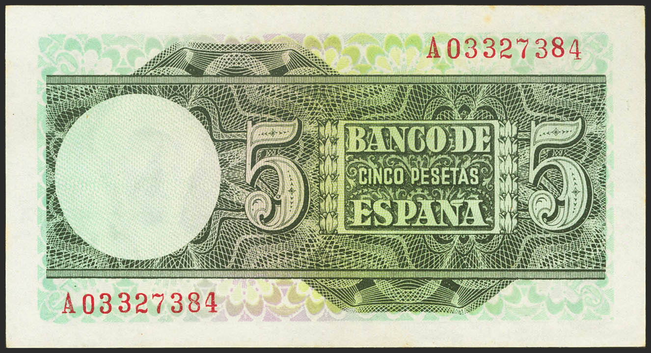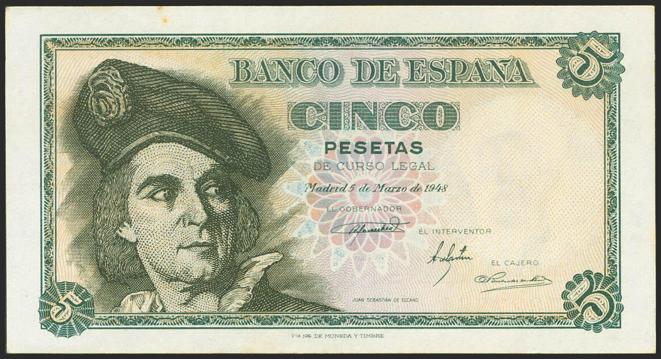 5 Pesetas. March 5, 1948. Series A. (Edifil 2021: 455a). Original marking and stains. Uncirculated-.
