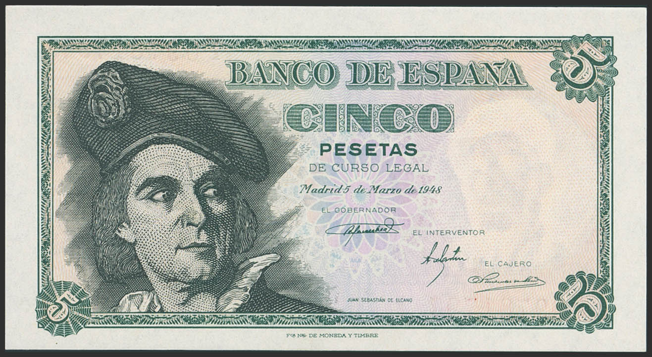 5 Pesetas. March 5, 1948. Series F. (Edifil 2023: 455a). Original marking. Uncirculated.