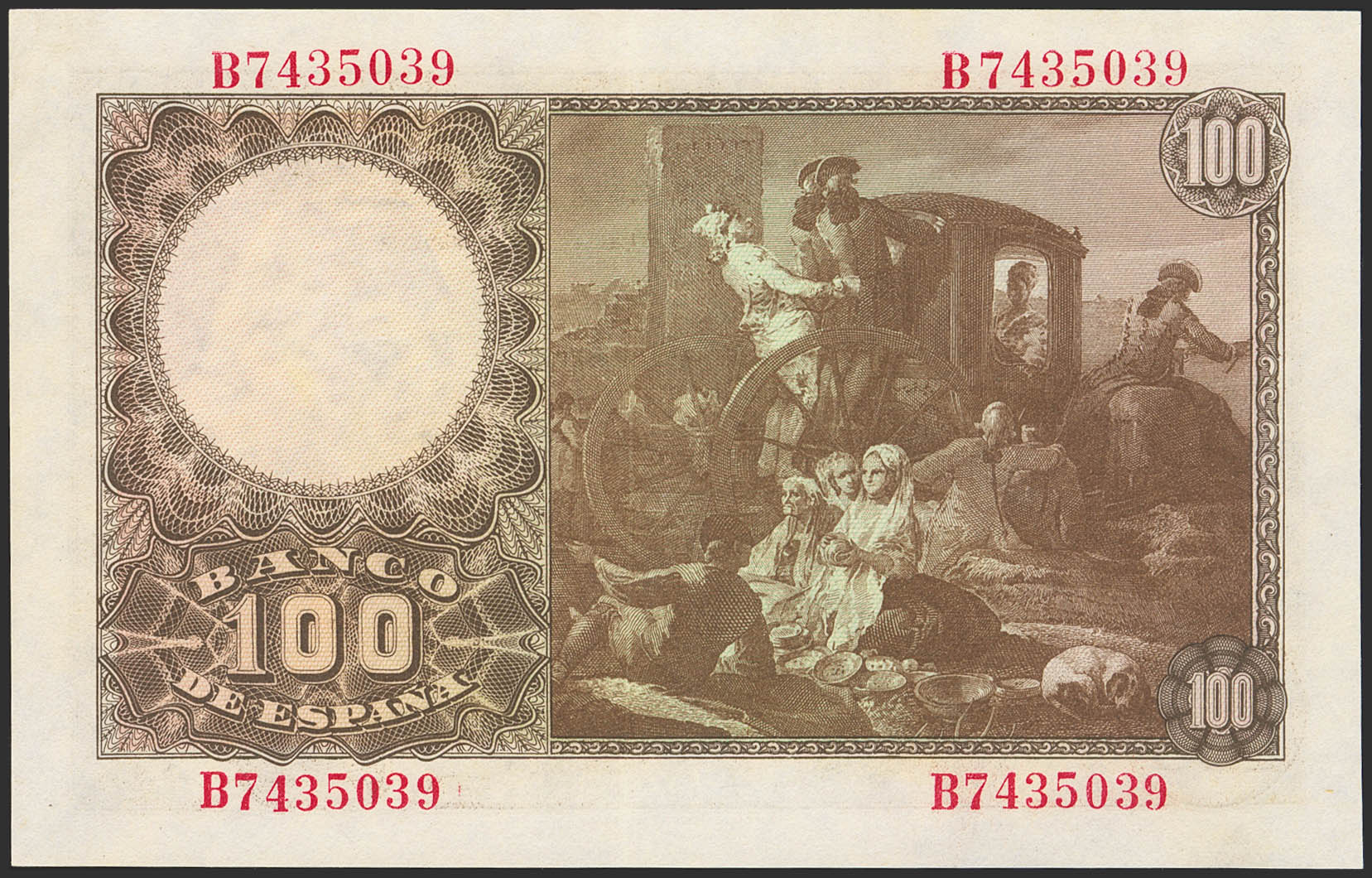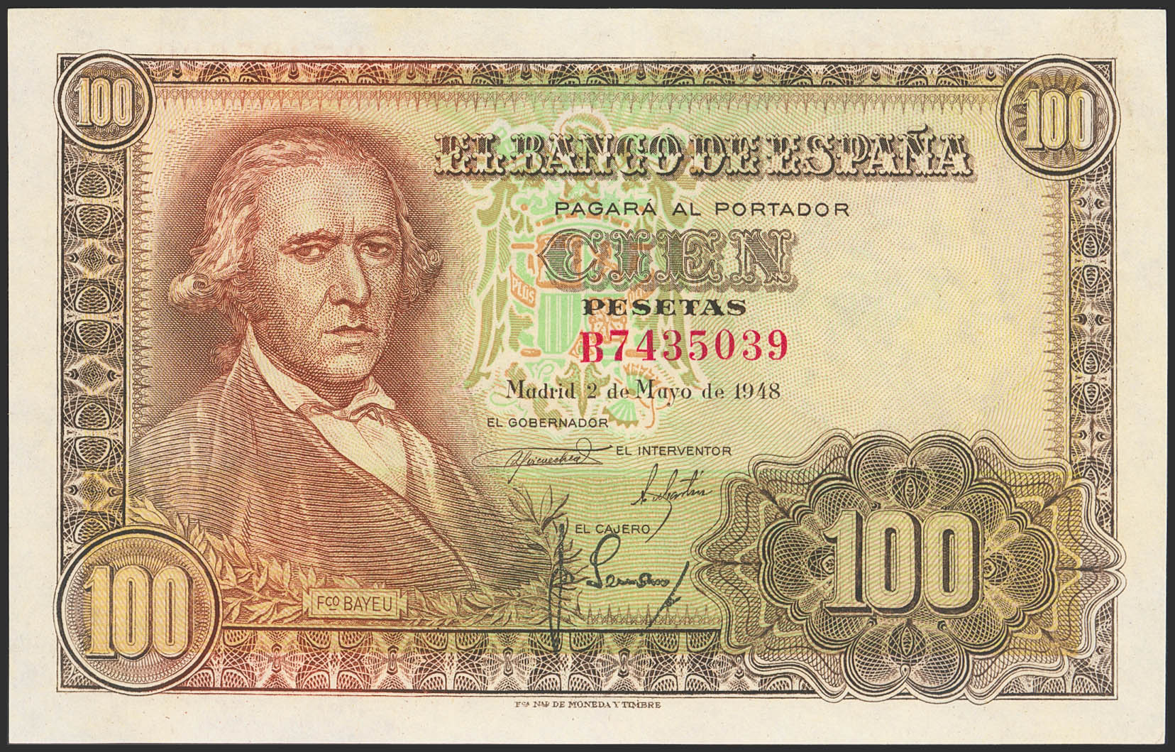 100 Pesetas. May 2, 1948. Series B. (Edifil 2023: 456a). Retains part of its original finish. Good Extremely Fine.