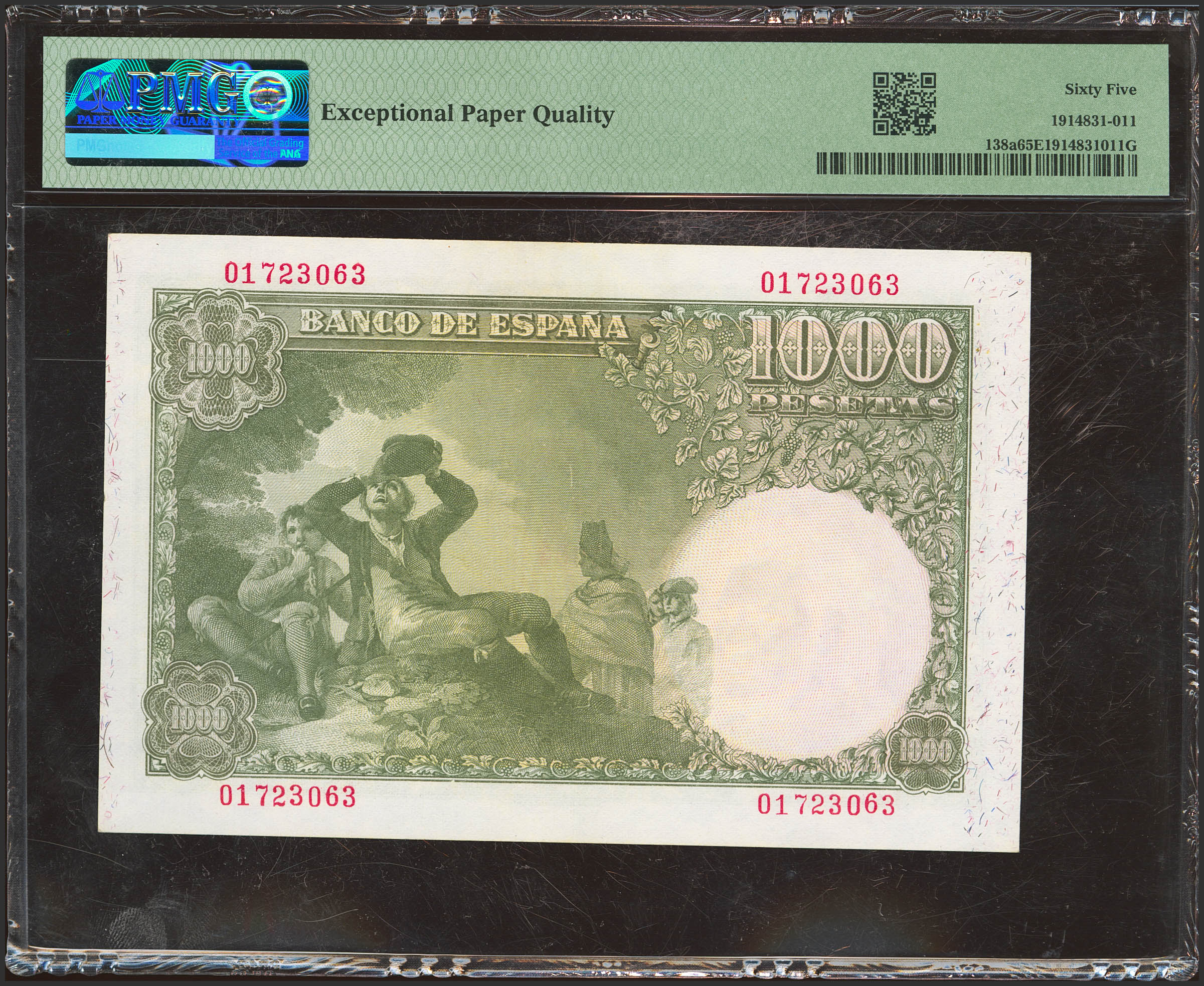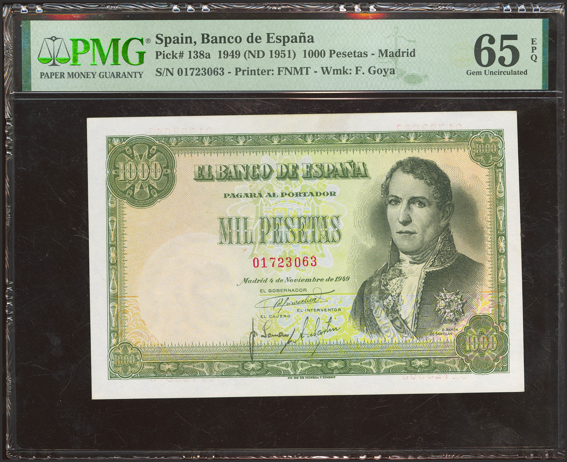 1000 Pesetas. November 4, 1949. No series. (Edifil 2021: 458, Pick: 138a). Very rare in this exceptional quality, original finish. Uncirculated. Encapsulated PMG65EPQ.