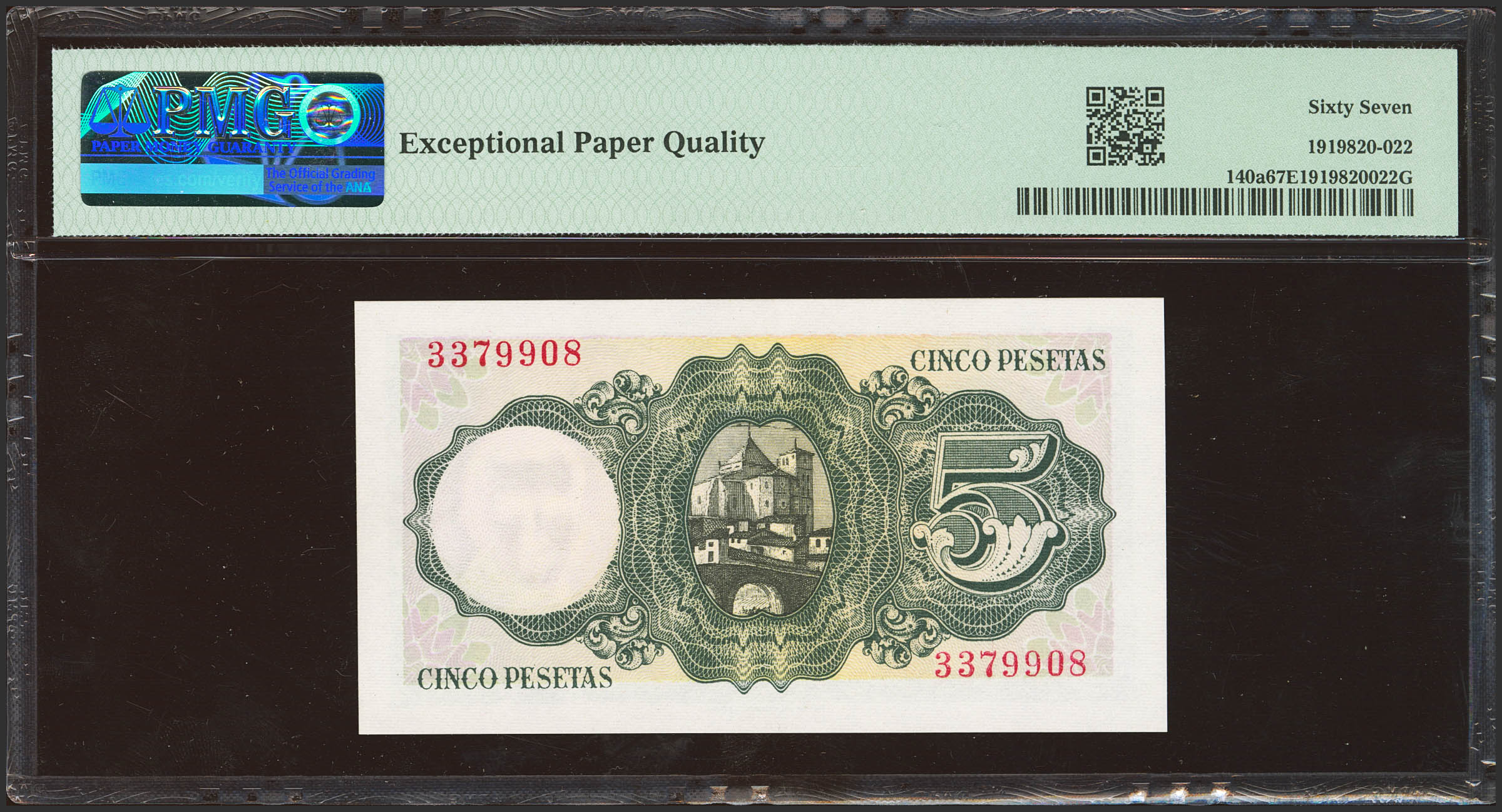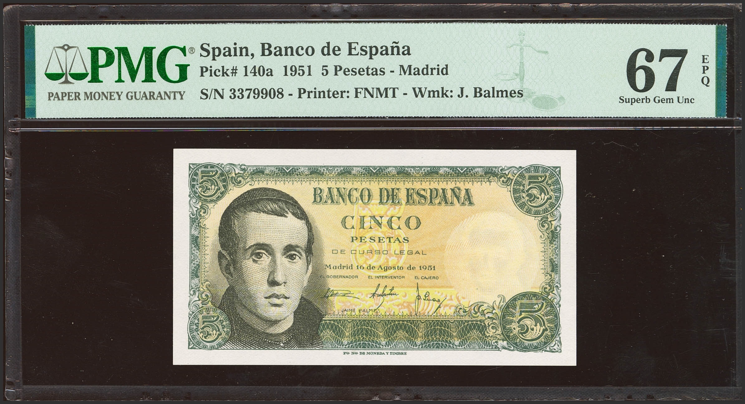 5 Pesetas. August 16, 1951. No series. (Edifil 2023: 459, Pick: 140a). Rare in this quality, original finish. Uncirculated. Encapsulated PMG67EPQ.