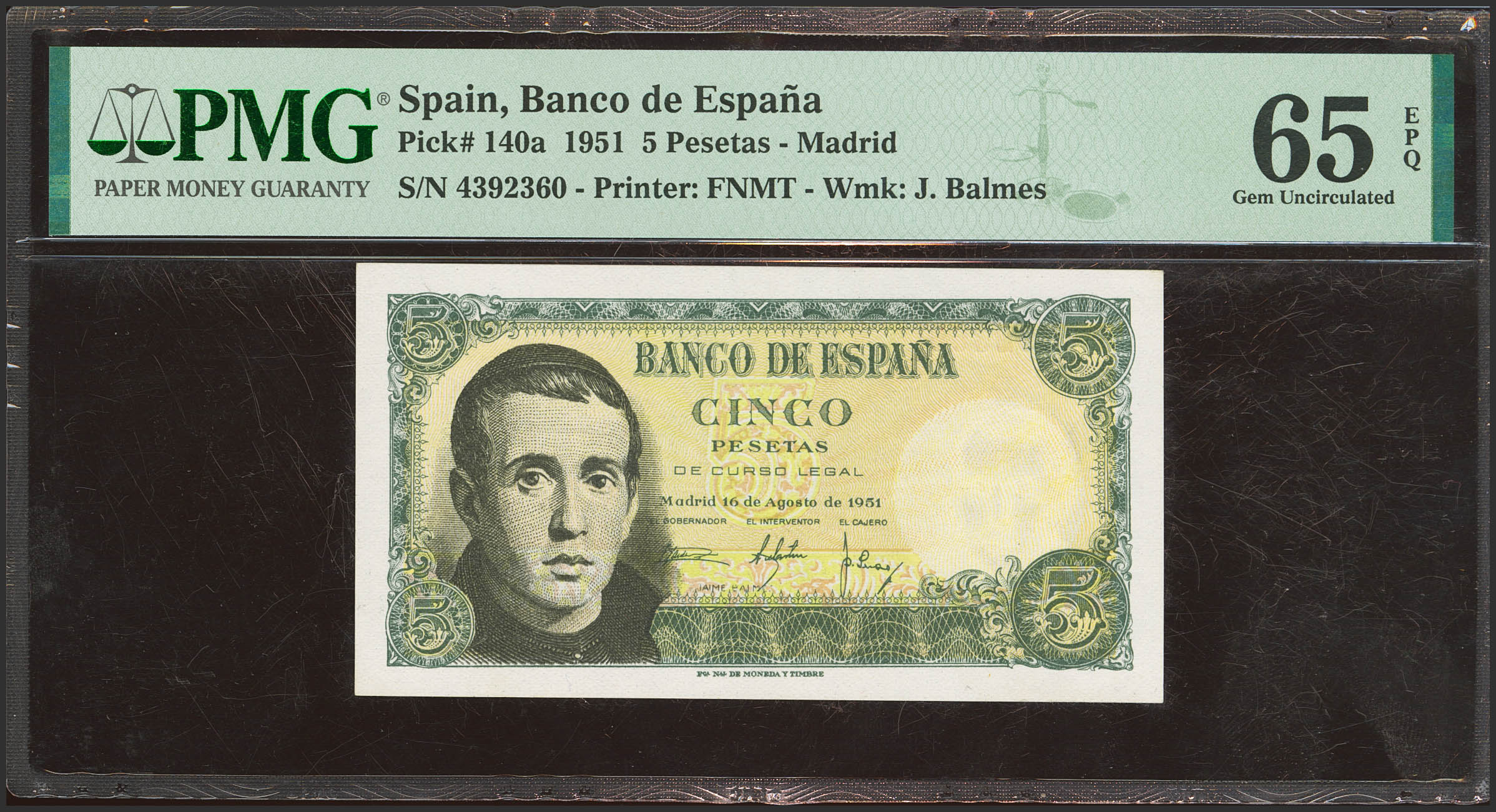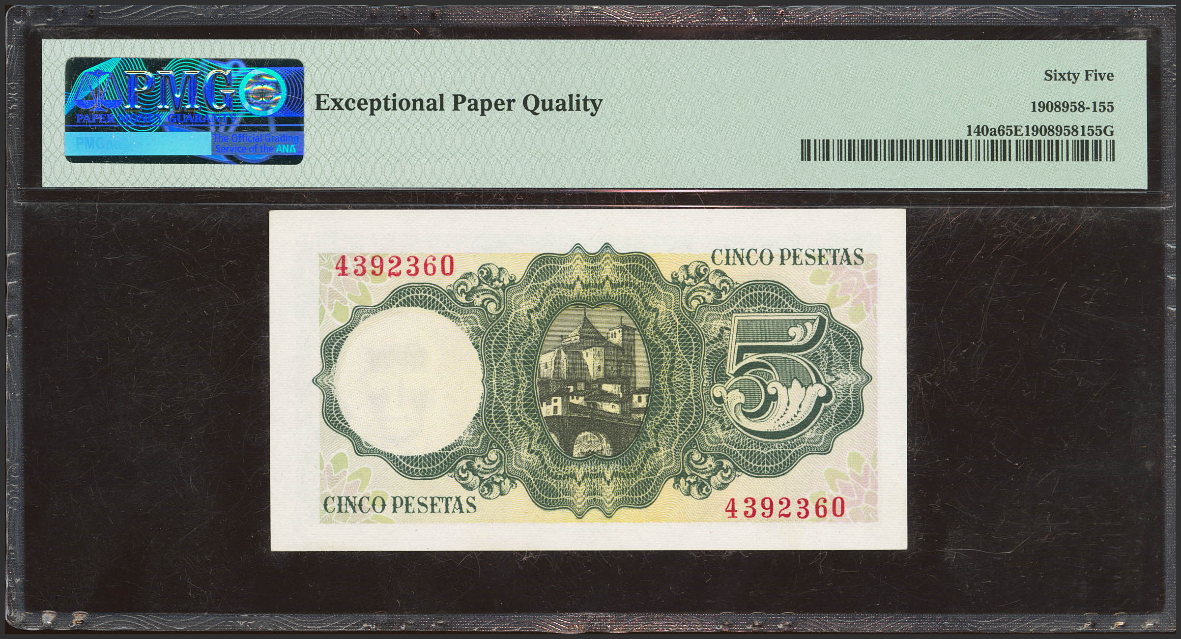 5 Pesetas. August 16, 1951. No series. (Edifil 2023: 459, Pick: 140a). Original marking. Uncirculated. Encapsulated PMG65EPQ.