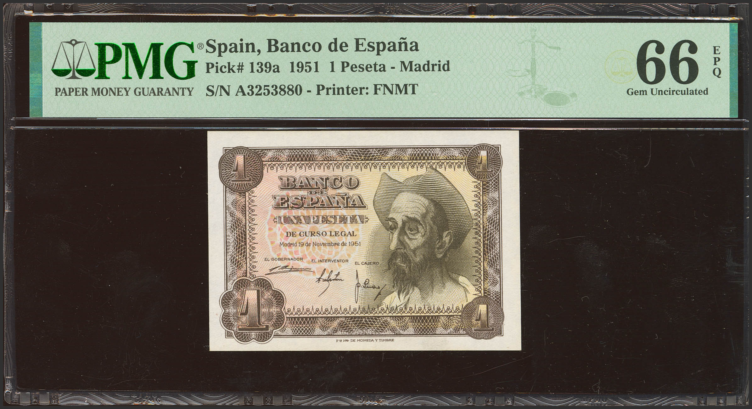 1 Peseta. November 19, 1951. Series A. (Edifil 2023: 461a, Pick: 139a). Original marking. Uncirculated. Encapsulated PMG66EPQ.