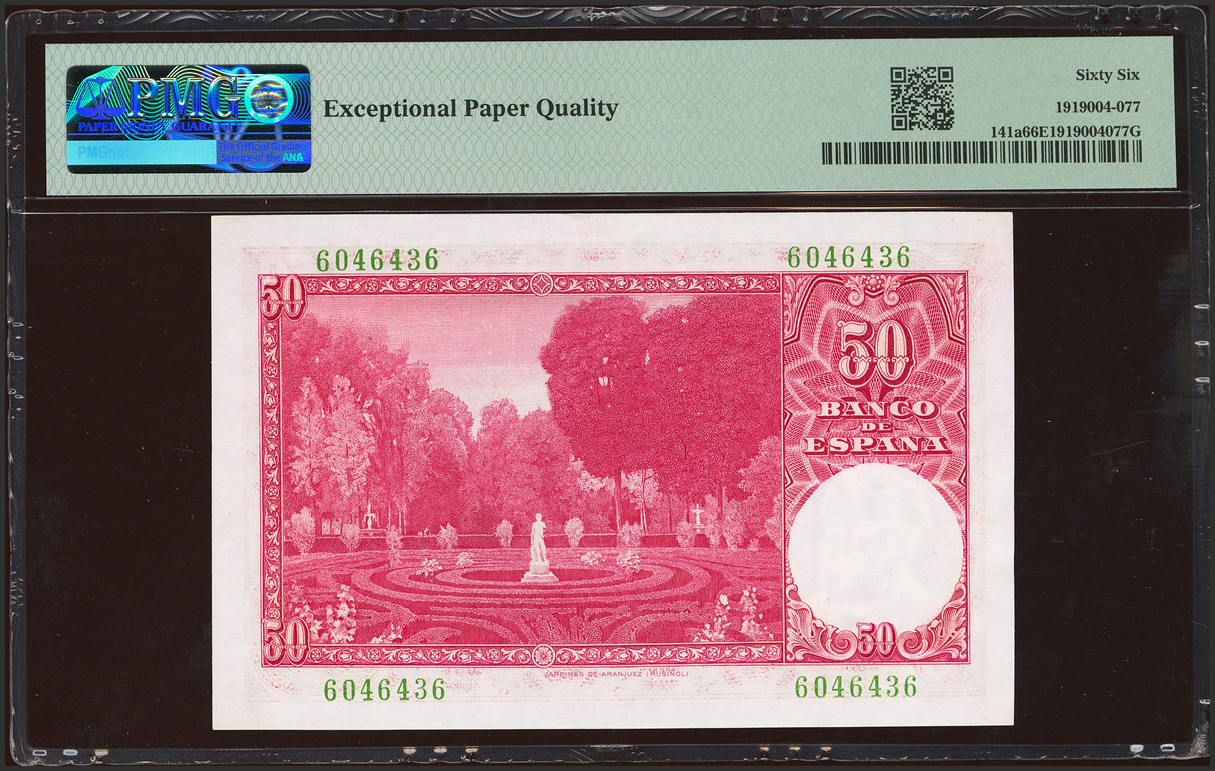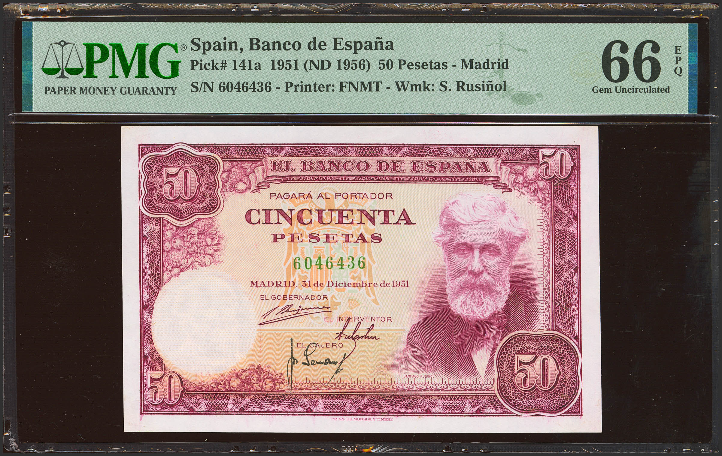 English 50 Pesetas. December 31, 1951. No series. (Edifil 2023: 462, Pick: 141a). Original marking. Uncirculated. Encapsulated PMG66EPQ.